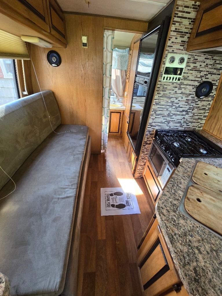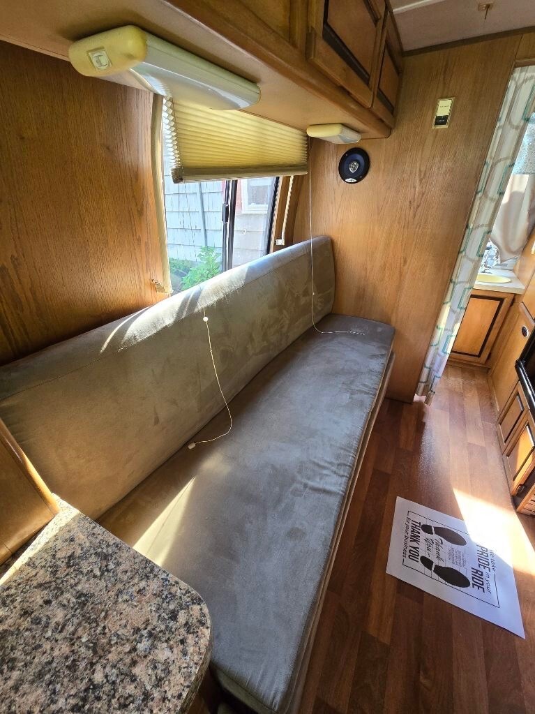 This GMC drives well, looks good, and is very easy to park. It’s quick and easy to transition to a camper upon arrival at your destination. There is a solar panel on the roof to add extra power at the camp site. Ragusa Step for easy entry. The full patio awning is great for relaxing outdoors. The updated Generac generator provides ample power to run the roof A/C, the microwave/convection oven, and/or other appliances when needed. The wood laminate floor is warm and inviting.