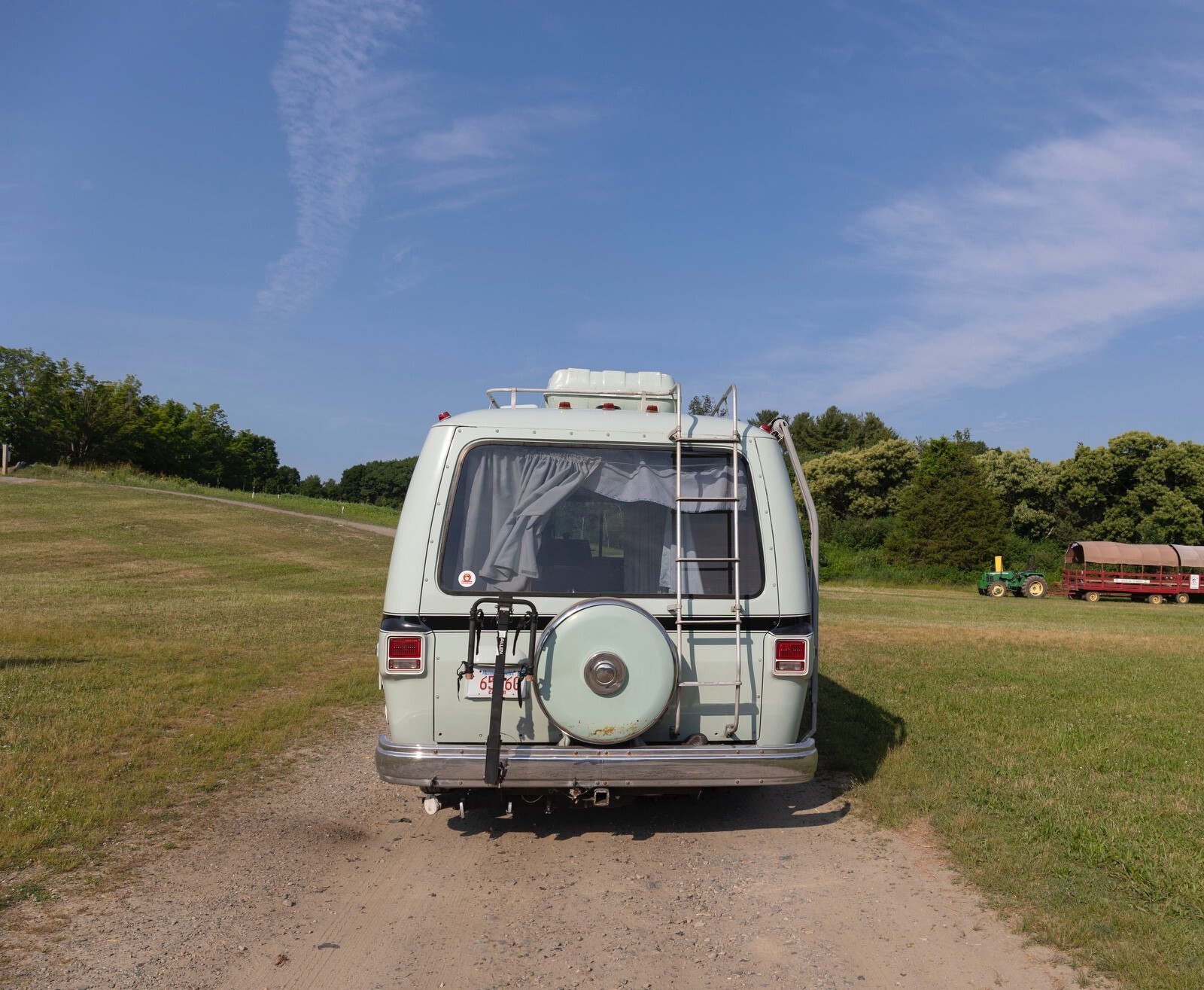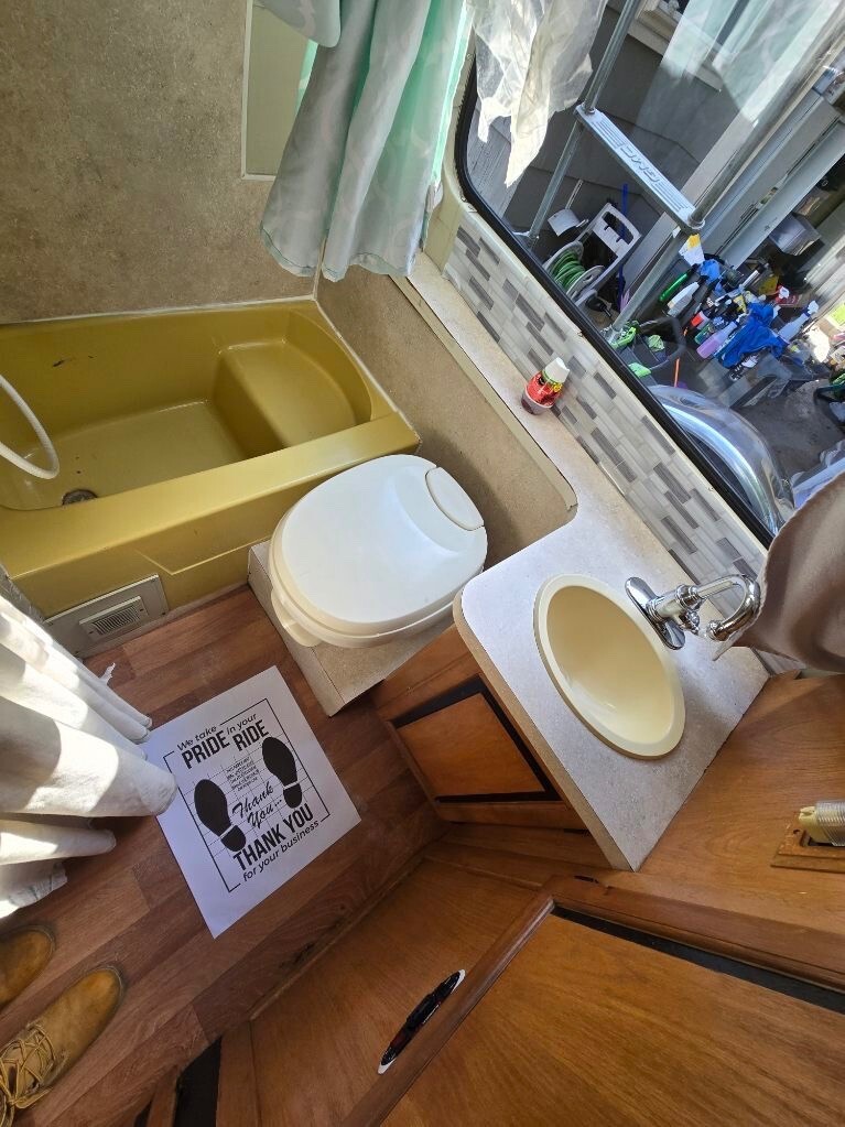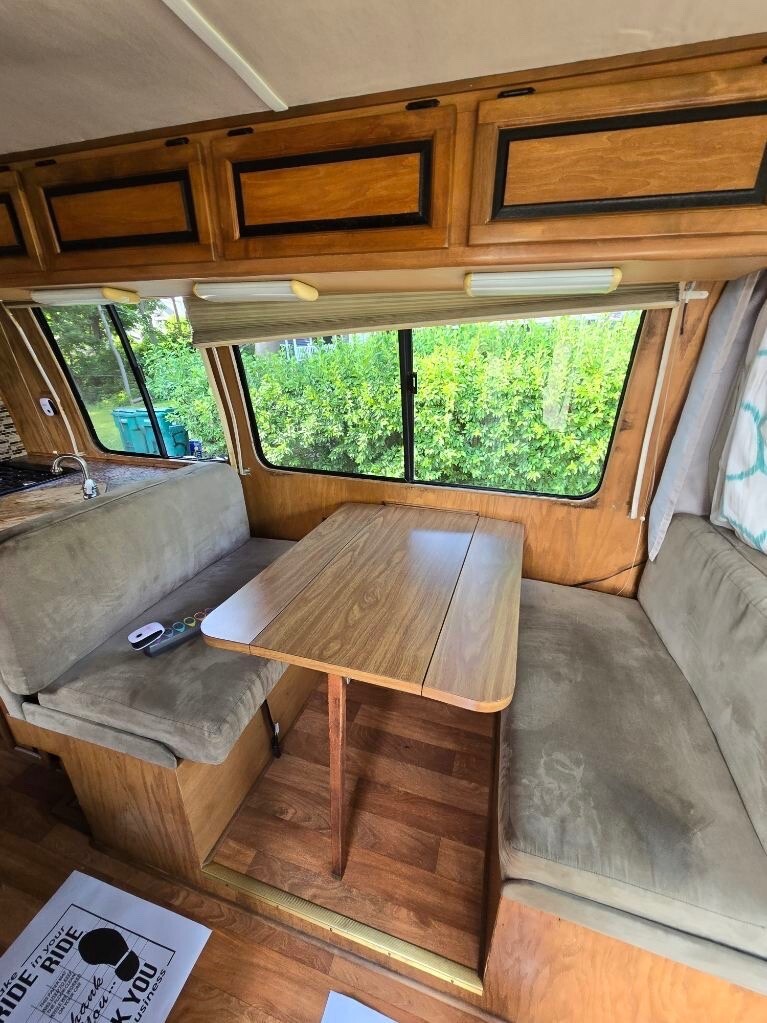 It is repainted in a custom pale green with tinted windows and pleated privacy shades all around. There is a trailer hitch in case you want to pull a trailer a tow car with you. Also comes with a bike rack, The Alcoa aluminum 16″ wheels with all weather tires set it off as a true Classic Vintage Hot Rod with plumbing!