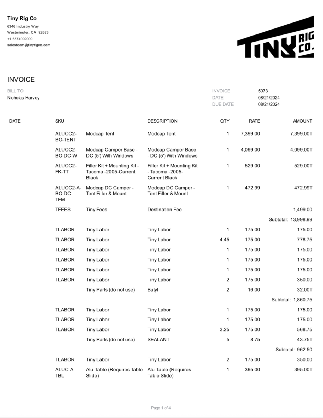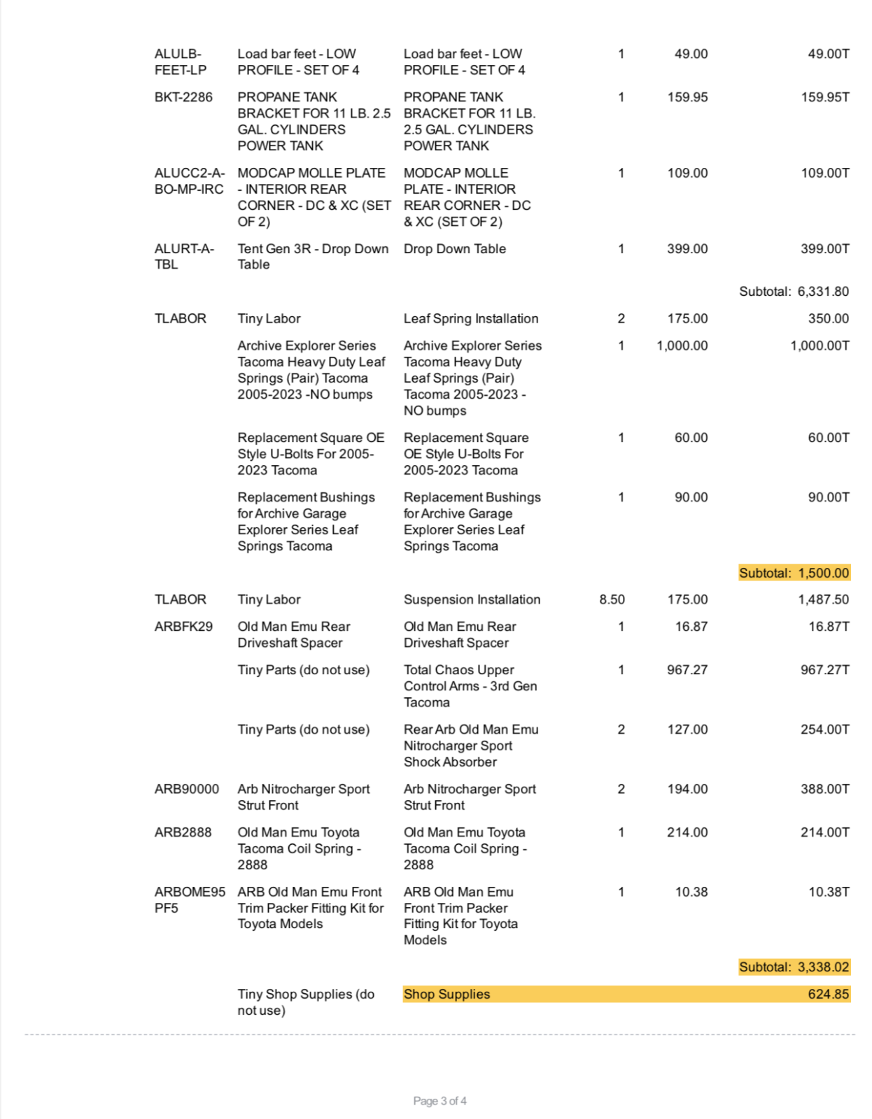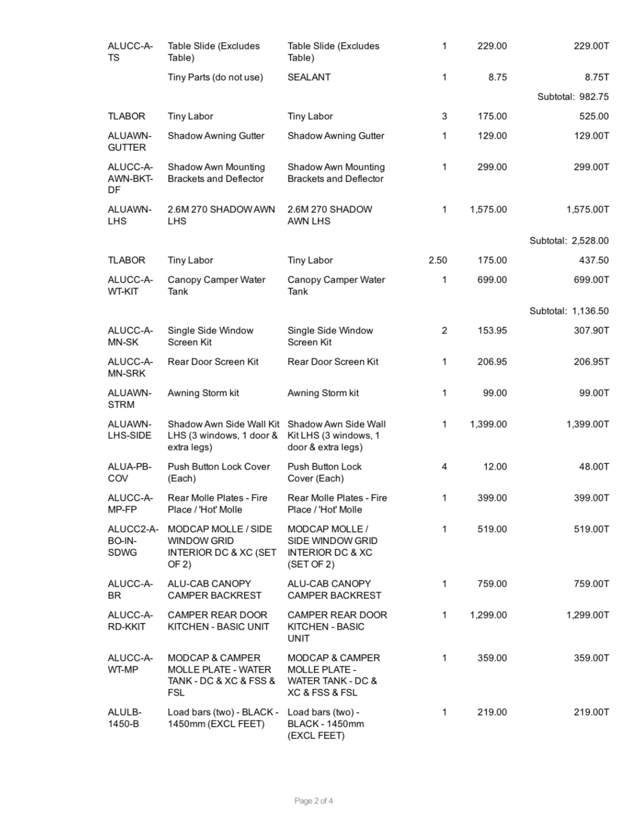 ModCap Tent $7399, ModCap Camper Base $4099,Filler/Mounting Kit $529, ModCap Tent Filler $473, Alu-Table $395, Table slides $229, Shadow Awning Gutter $129, Shadow Awning Mounting $299, Shadow Awning $1575, Canopy water tank $699, Side window screens $308, Rear door screen $207, Awning storm kit $99, Shadow awning side walls $1399, Lock covers $48, Rear molle plate $399, ModCap side window MOLLE $519, Canopy camper backrest $759, Camper Kitchen $1299, ModCap water tank bag kit $359, Load bars $219, Load bar feet $49, Propane tank bracket $159, ModCap interior MOLLE plates $109, Drop down table for tent $399, Animas rack $699, Renogy 200W solar panel $299