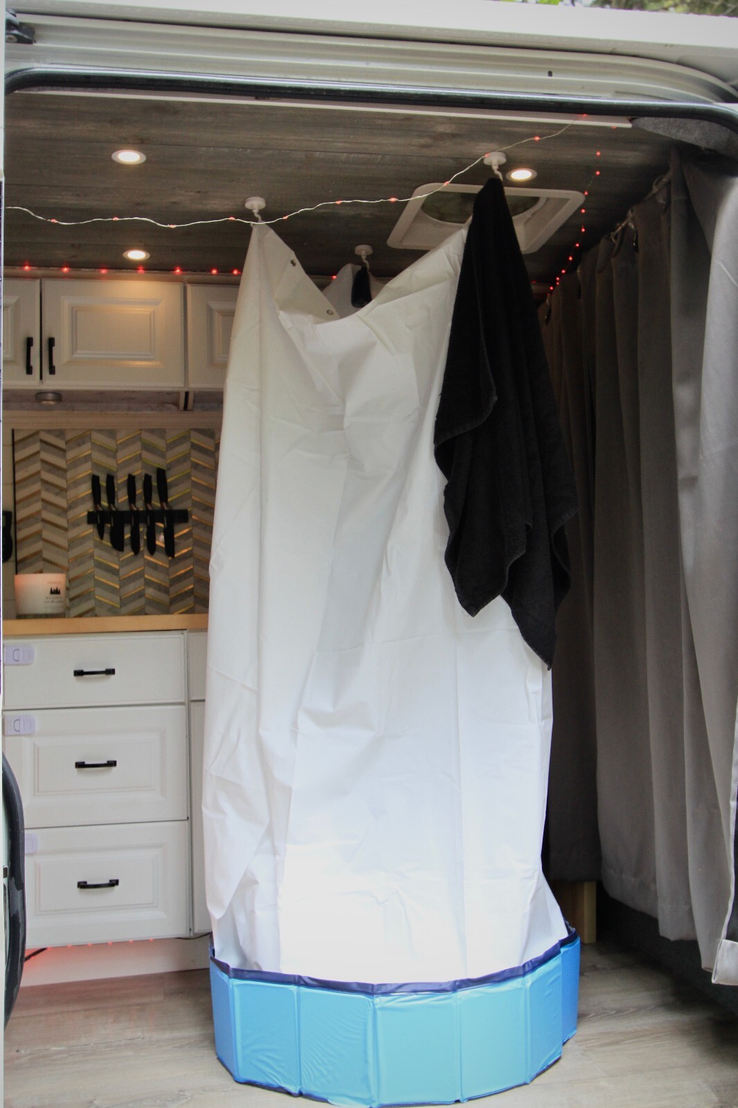 Running sink with electric pump, converts into shower with foldable tub and curtain