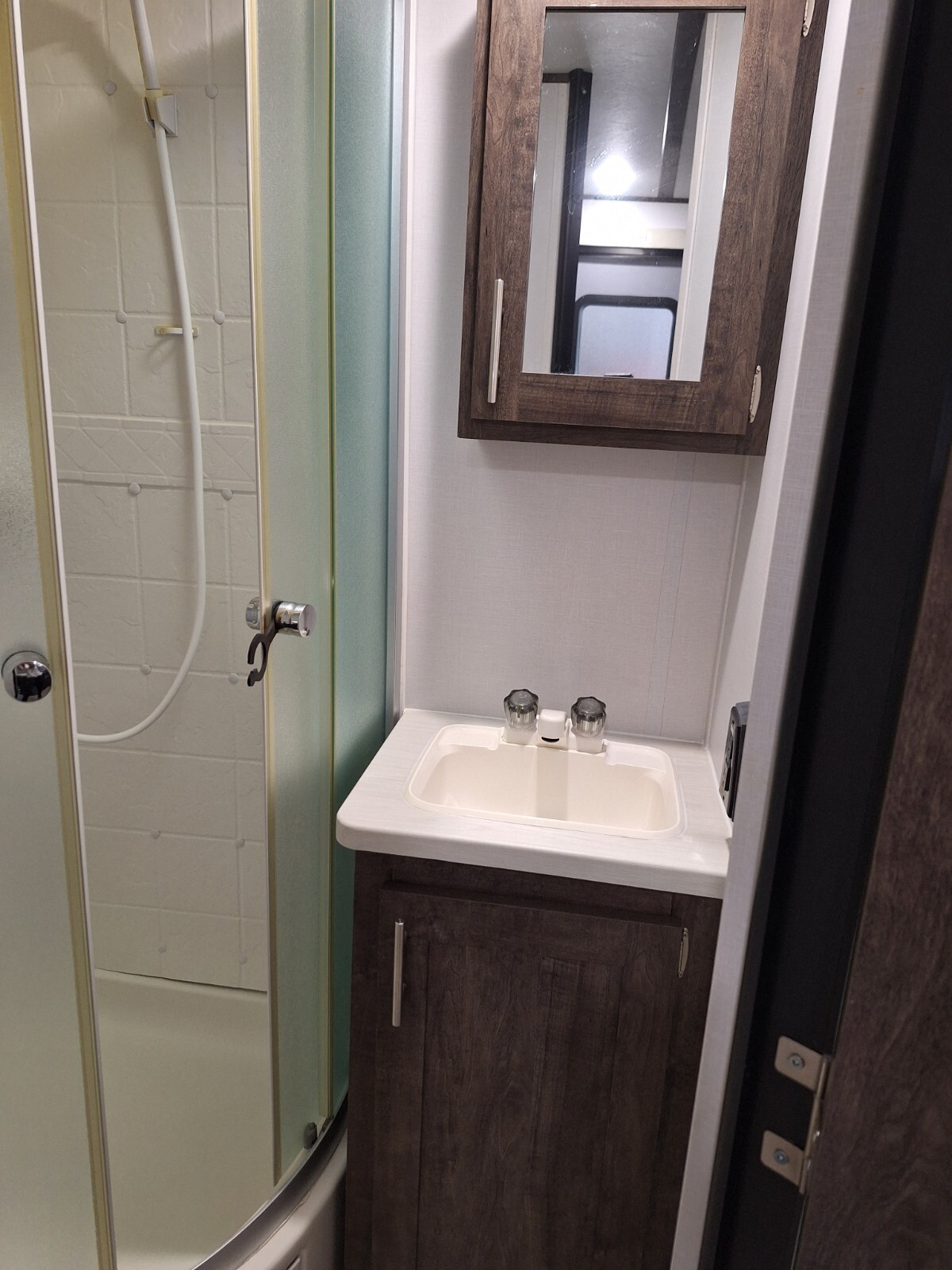 Rear bath with corner shower, medicine cabinet & sink cabinet with storage.