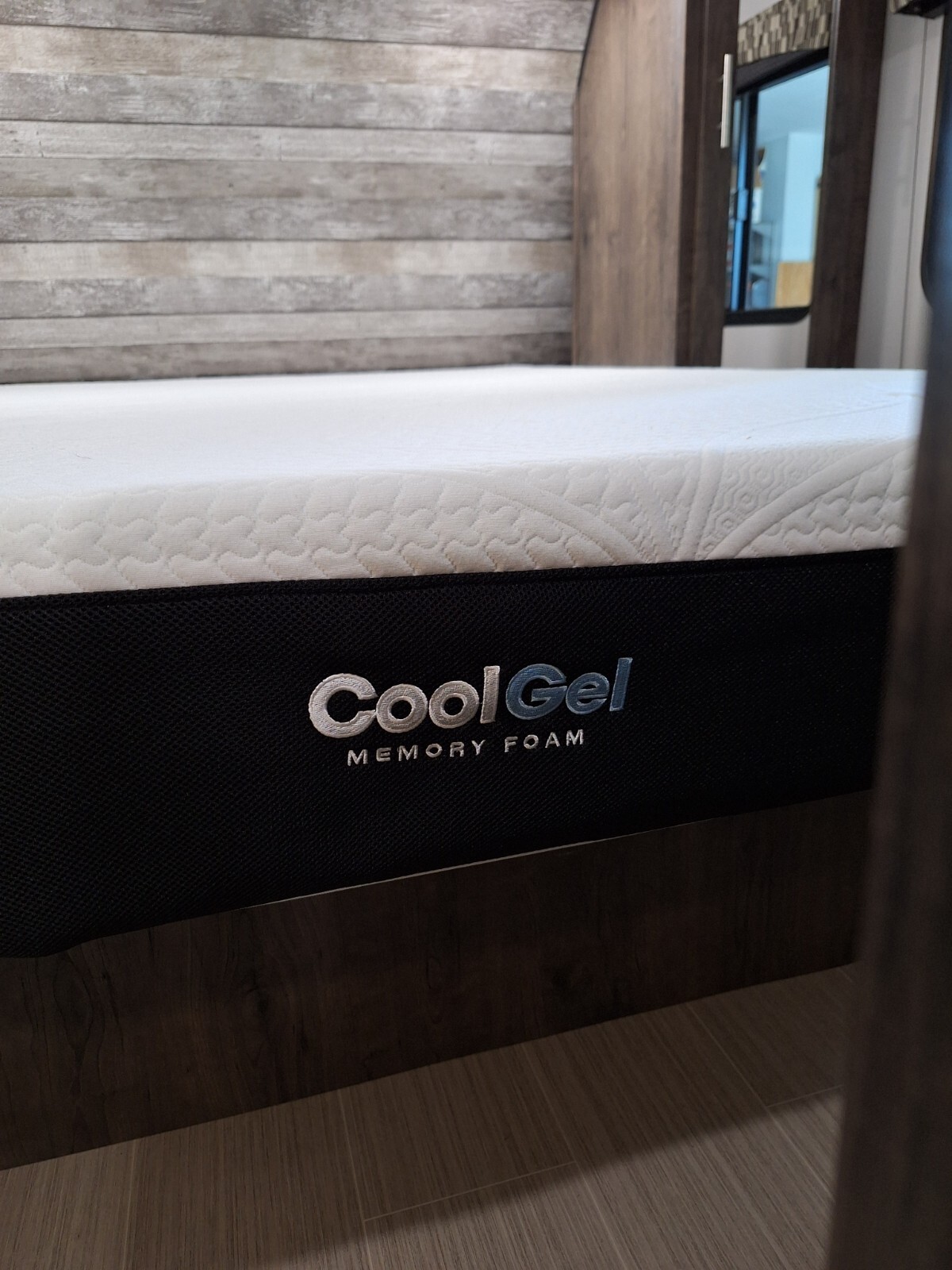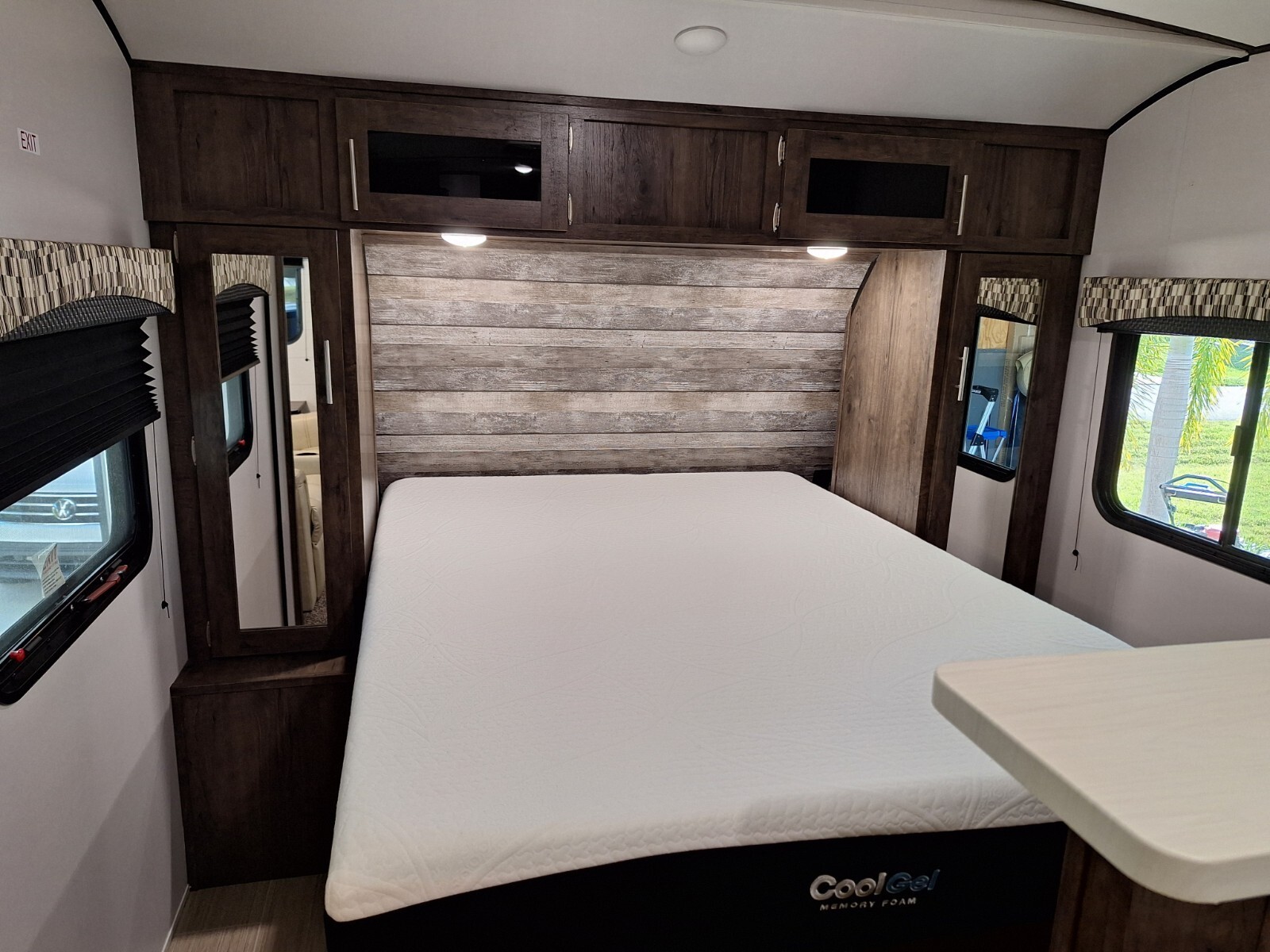 Short Queen bed with upgraded gel memory foam mattress. 2 wardrobes, cabinets above bed & nightstands with power outlets & USB port.