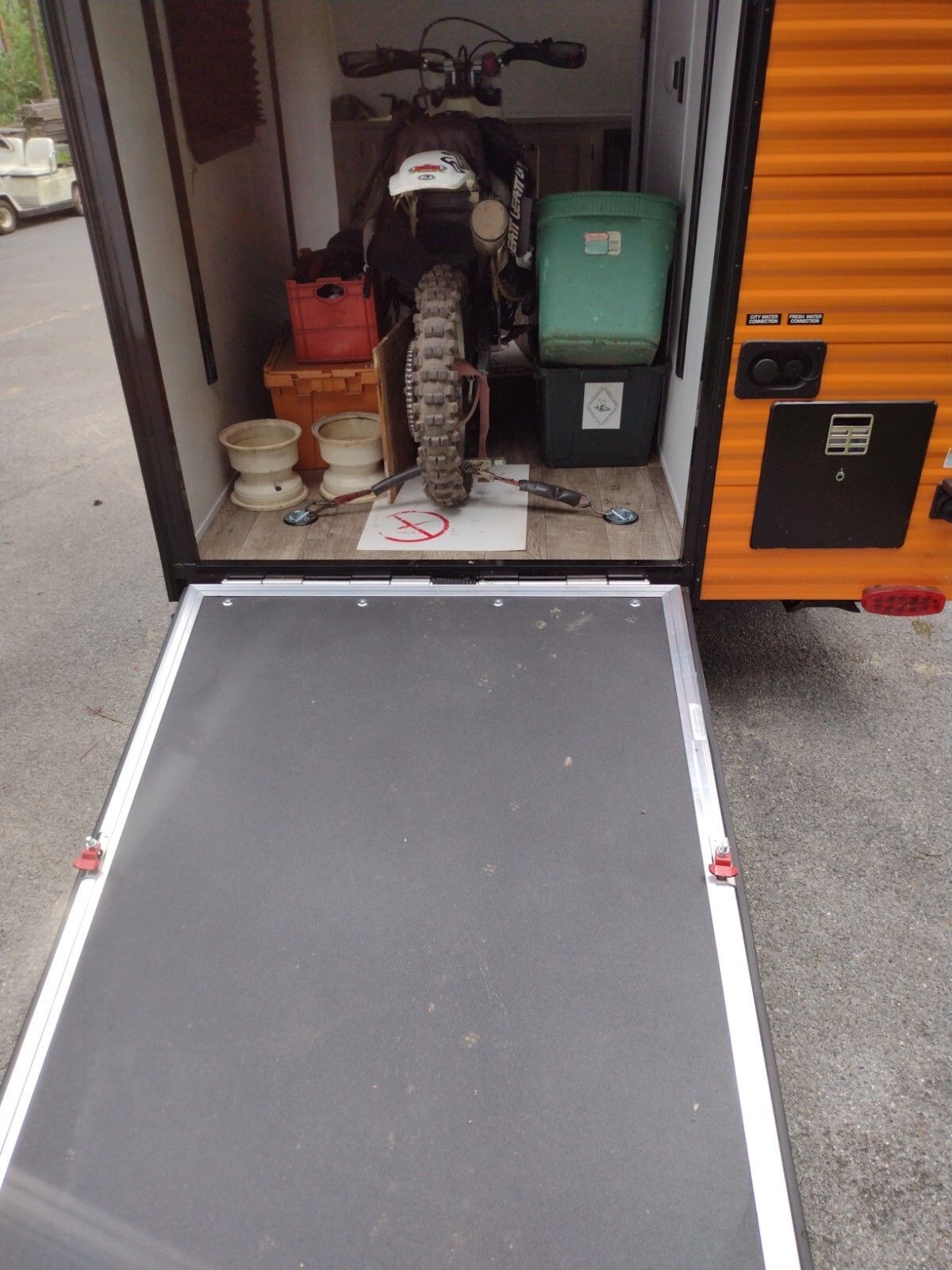 Micro toy hauler only weighs 1900lbs. can fit 2 full size dirt bikes & 1 mini or one full size big Dresser / Touring bike / Adventure bike, AC, gas heat, hot wtr is gas/electric, rear door bug screen, outside shower, outside kitchen, fridge / freezer, inside toilet & sink, double batteries (stored in shop on battery tender) 500 lbs rated roof rack, solar ready, manual awing, hitch stabilizer system a $900 value, bed lifts high manually for bike loading / clearance tows nicely with V6 Astro van 16 foot in length, go to YouTube search Sunray T 139 for all the info motivated seller make an offer clear title