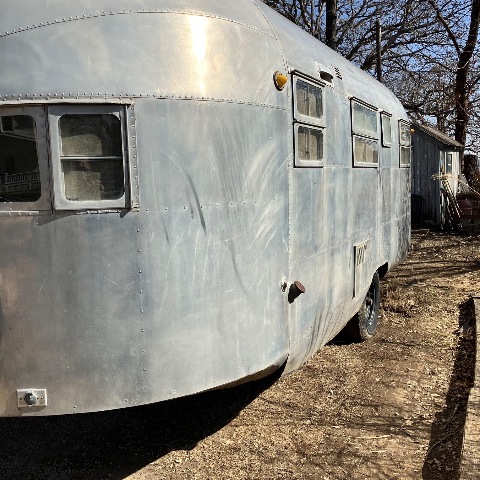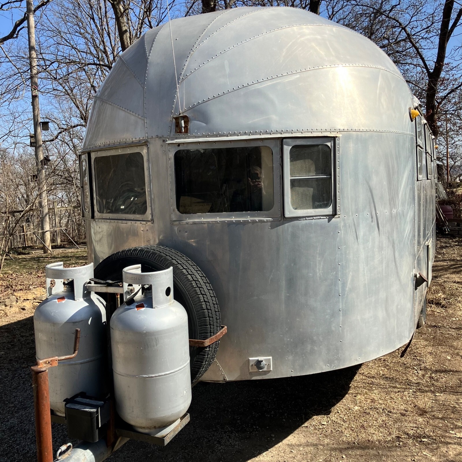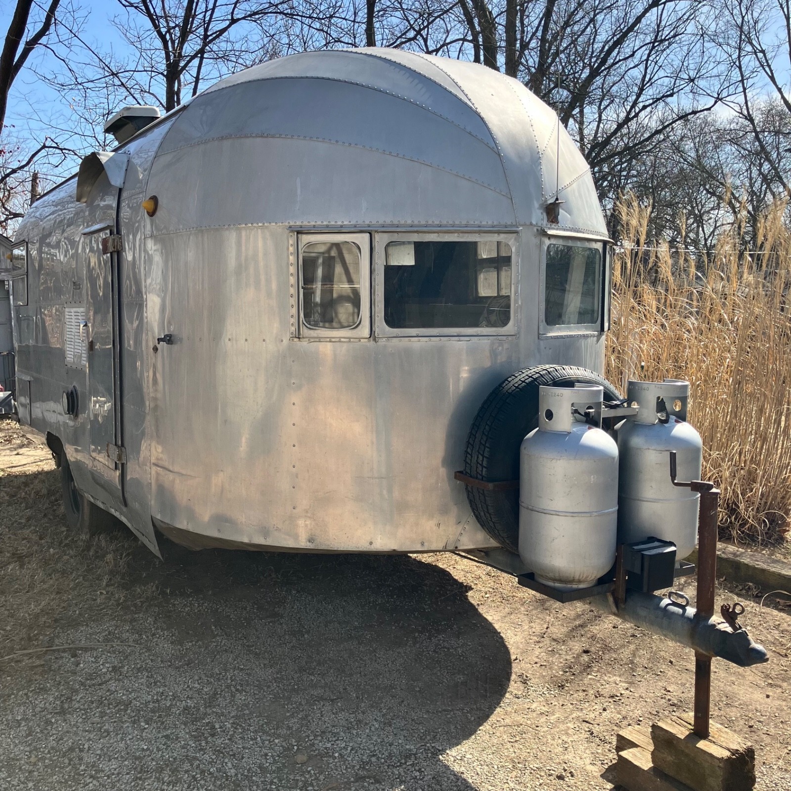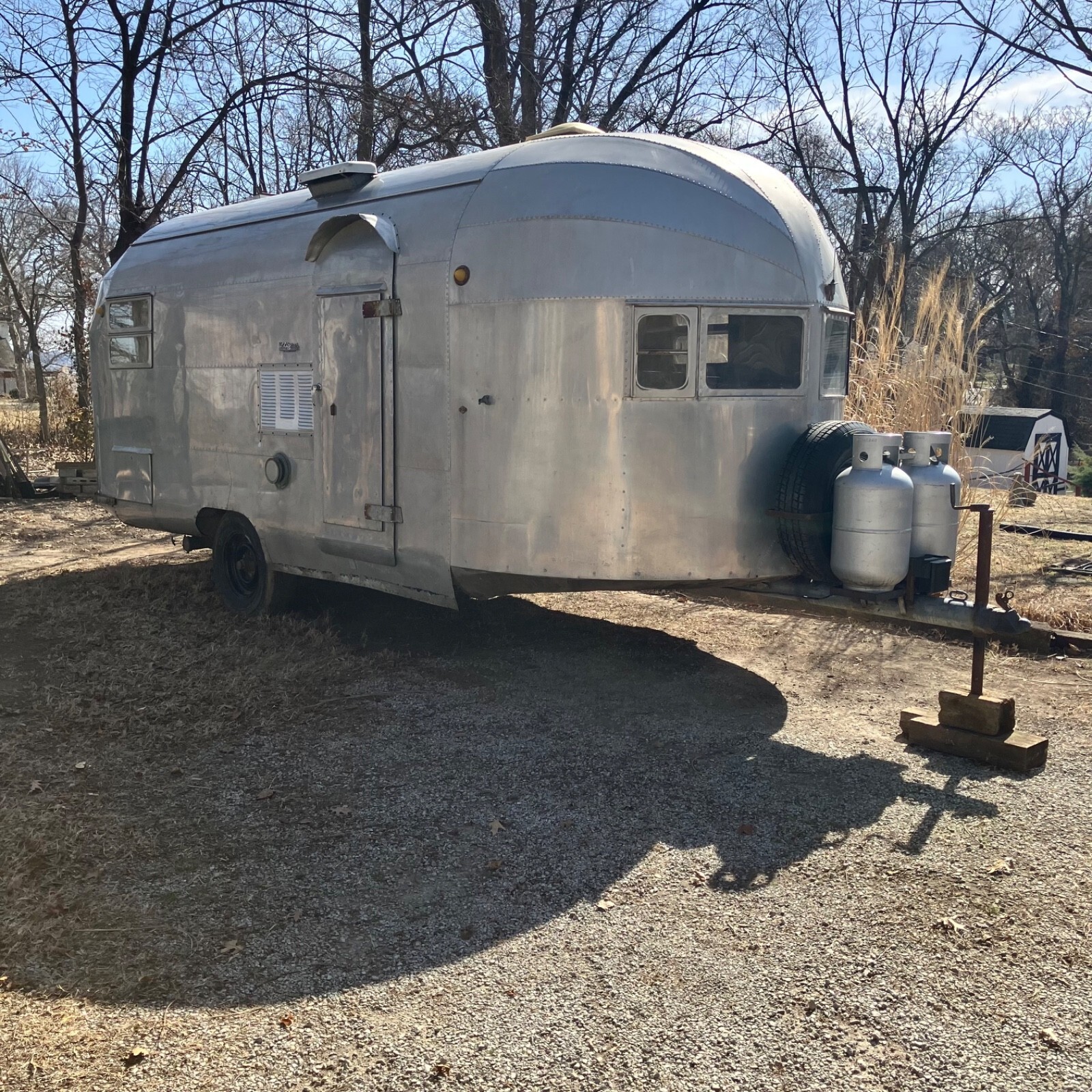 We’ve owned ‘The Streak’ for nearly 30 years, but it has sat for the last twenty after frame repairs.It remains semi-completed after the front-half interior removed to make the repairs. The center tube and front five floor joist were replaced, but complete replacement of the interior remains unfinished. Substantial work remains, and some components are missing.The plumbing system is intact but missing water heater, fresh water tank and furnace,grey water tank is rusty.Original range, Aluminum propane tanks, Dometic fridge and Tetford toilet 30 yrs old and working 20 years ago, as was the small inverter/charger. No battery. Both skylight vents should be replaced.All floor is sound, but top ply delaminating in rear after unnoticed skylight damage. Could be scrapped and 1/8 ply added to level.Rear underpan in place, front removed but on hand.Center section was rusty galvanized sheet metal that corroded the bottom wall sheets-new sheet of 2024T3 included for the repairs.Tires new four years ago,but….Not sure if exterior lights or brakes would jwork, but attaching lead is not attached.Should be trailered if moving more than a few miles.Kansas title
