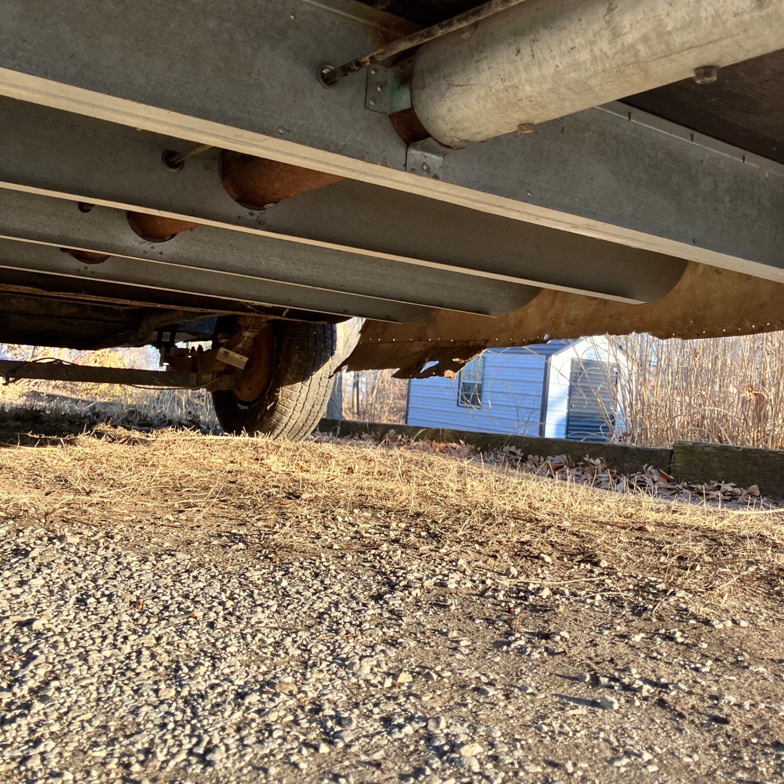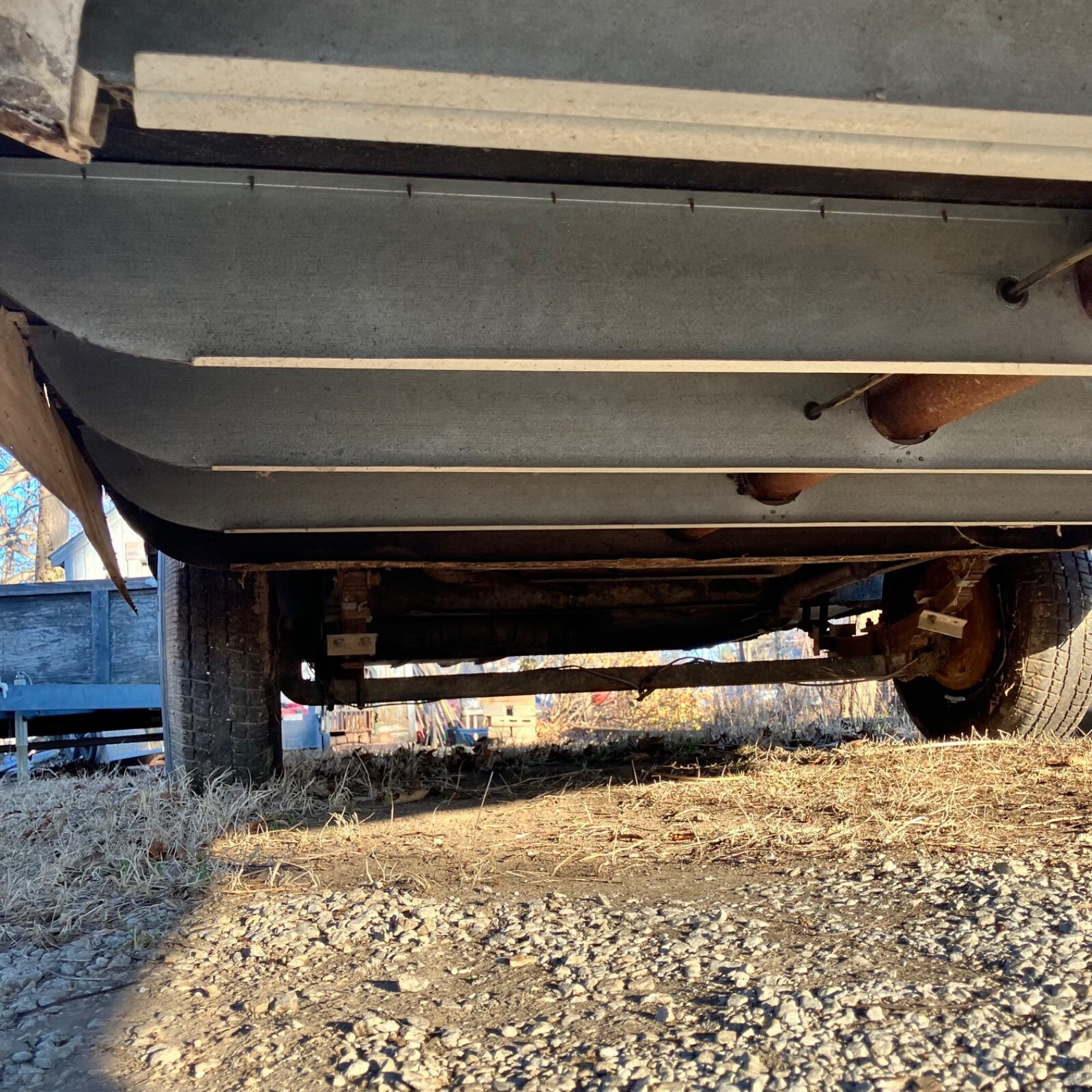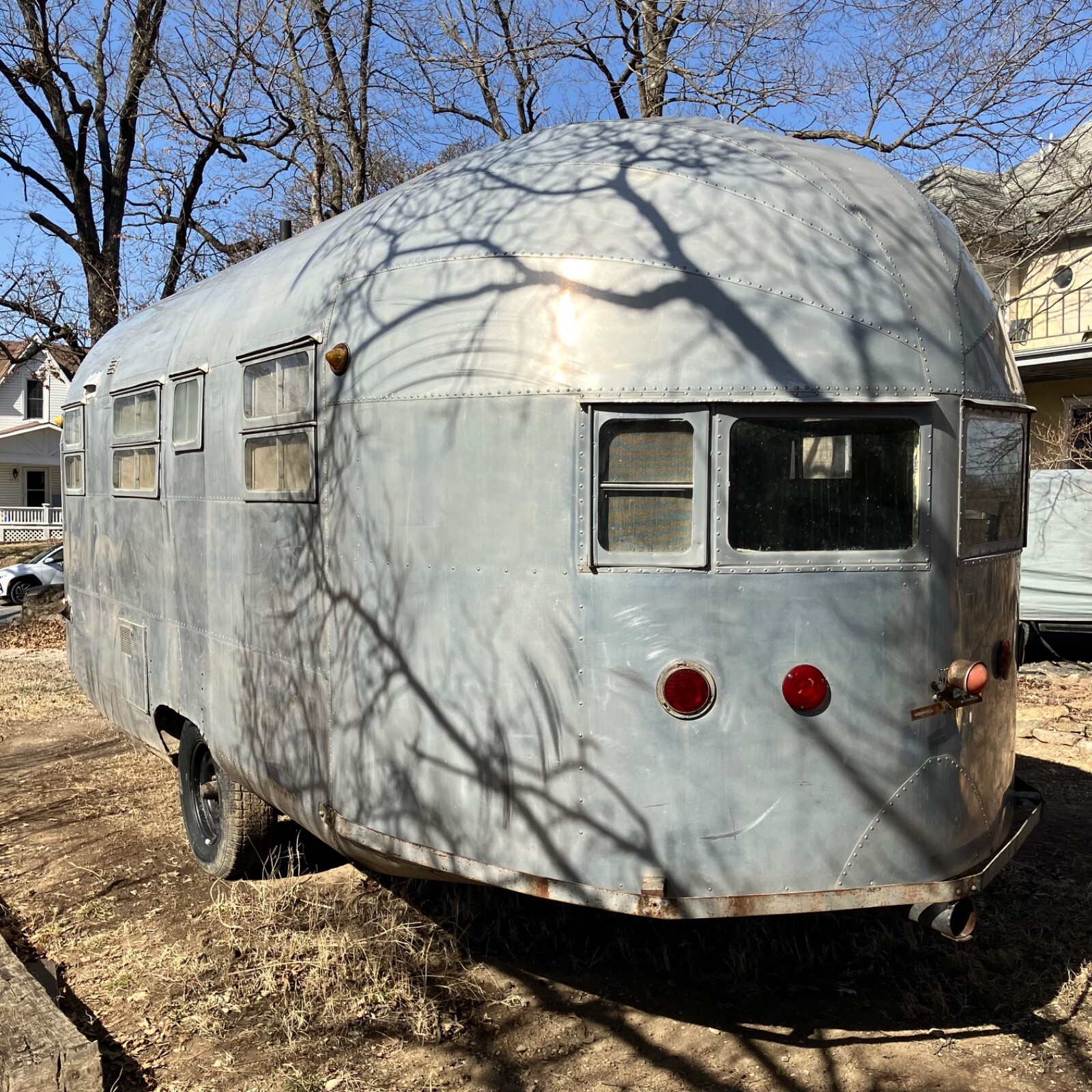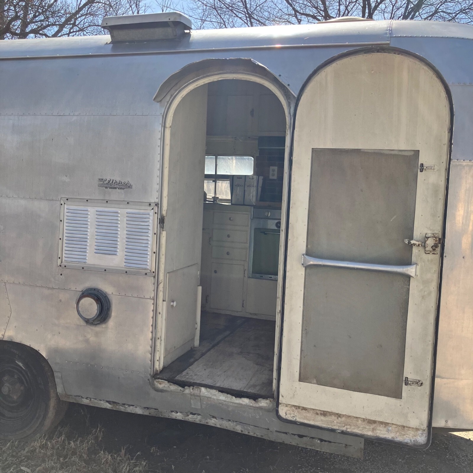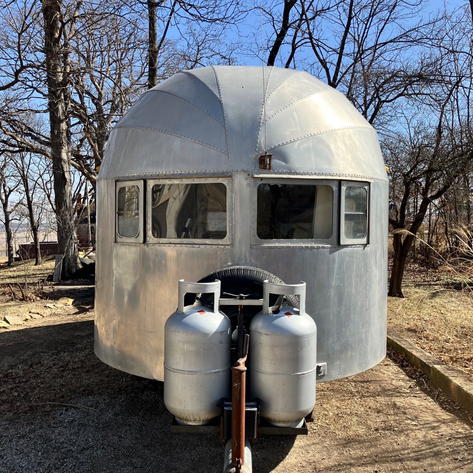 We’ve owned ‘The Streak’ for nearly 30 years, but it has sat for the last twenty after frame repairs.It remains semi-completed after the front-half interior removed to make the repairs. The center tube and front five floor joist were replaced, but complete replacement of the interior remains unfinished. Substantial work remains, and some components are missing.The plumbing system is intact but missing water heater, fresh water tank and furnace,grey water tank is rusty.Original range, Aluminum propane tanks, Dometic fridge and Tetford toilet 30 yrs old and working 20 years ago, as was the small inverter/charger. No battery. Both skylight vents should be replaced.All floor is sound, but top ply delaminating in rear after unnoticed skylight damage. Could be scrapped and 1/8 ply added to level.Rear underpan in place, front removed but on hand.Center section was rusty galvanized sheet metal that corroded the bottom wall sheets-new sheet of 2024T3 included for the repairs.Tires new four years ago,but….Not sure if exterior lights or brakes would jwork, but attaching lead is not attached.Should be trailered if moving more than a few miles.Kansas title
