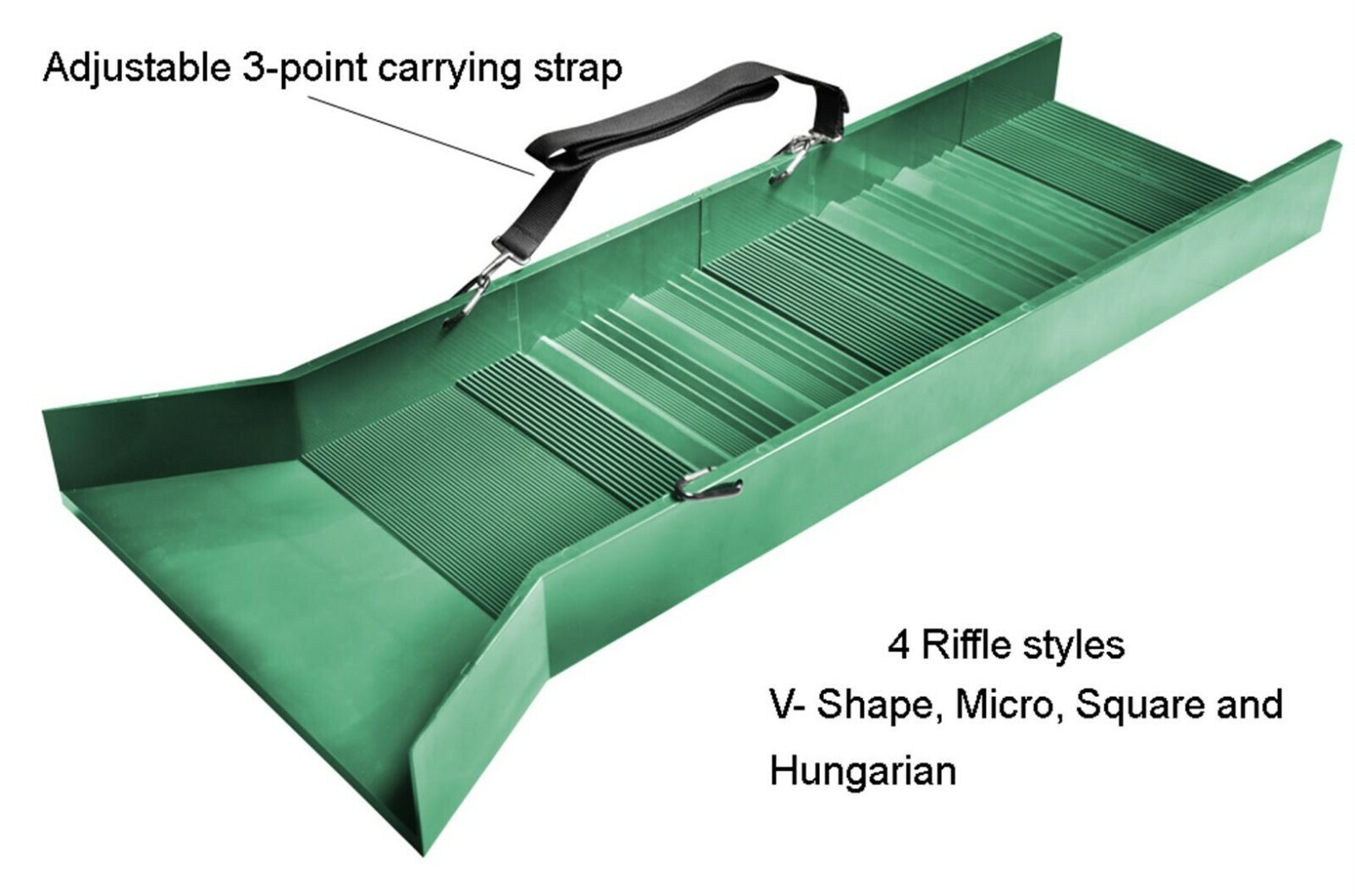 • 91.5 cm overall length• 48" adjustable 3-point carrying strap• 25 cm 10" channel width• 40 cm 16" mouth width• 7.5 cm 3" wall height• 4 riffle styles- consisting of V- Shape, Micro, Square and Hungarian•2.7 kg weight•Green colour