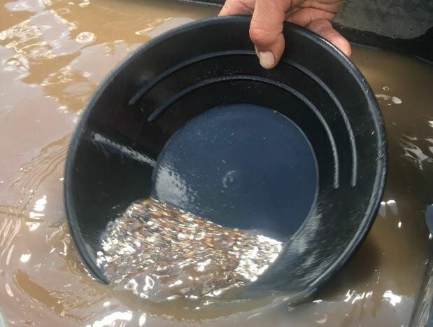 Gold panning, or simply panning, is a form of placer mining and traditional mining that extracts gold from a placer deposit using a pan. The process is one of the simplest ways to extract gold, and is popular with geology enthusiasts especially because of its low cost and relative simplicity. Gold is roughly 19 times heavier than water. Using a gold pan is an economical way of separating gold from other materials.