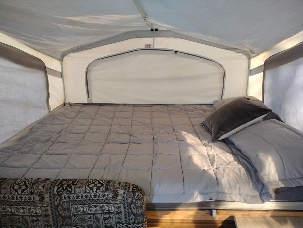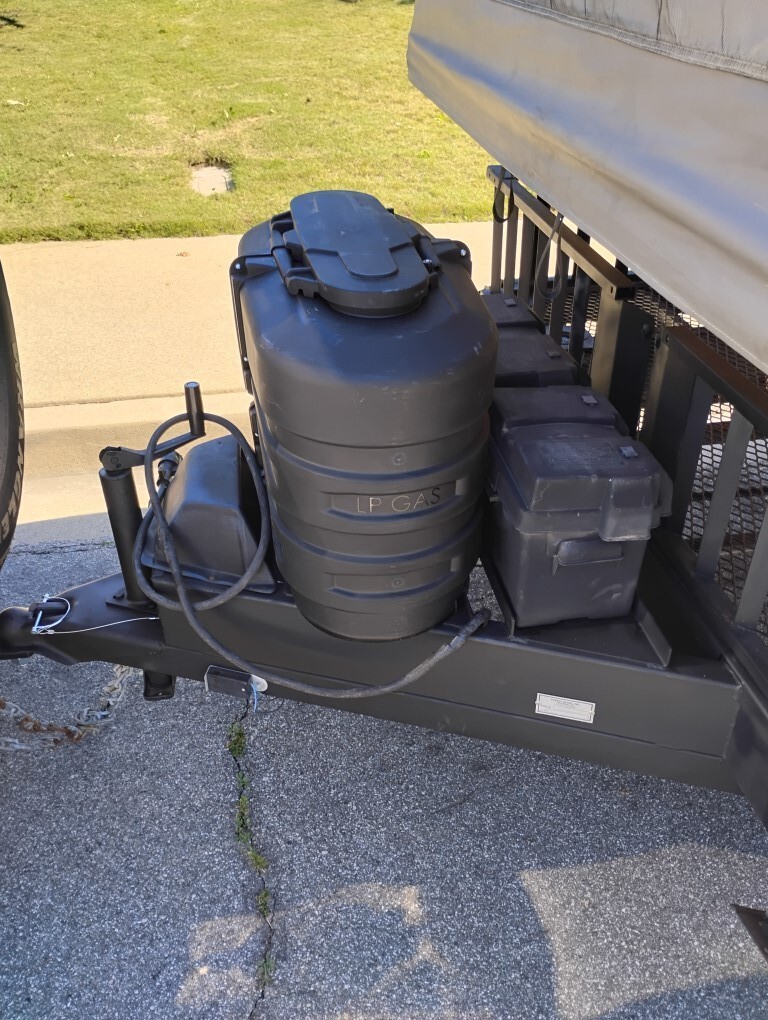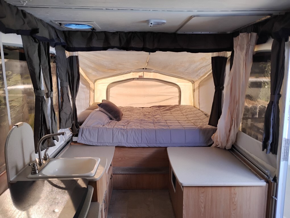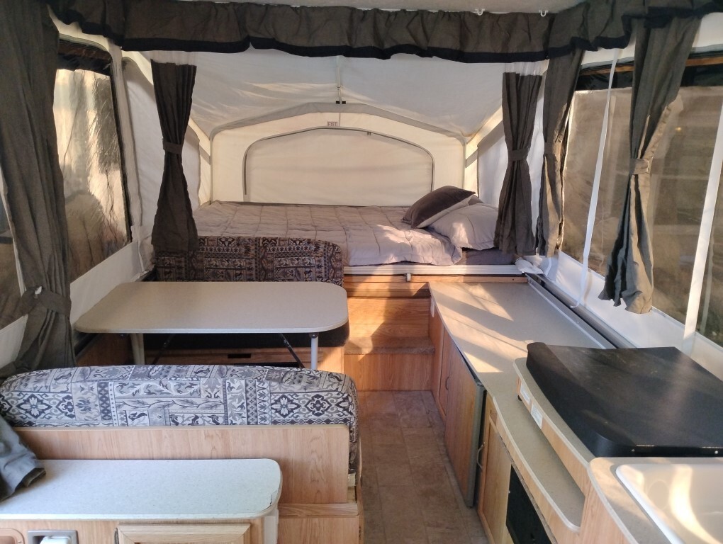 New AGM batteries (maint free).New dual 20 lb LPG propane tanks with true level gauges, new lines.3-way 2-cuft refrigerator.Inside propane cooking stove, with outside side mount and propane hookup.Dual slide out sleeping areas, 66x80 & 60x80 with all new bedding.