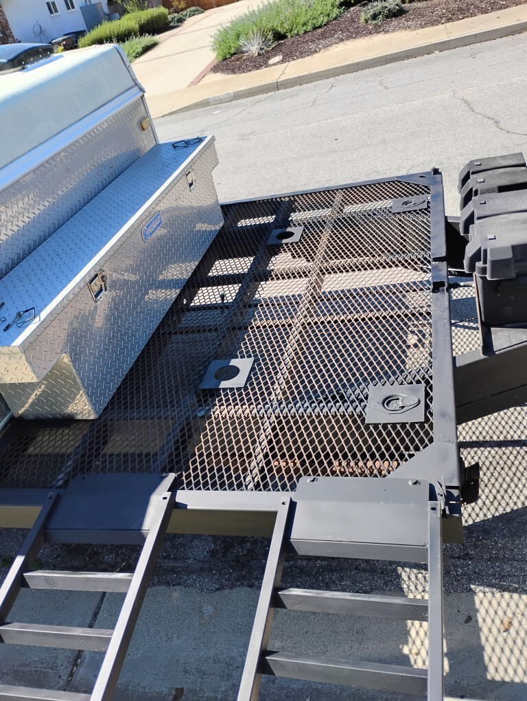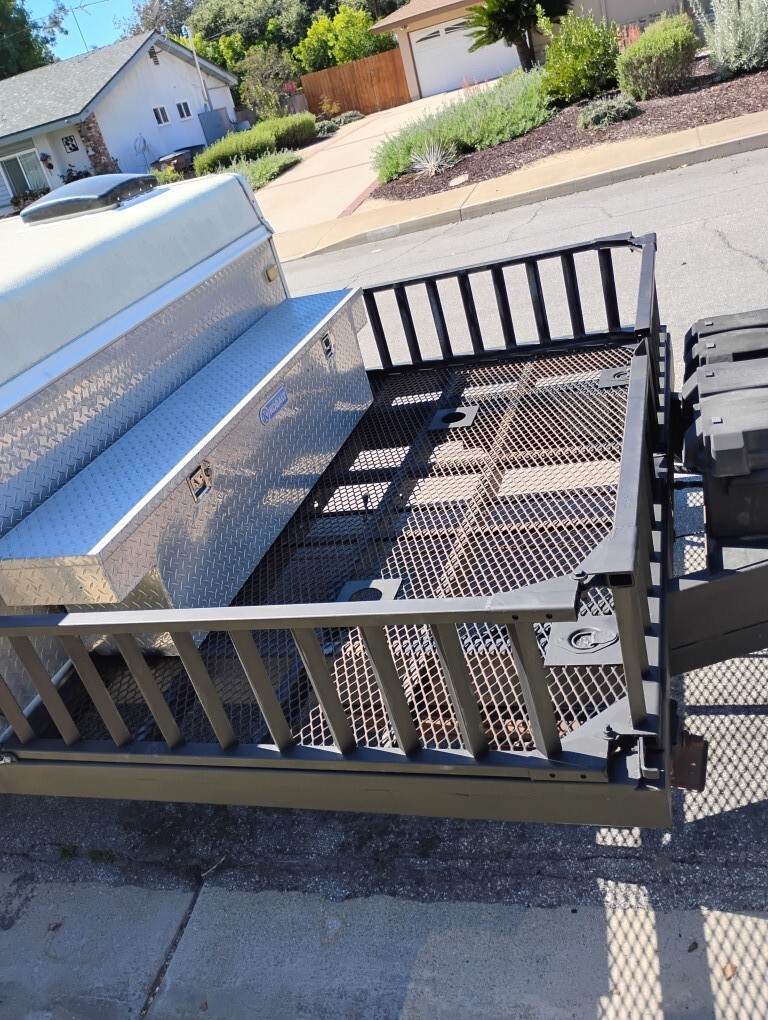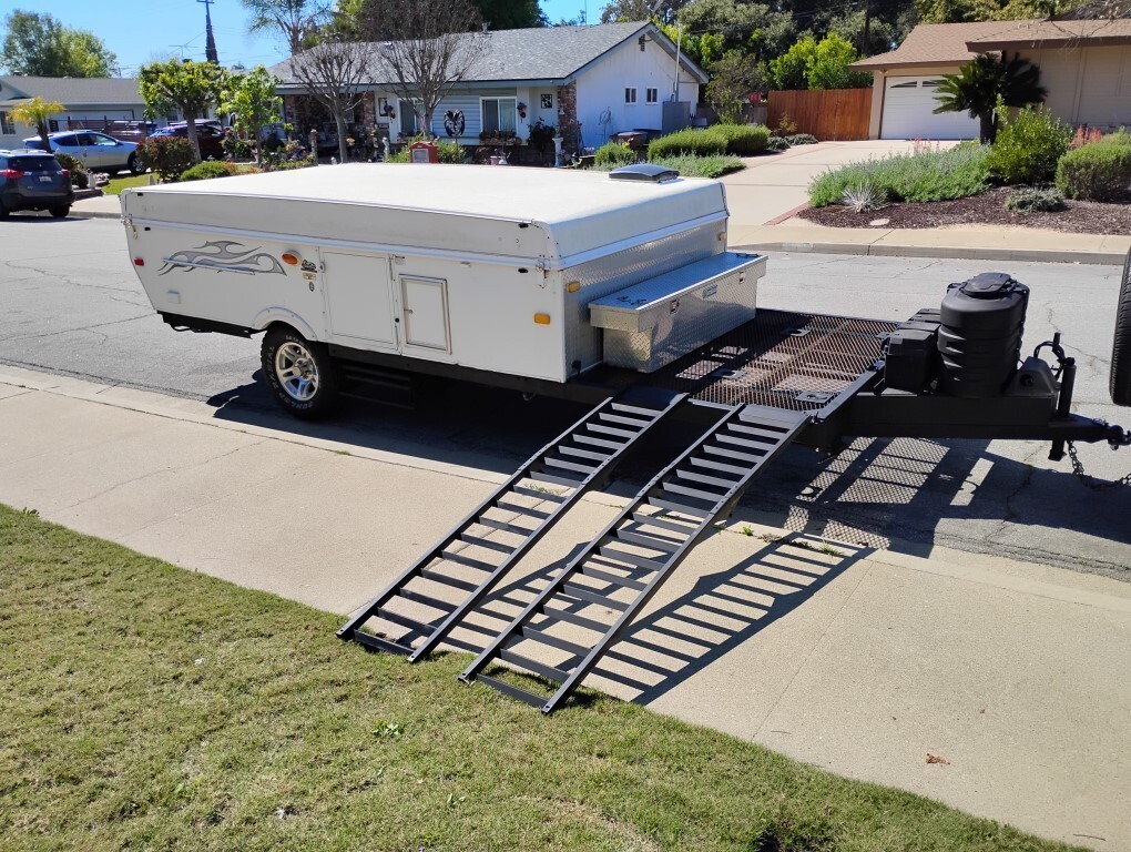 Factory heavy duty design from Palomino with front storage area. Use for firewood, toys, bikes, motorcycles, quad, camping gear, generator, etc. Has heavy duty ramps that double as side railings.