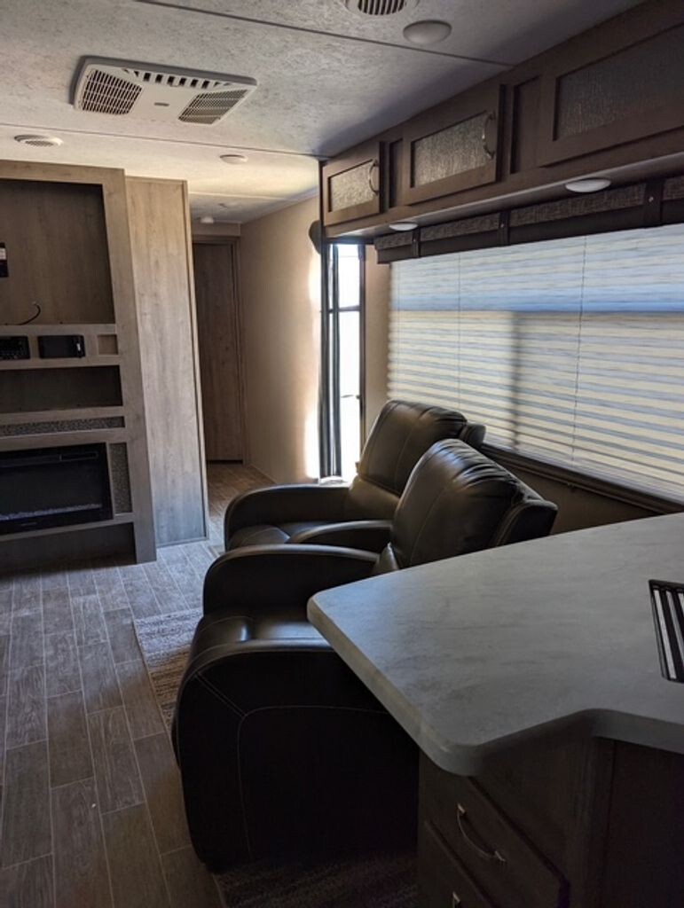 The living area is warm and welcoming, featuring comfortable seating, tasteful finishes, and a seamless flow ideal for relaxing after a day on the road. The opposing slide design opens the space dramatically, giving you room to stretch out and feel at home.
