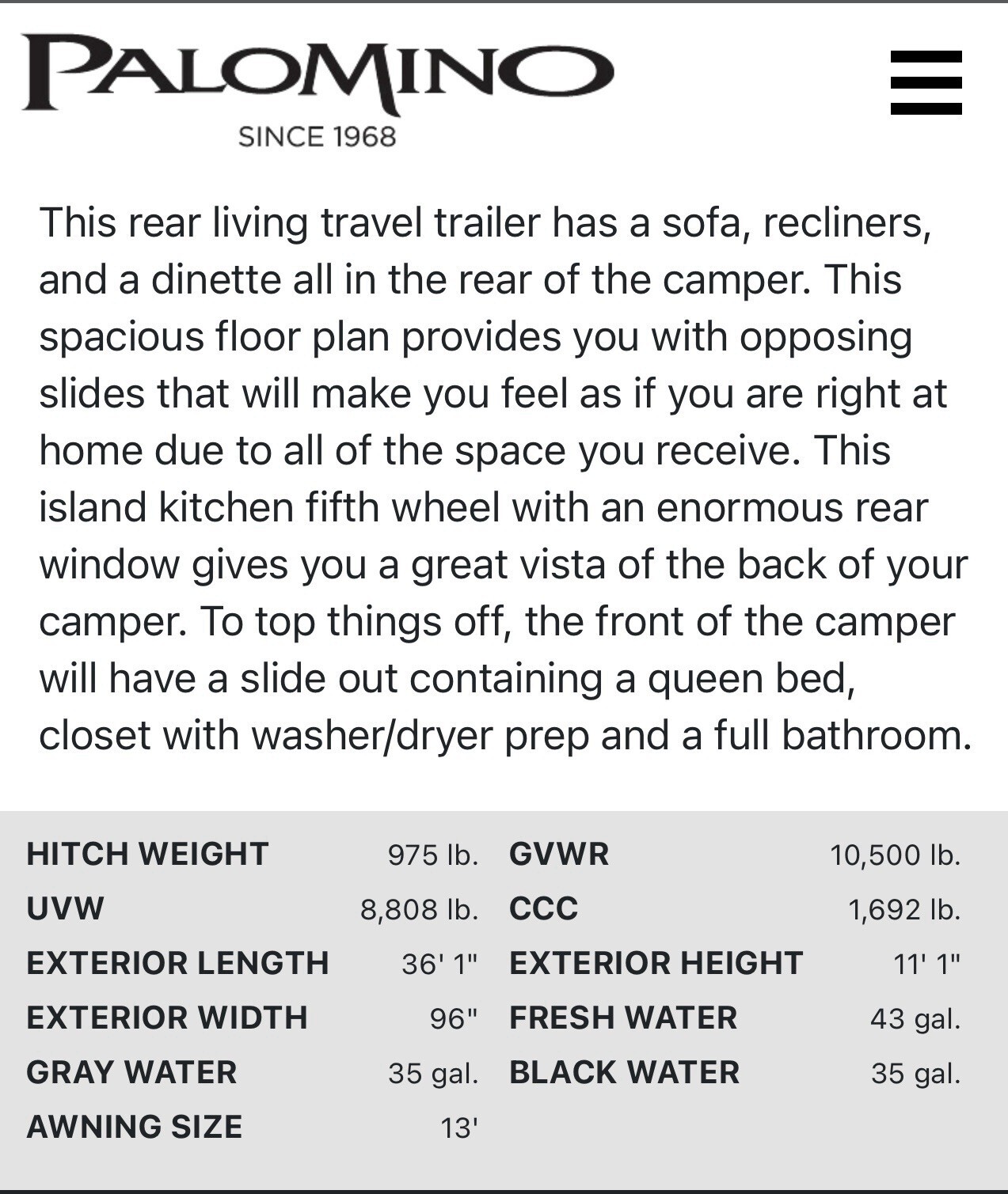 2023 Palomino PUMA 32 FT Trailer. Stove has never been used. New queen mattress. Great views from windows. Comfortable for single person or couple for living. Has washer/dryer closet. Good amount of storage. Had purchased to live in but need to sell because of circumstance change. Only asking pay off.