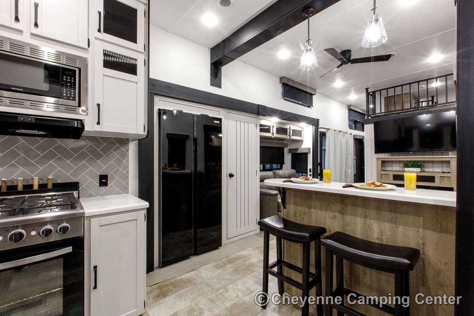 Outside, you’ll have a 20′ power awning, a sliding entry door, premium MORryde entry steps, marine-grade stereo speakers, storage compartments, a black tank flush, hot/cold shower fixture, solar prep, a roof ladder, and an LP quick connect.