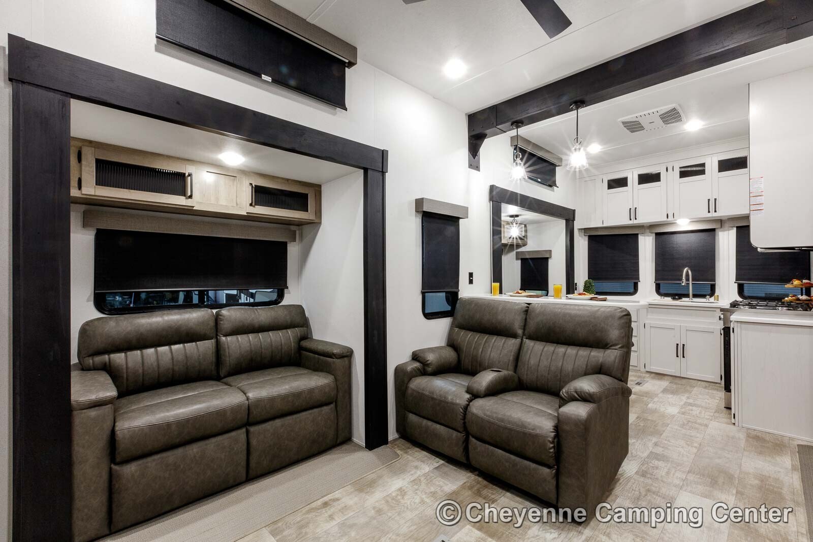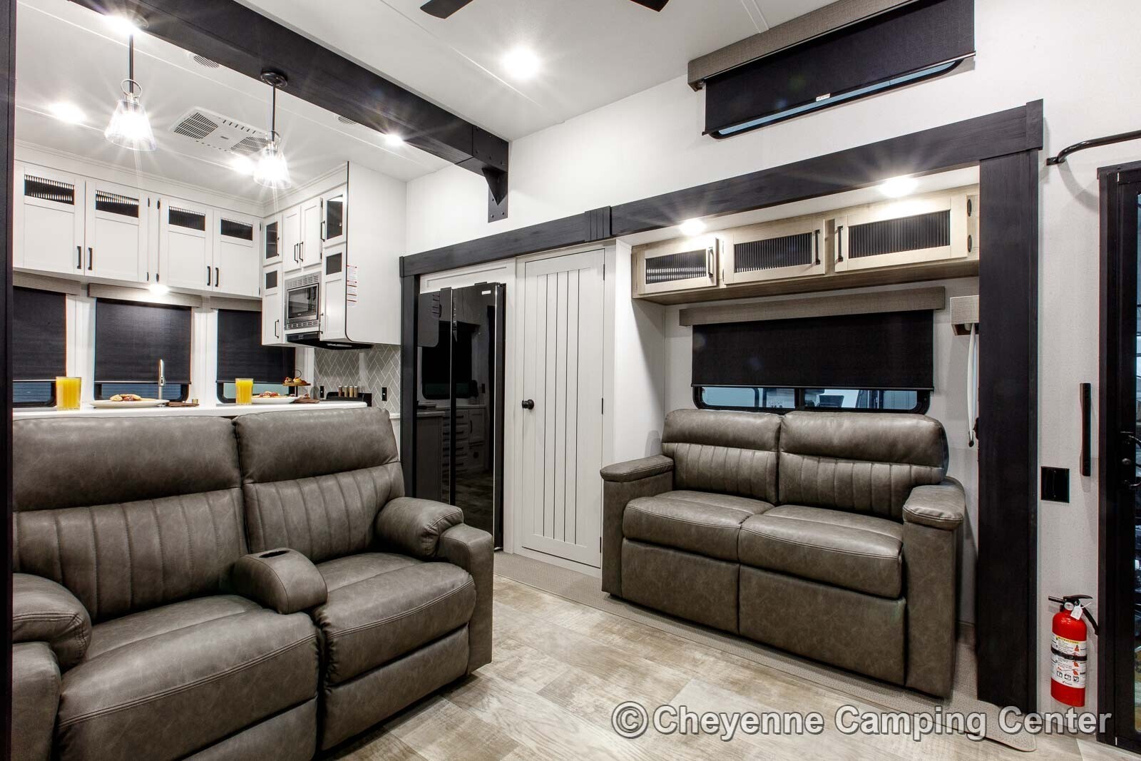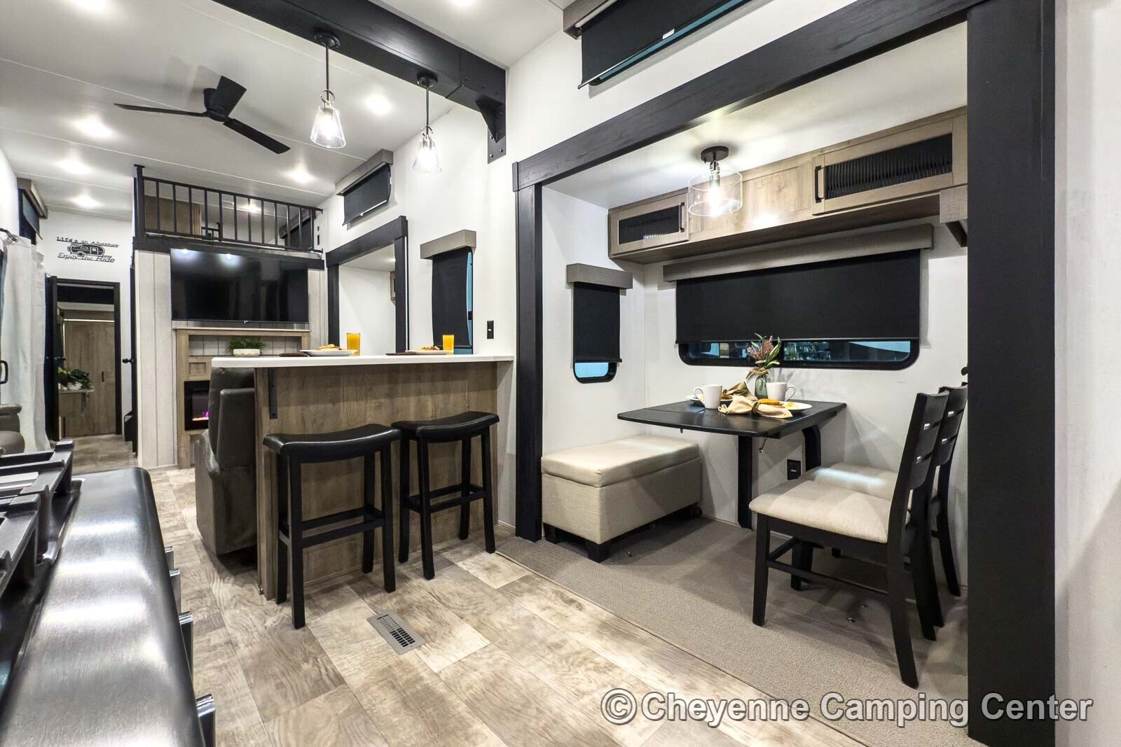 The living room is modern and functional, featuring dual opposing sofa sleepers, reclining theater seating, a 50″ Smart LED television, a Bluetooth soundbar stereo, and an electric fireplace with heat.