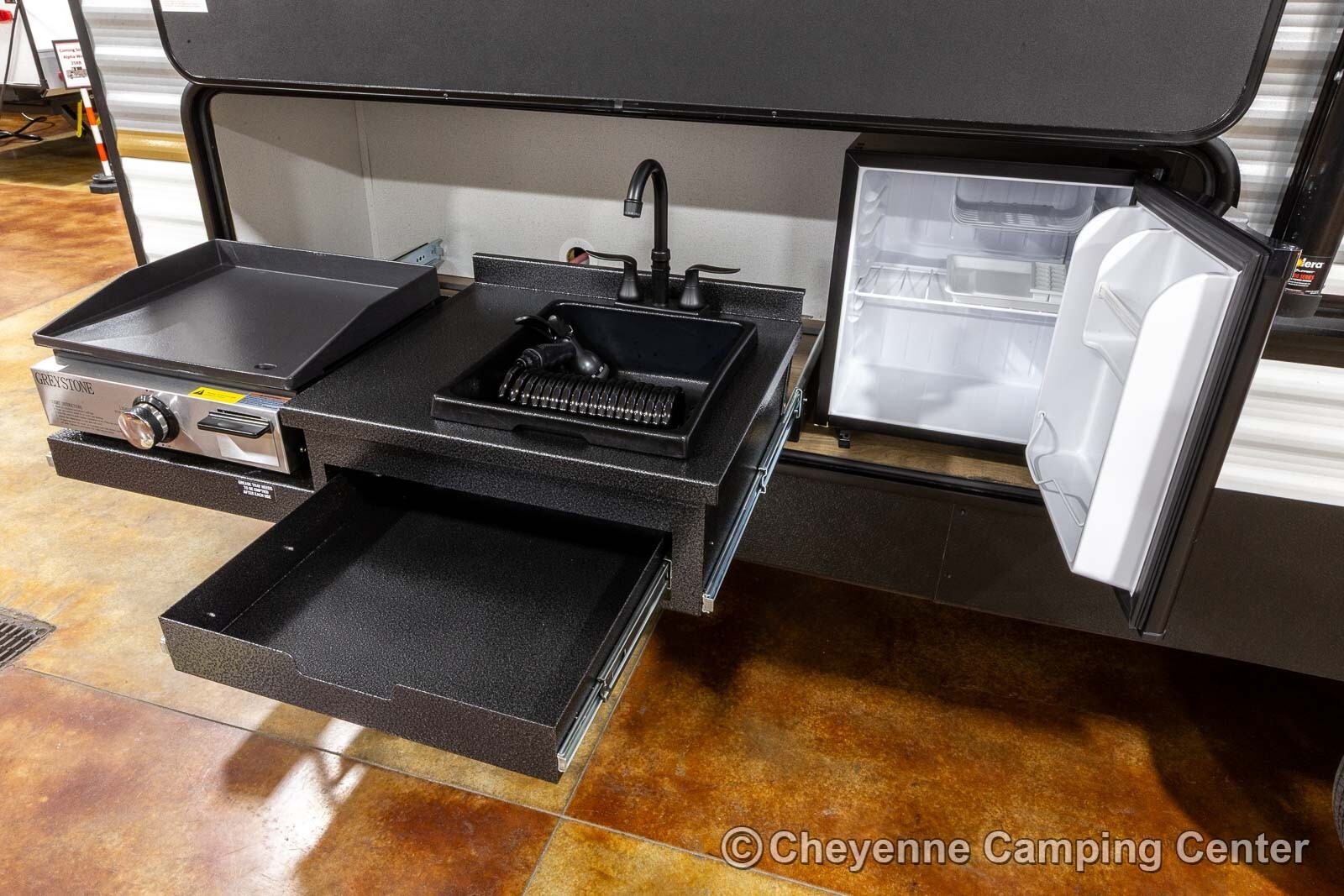 You’ll also have an AM/FM/HDMI/Bluetooth stereo, exterior marine-grade speakers, a 32” HD TV, a 10.7 cu. ft. 12V refrigerator, an outdoor shower, a roof-mounted RV A/C, a 15′ power awning with LED lighting, solar prep, a 12V RV battery, a one-year manufacturer’s warranty, one-year complimentary 24/7 roadside assistance, and much more.
