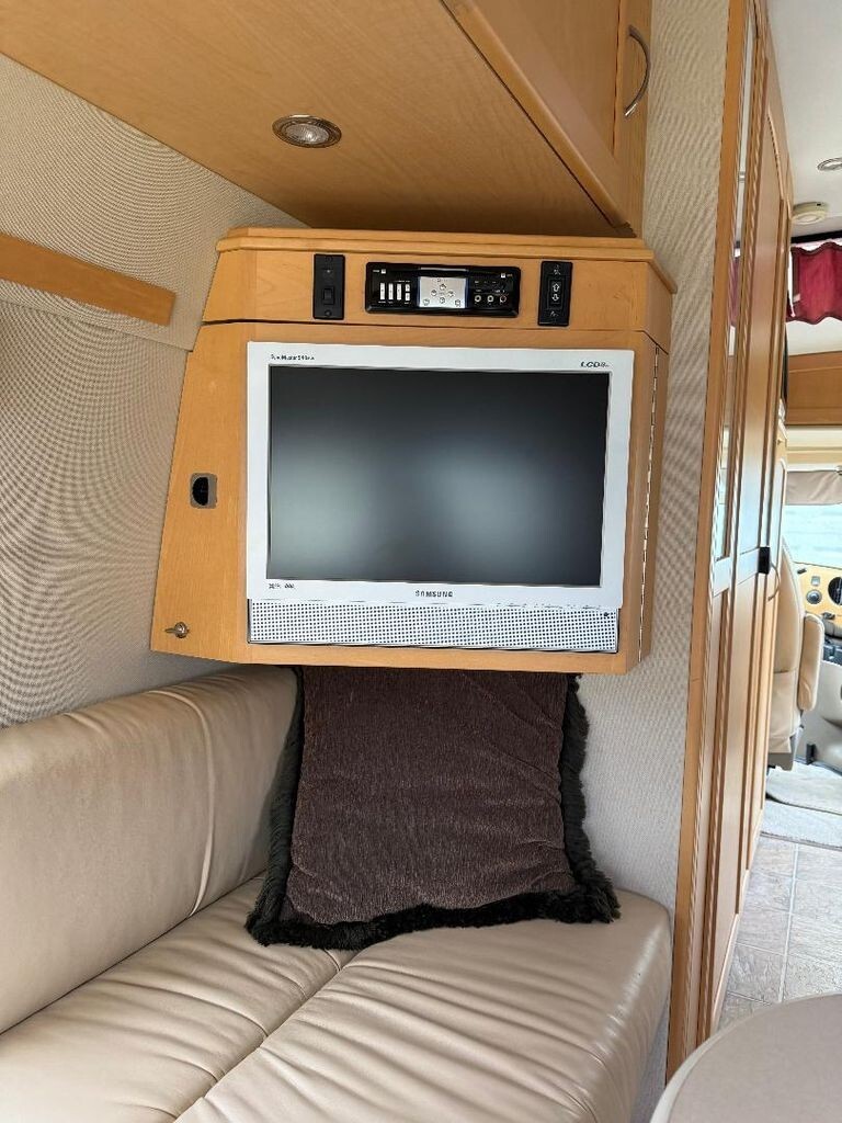 Inside, the Excel TS features high-quality craftsmanship with beautiful wood cabinetry and smart use of space. The rear power sofa quickly converts into a comfortable king-size bed, while the swivel captains chairs and removable tables create a flexible dining and lounge area.