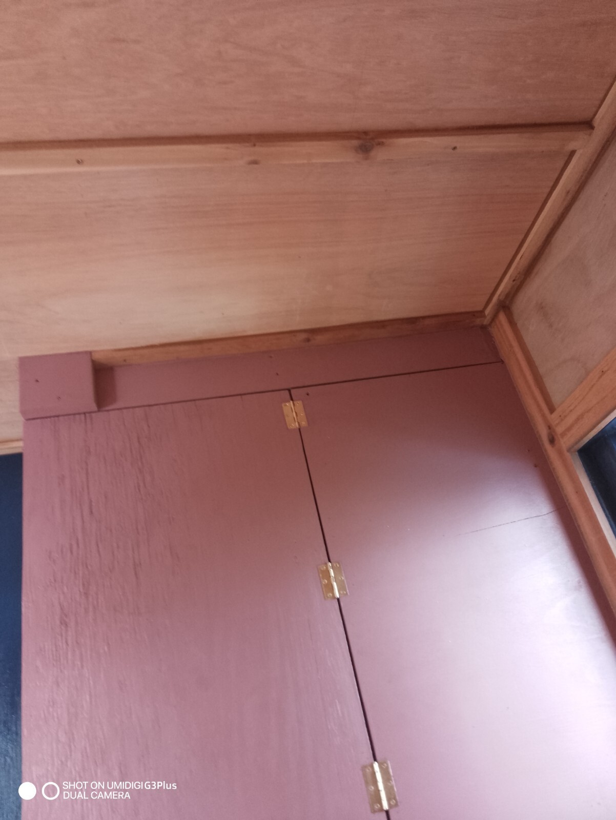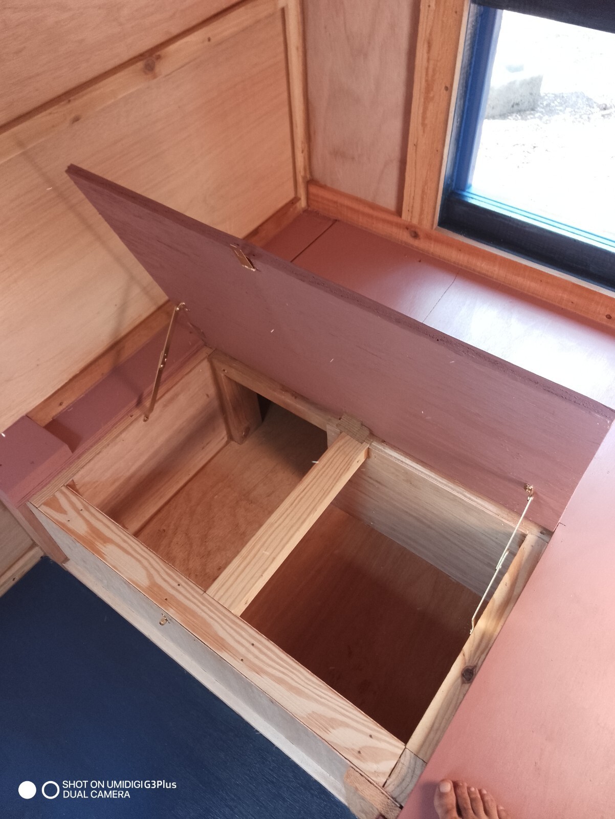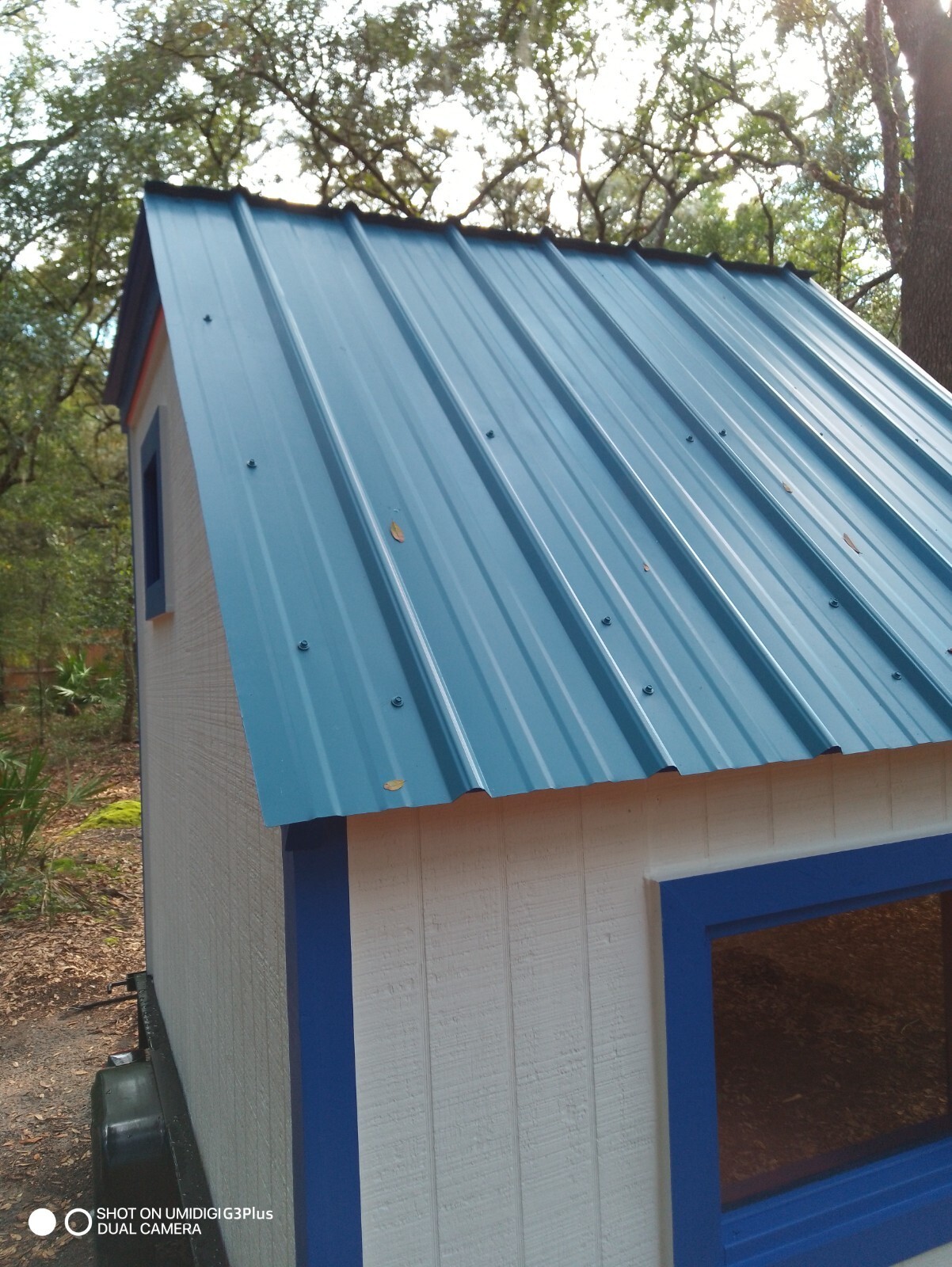 Standard 15/32 OSB was used under the metal roof. Extra heavy and thick caulking was used to impregnate all joints. The two side windows open but the front window is fixed. All of them, custom-made with a single pane. The side windows open inward and can be held up to the ceiling with latches I installed.