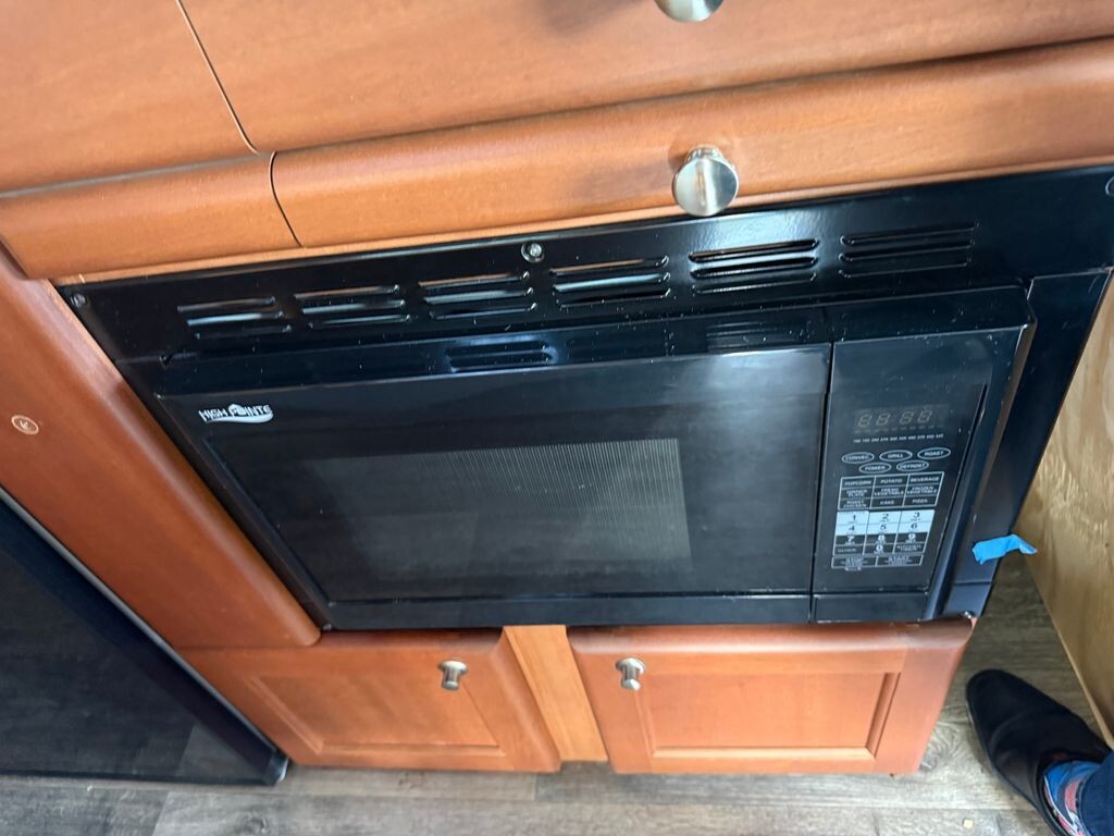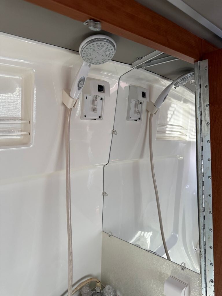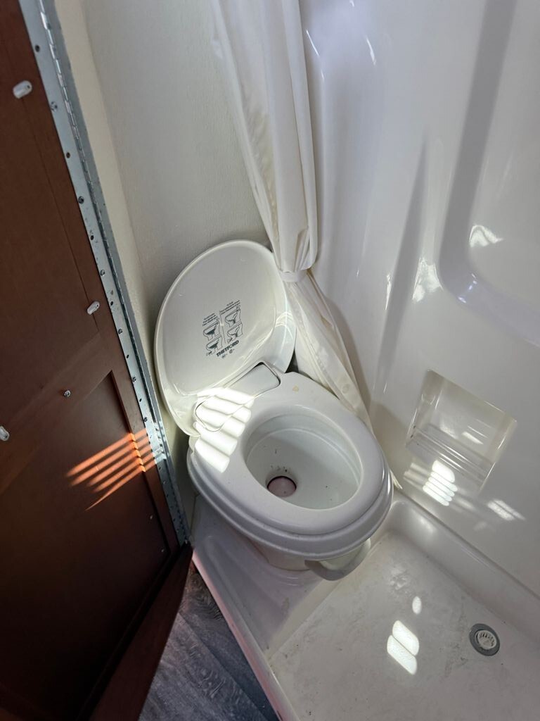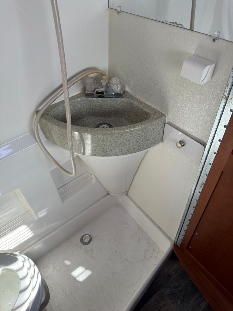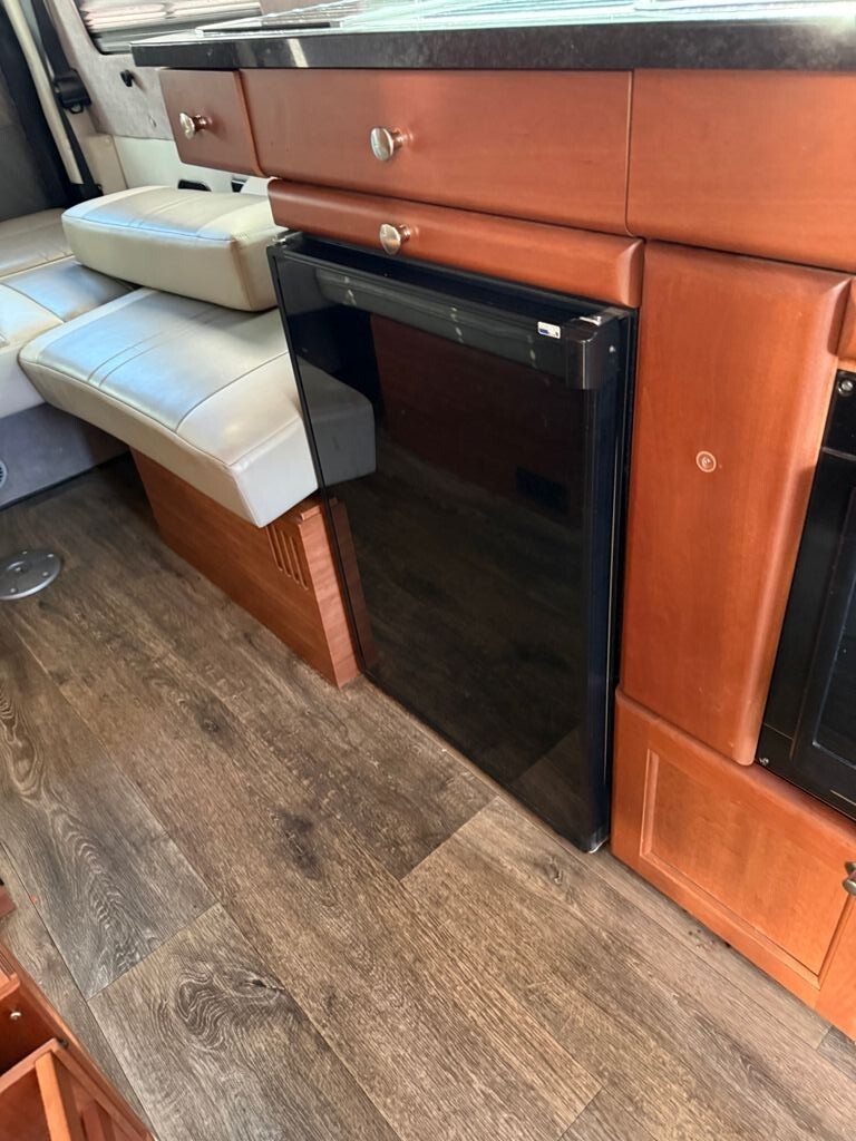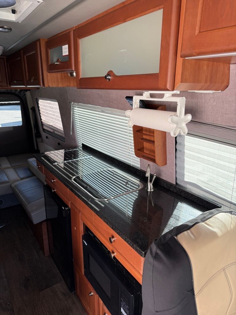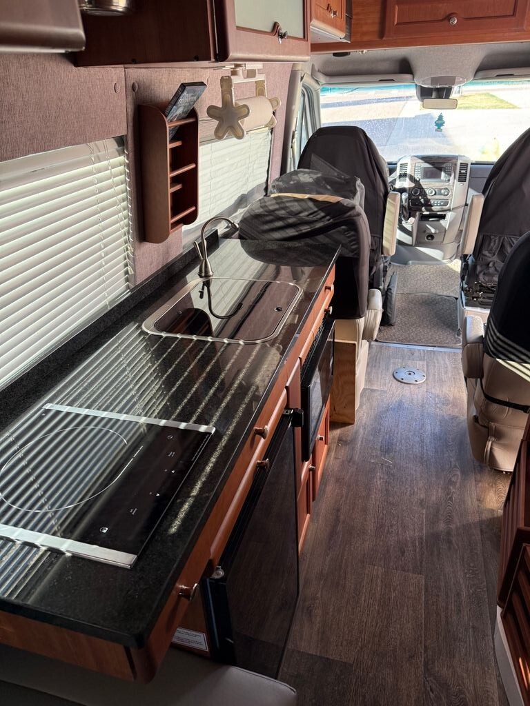 The fully equipped galley makes cooking on the road easy with a flush-mounted induction cooktop, refrigerator, microwave, sink, and ample cabinet storage. A permanently enclosed bathroom with shower, sink, and toilet provides the privacy and convenience of home while traveling.