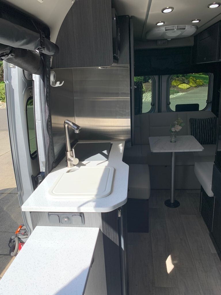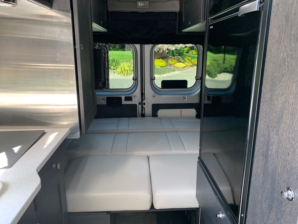 The galley is designed for real cooking on the road, featuring a 2-burner inversion unit, large refrigerator, microwave, and a full-height pantry for maximum storage. A 24" smart TV keeps you entertained wherever you land.