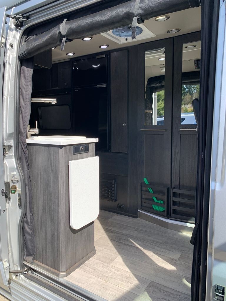 Exterior upgrades make this van even more adventure-ready, including a full-size spare tire mounted on the rear left door, a 12' power awning (canopy), magnetic rear door screens for airflow without bugs, and an outdoor shower for easy clean-up after a day outside.