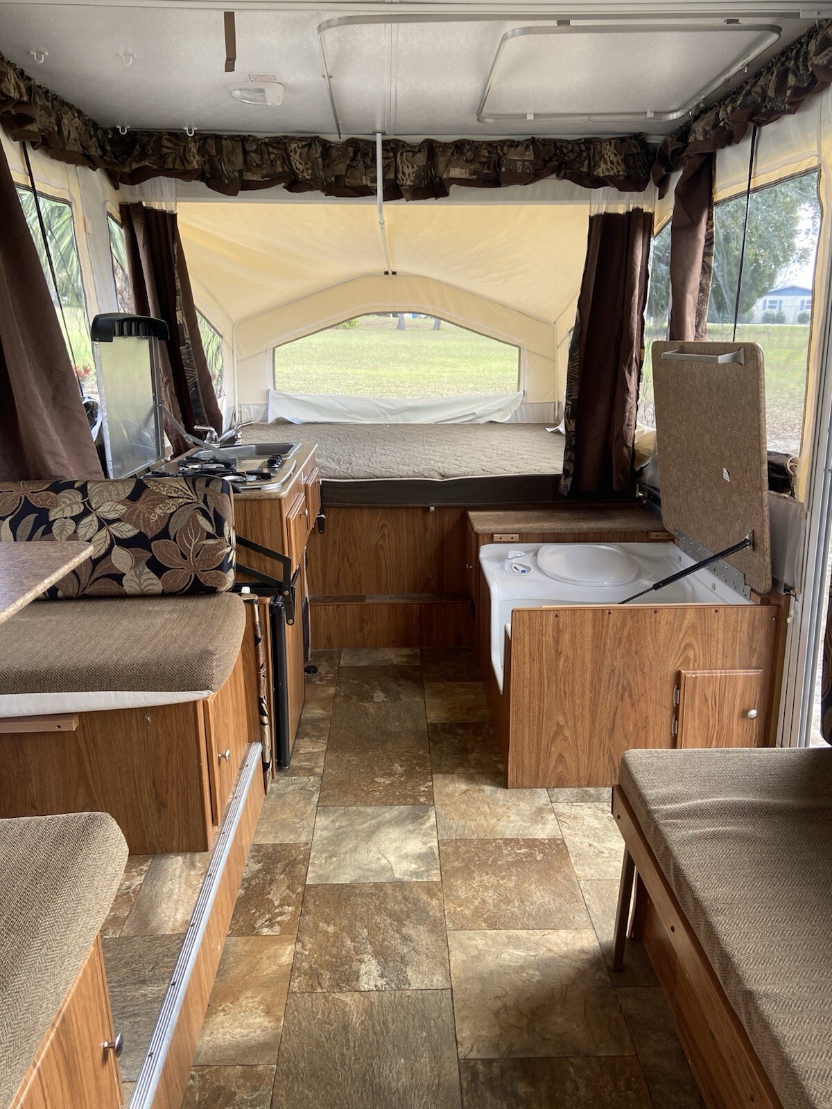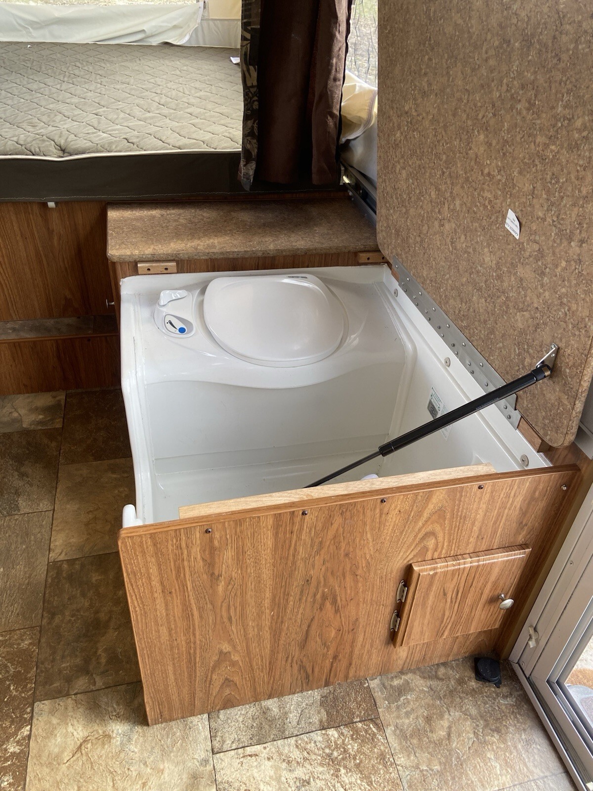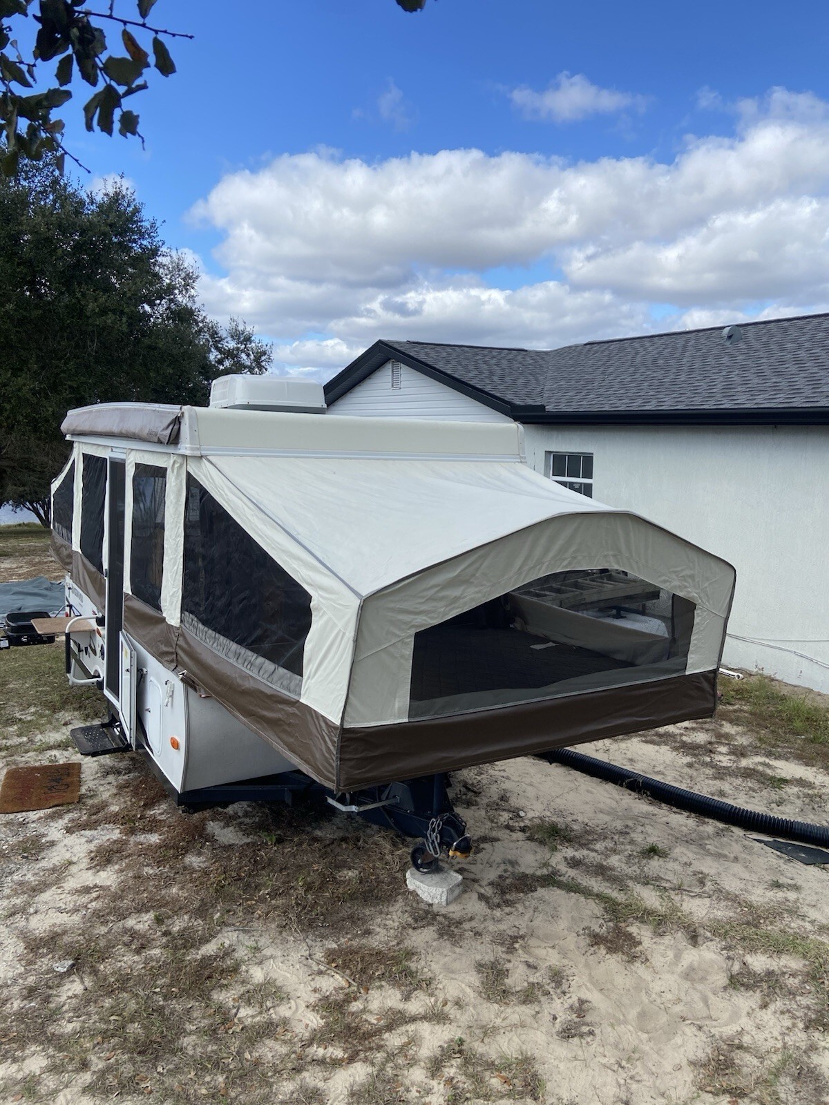 2013 like new condition, no leaks and always sheltered or covered from the elements. Also comes with four seasons cover and all plumbing and electrical attachments. Canvas is also in like new condition, always treated and sealed .23 feet open, 17 feet closed, and box size is 12 feet. Gas heater, Air conditioner serviced and works great.Bathroom shower combo works great although hardly ever used, toilet has never been used except for little boys having to pee at 2:00 a.m. One king size bed and one queen size bed, both are heated mattresses, three way fridge, inside and outside gas stoves. All screens have no holes. Some upgrades include bottom floor of camper has been sealed to prevent moisture and rot. Unreliable electric winch has been upgraded back to factory manual winch. Four stabilizing jacks and awning in good shape with no holes. One new tire and one new spare including bearing buddies. Axel also has electric brakes that have never been used.