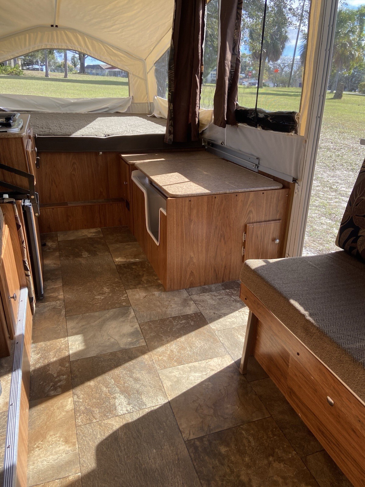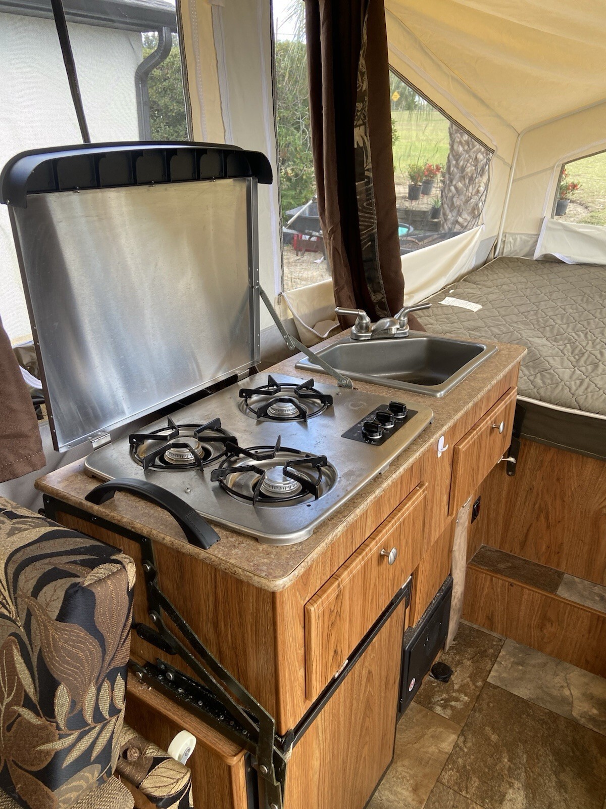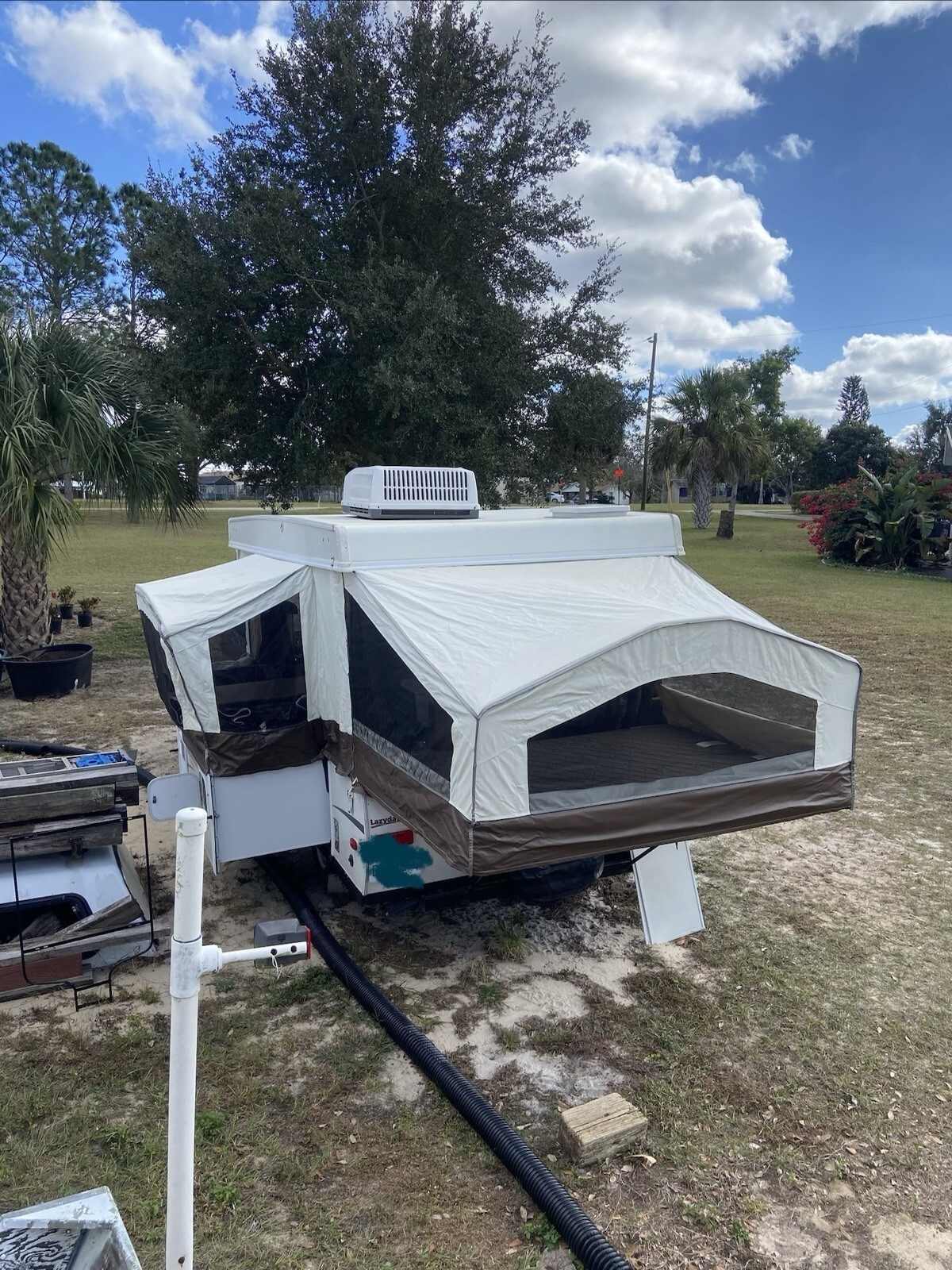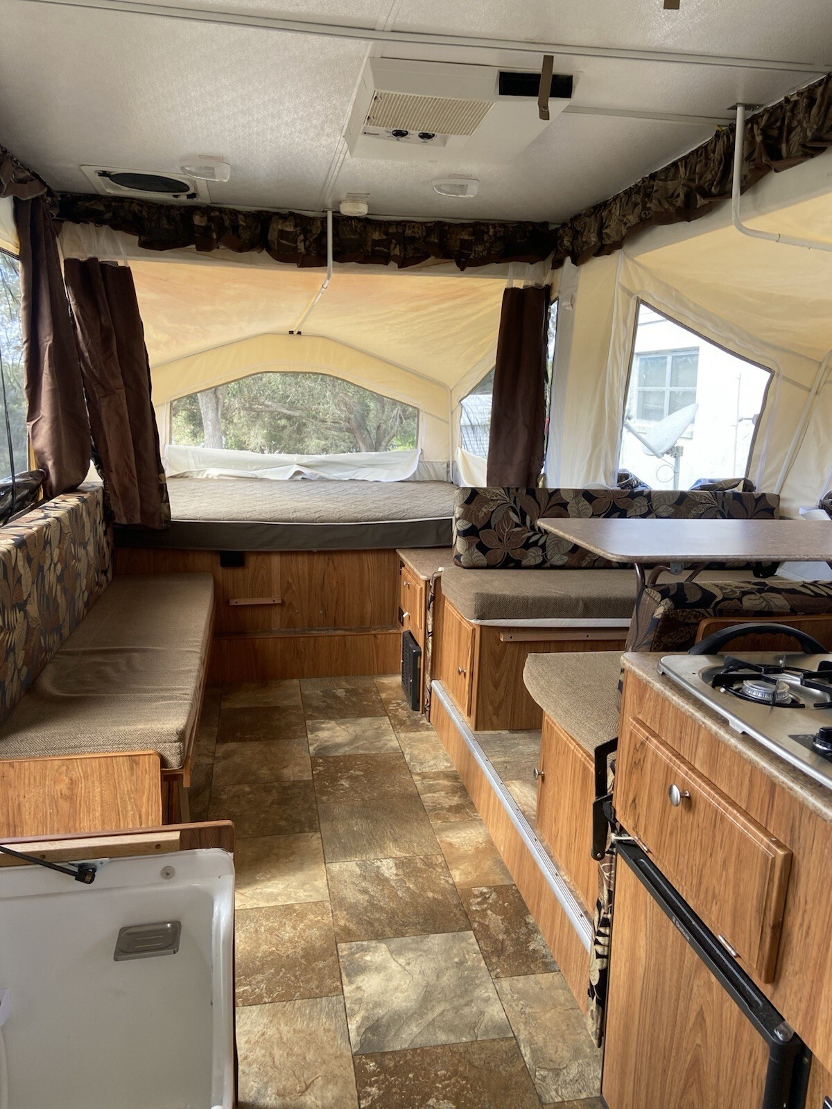 2013 like new condition, no leaks and always sheltered or covered from the elements. Also comes with four seasons cover and all plumbing and electrical attachments. Canvas is also in like new condition, always treated and sealed .23 feet open, 17 feet closed, and box size is 12 feet. Gas heater, Air conditioner serviced and works great.Bathroom shower combo works great although hardly ever used, toilet has never been used except for little boys having to pee at 2:00 a.m. One king size bed and one queen size bed, both are heated mattresses, three way fridge, inside and outside gas stoves. All screens have no holes. Some upgrades include bottom floor of camper has been sealed to prevent moisture and rot. Unreliable electric winch has been upgraded back to factory manual winch. Four stabilizing jacks and awning in good shape with no holes. One new tire and one new spare including bearing buddies. Axel also has electric brakes that have never been used.