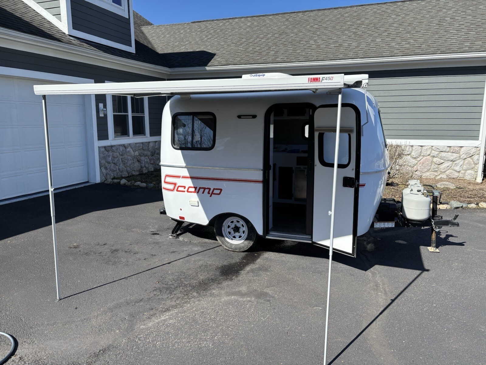 Exterior & Power Features* Brand New Awning: Just installed and ready for the season.* Power Setup: Upgraded battery box with a dedicated connector for external solar panels.* Brand New Group 27 Battery* Propane: Dual propane tank setup for extended trips.* Towing: Lightweight and easy to tow with most small SUVs or crossovers.Interior & Comfort* Layout 1: Features the front sofa that converts into bunk beds and a rear dinette that converts into a large bed. Large closet. No bathroom no mess, black water etc.* Heating: Factory furnace installed for those chilly nights.* Condition: interior finishes, cushions, and appliances are in excellent condition.* Includes Scamp storage cover.* Includes Tow Bar.