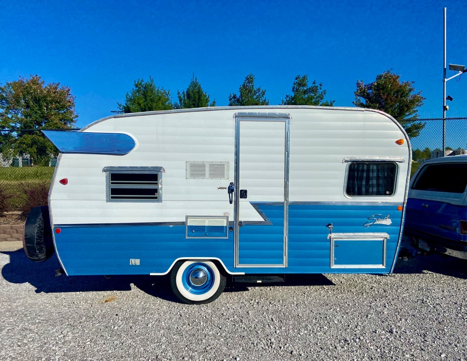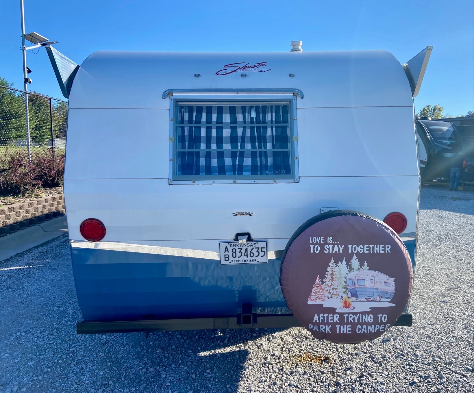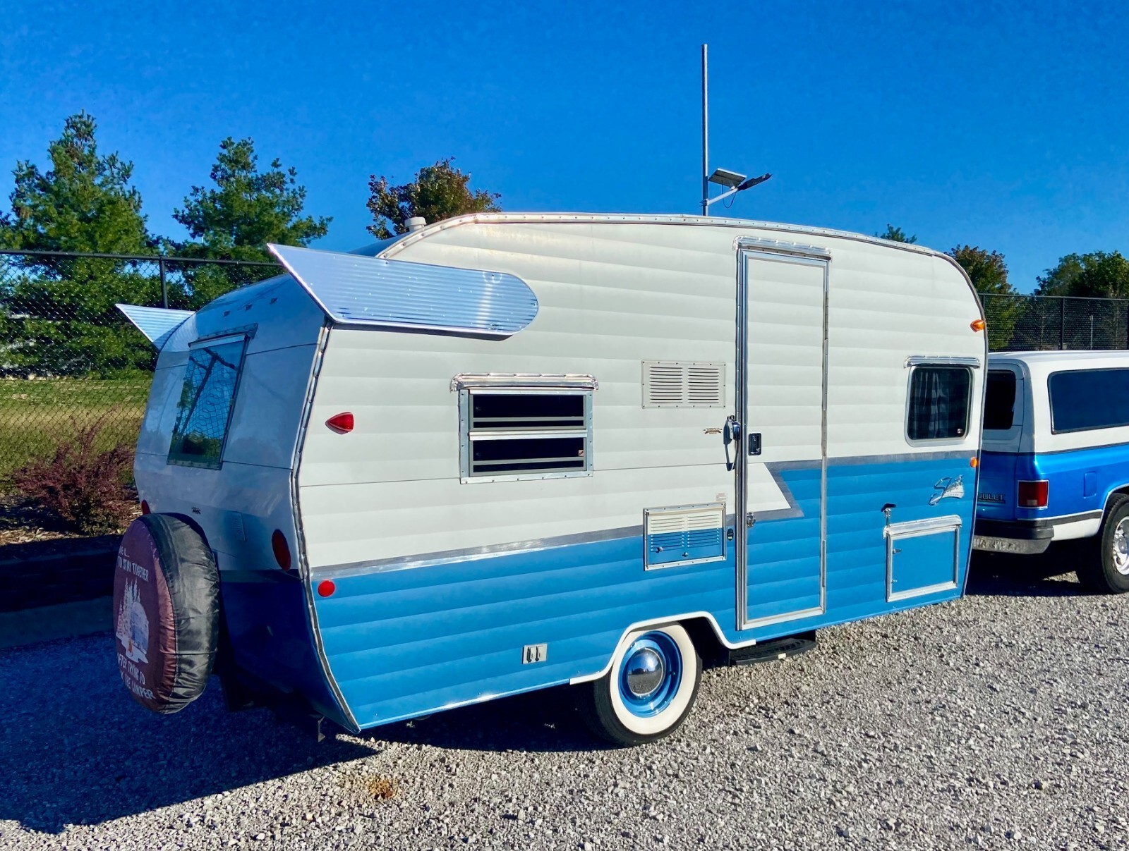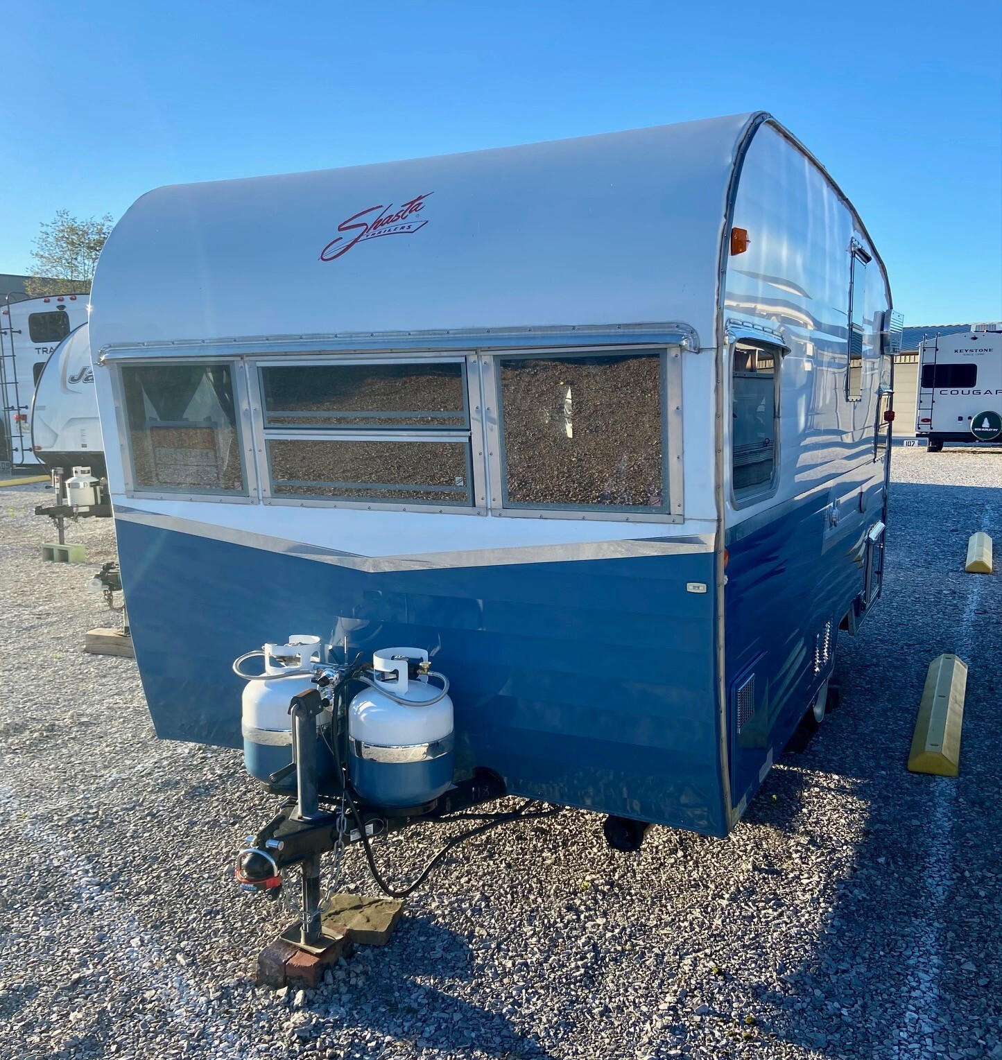 In 2015 Shasta created a nearly exact replica of a 1961 Shasta Airflyte 16SC travel trailer with a few modern upgrades. Shasta ran a limited construction of 1,941 Special Edition trailers and this one is #118. They came in three colors and this one was originally Matador Red, however we had it professionally painted Blue with high quality automotive paint to match our tow vehicle. The interior cushions are still red. Black and White stripped canopy that looks brand new.
