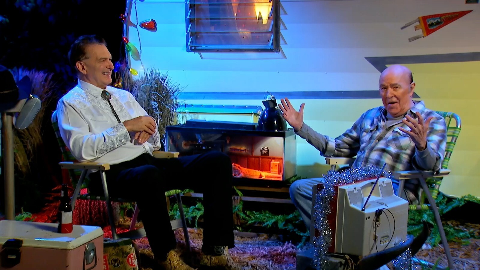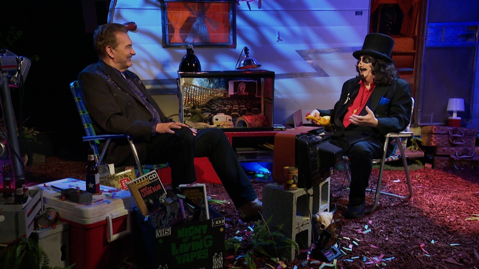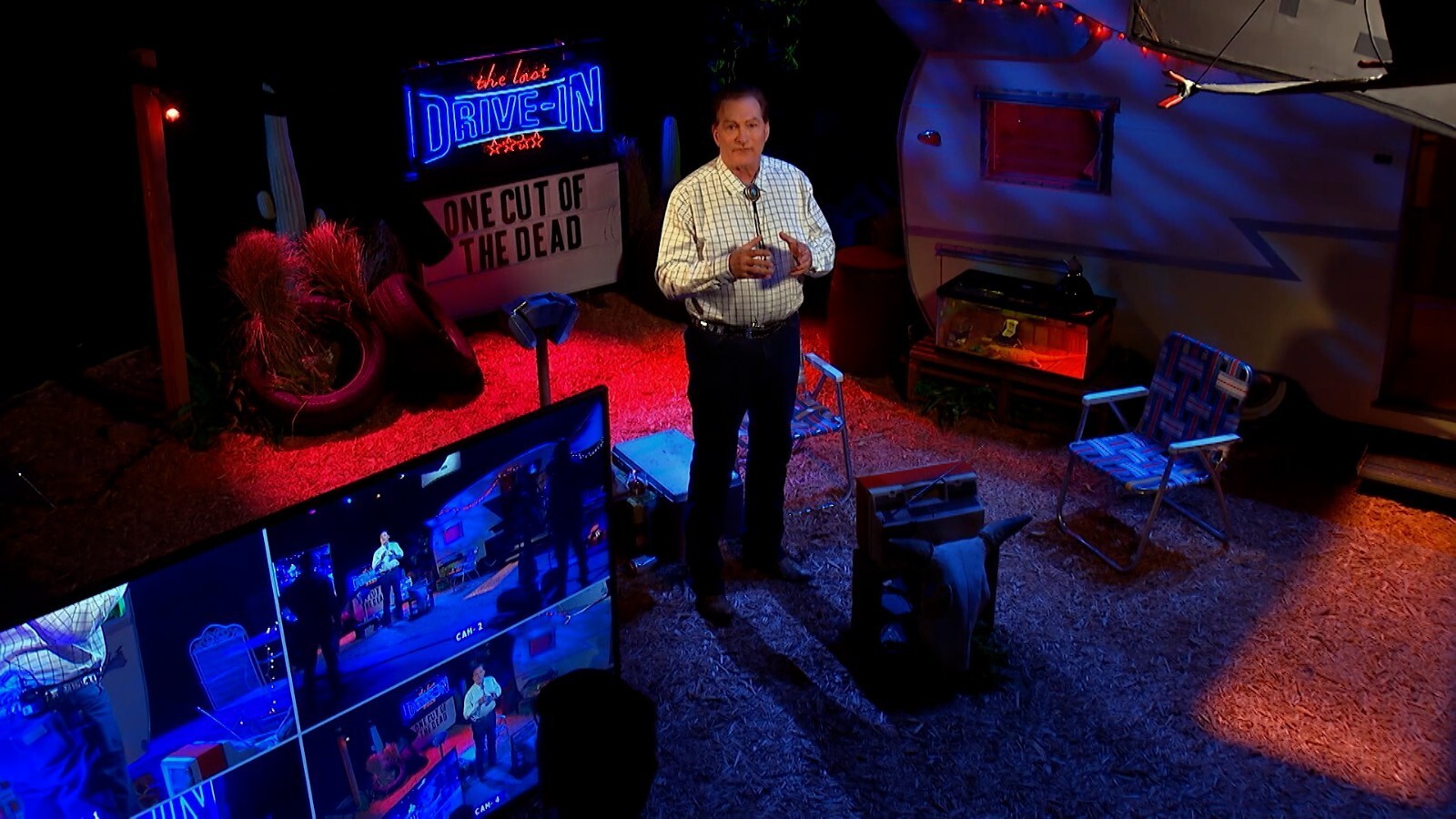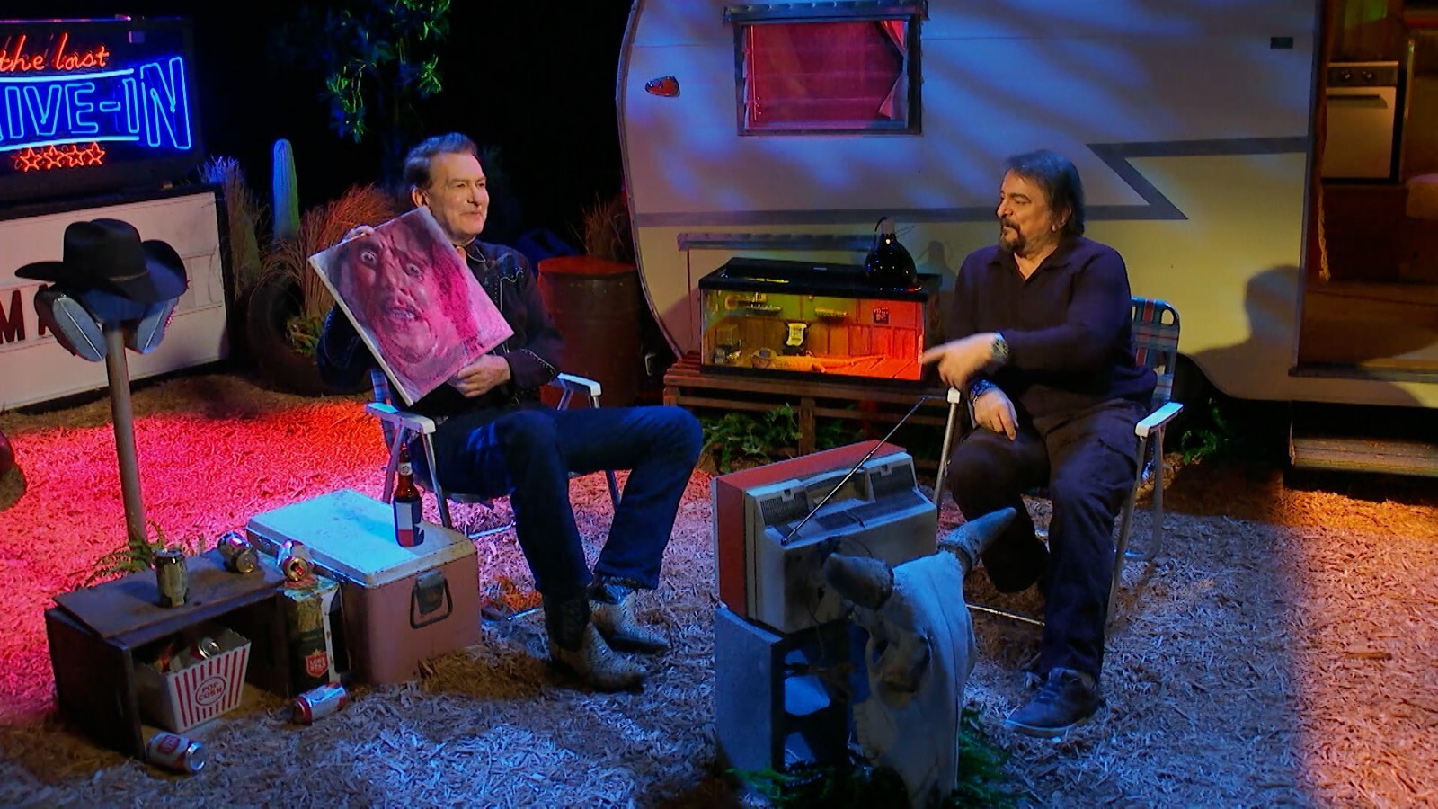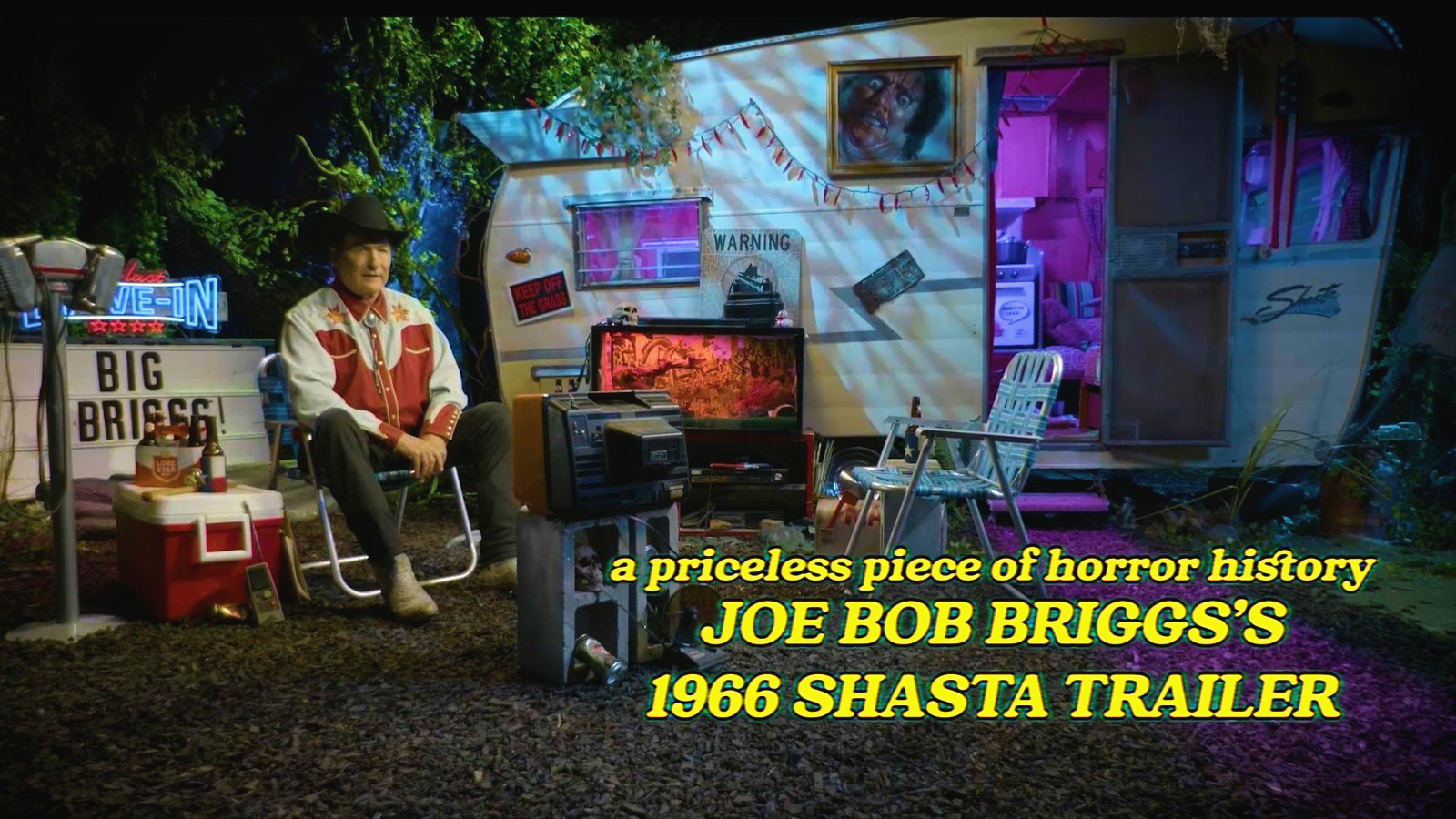 This retro, canary-yellow 1966 Shasta Airflyte Trailer has appeared in ALL seven seasons of THE LAST DRIVE-IN WITH JOE BOB BRIGGS. From his trailer-side lawn-chair throne, the world's greatest drive-in movie host has rattled off countless dead bodies, interviewed dozens of horror luminaries, and taken us to school about genre-film history. This now-iconic trailer is the centerpiece to the show's exterior set and also an echo of the set designs featured in Monstervision and Drive-In Theater.