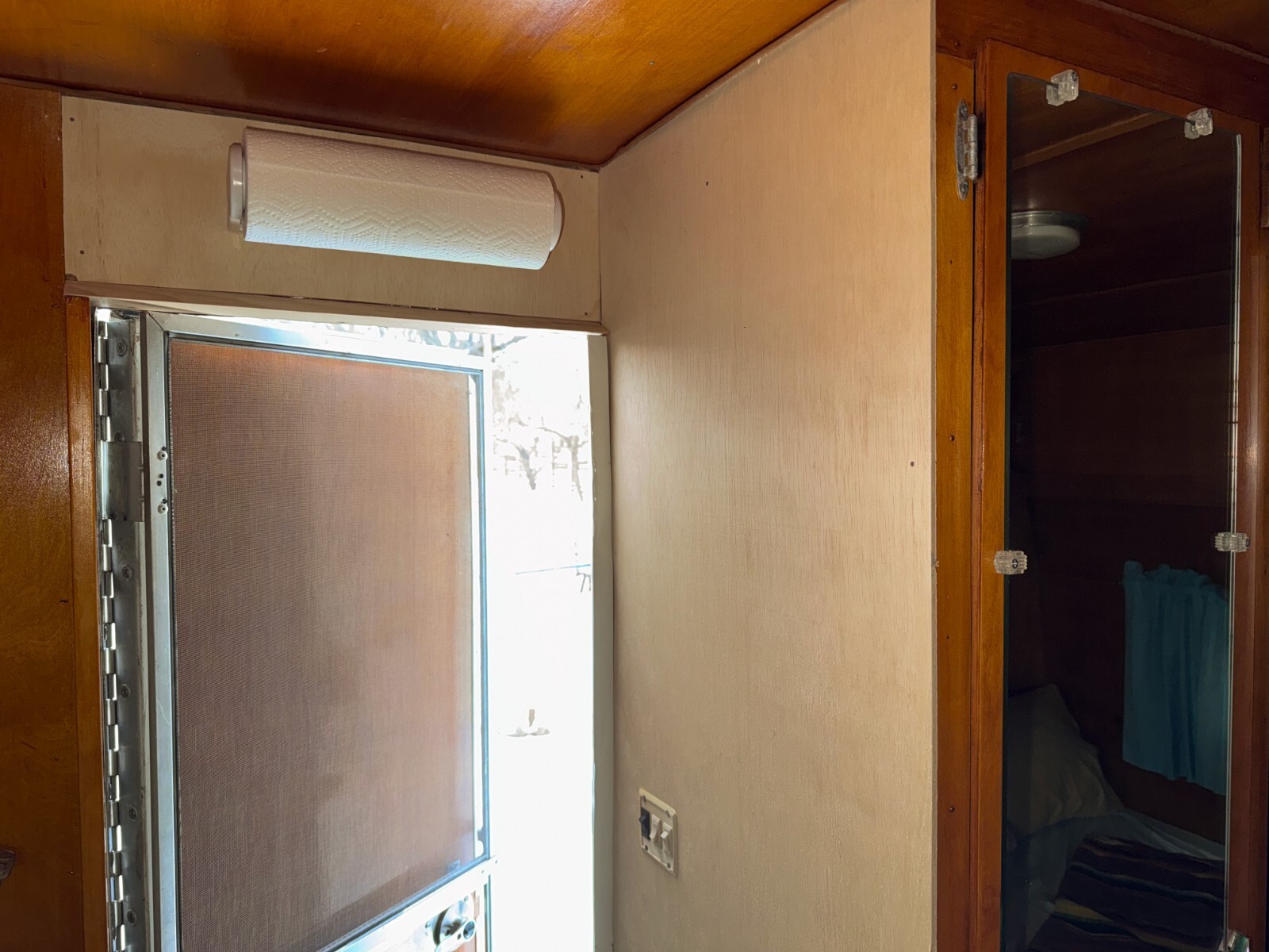 The trailer is currently water-tight. We know this because... there was a leak. After identifying its origin and repairing the leak (along the door frame) we installed some unvarnished 'placeholder' wall paneling, since I lack the skills required to perform a final repair the way it should be. We've since spent numerous rainy nights in the camper since and there are no leaks! Photos of the 'placeholder' panels are included -- let me know if you have any questions.