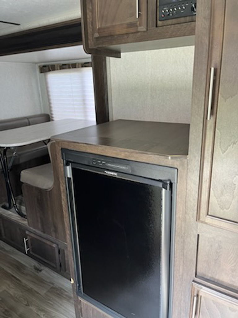 Step inside and experience a modern, upscale interior featuring hardwood cabinet doors, rich finishes, and a clean, functional layout. The rear kitchen is a true standout, offering generous counter space, a deep stainless sink, 2-burner cooktop, convection microwave, and a spacious refrigerator giving you everything you need to cook comfortably on the road.