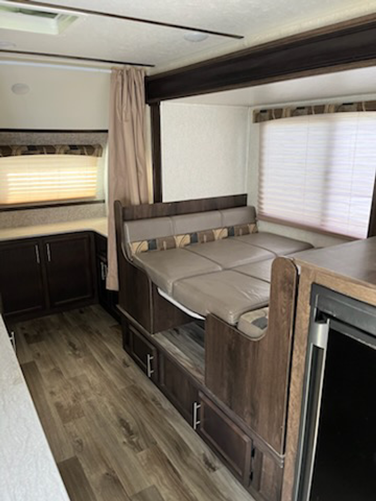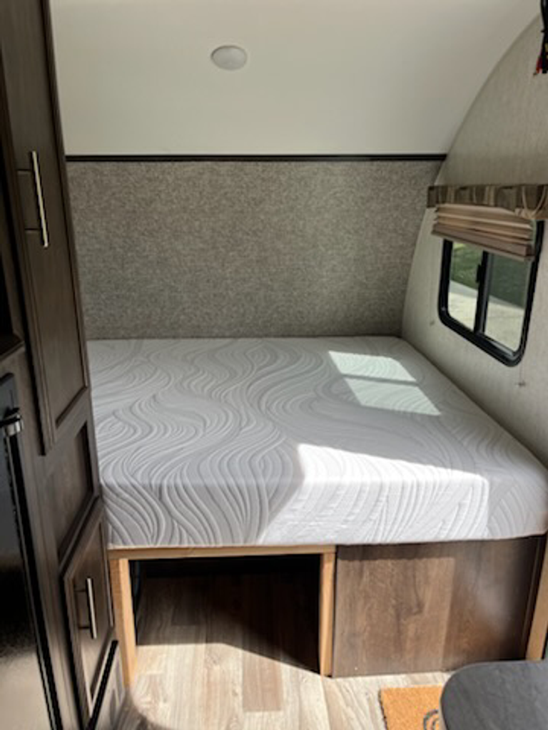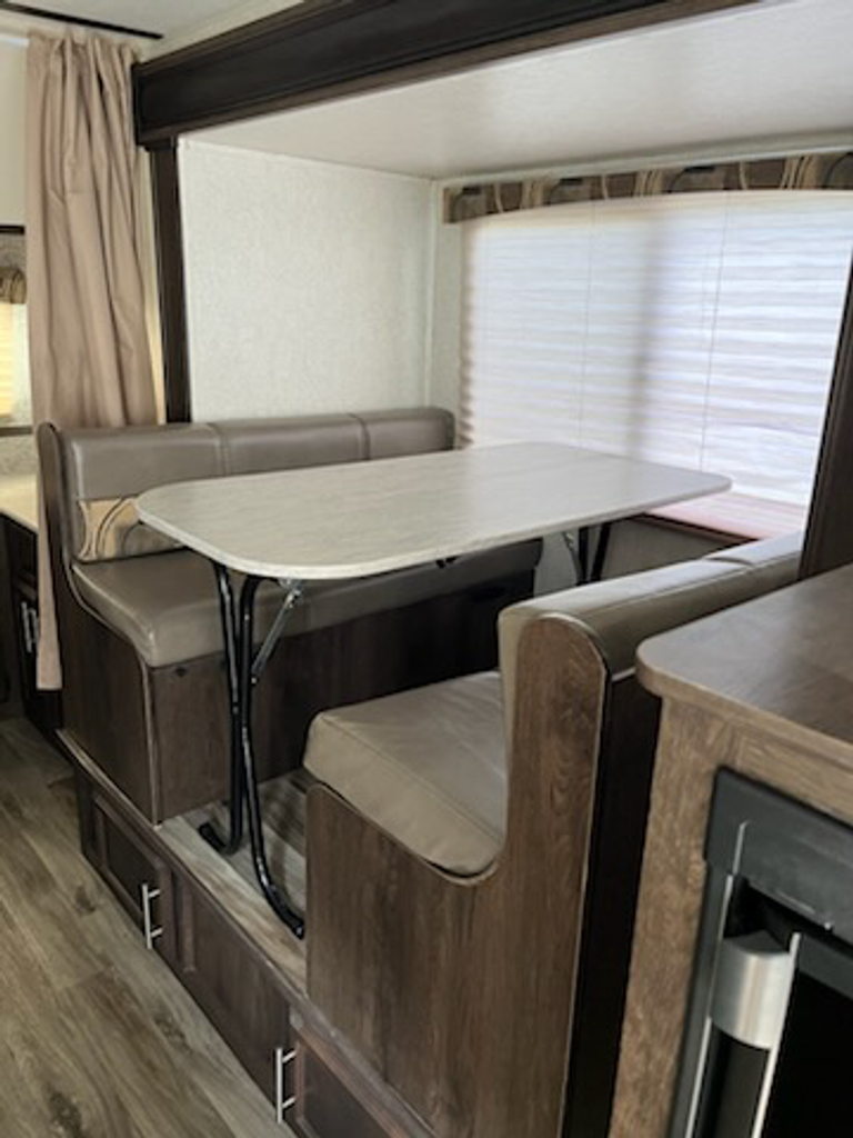 The booth dinette creates a versatile space for dining, relaxing, or planning your next destination, and quickly converts into additional sleeping space when needed. Up front, enjoy a true queen-sized bed with surrounding storage, delivering comfort and convenience after a long day of adventure.