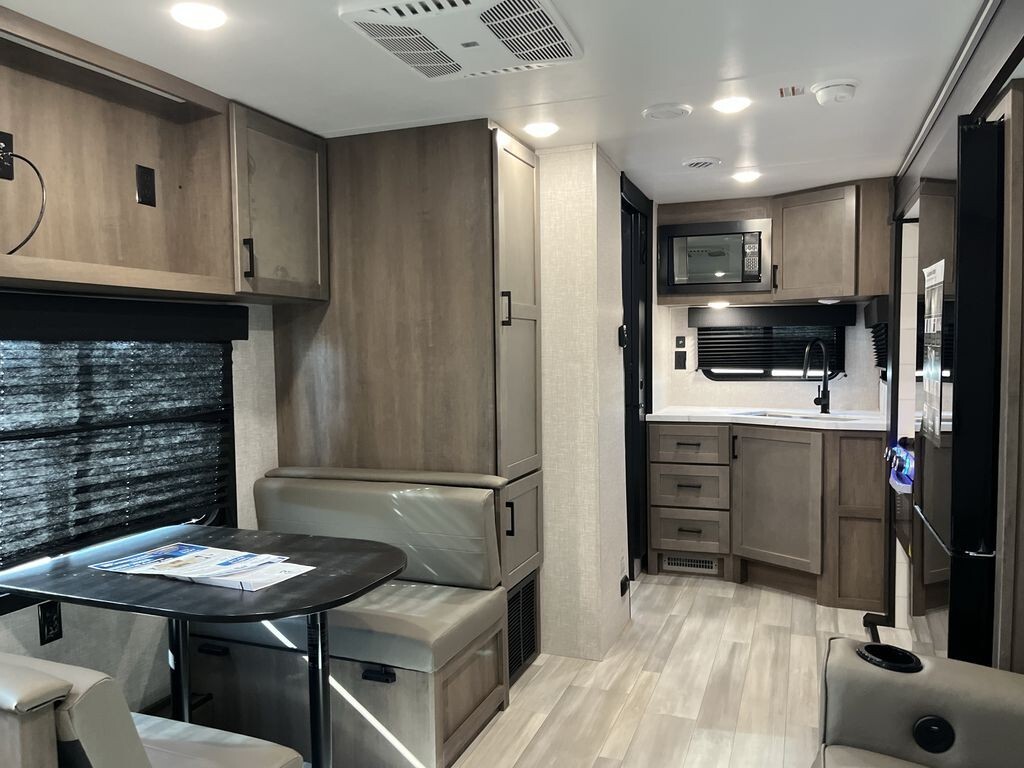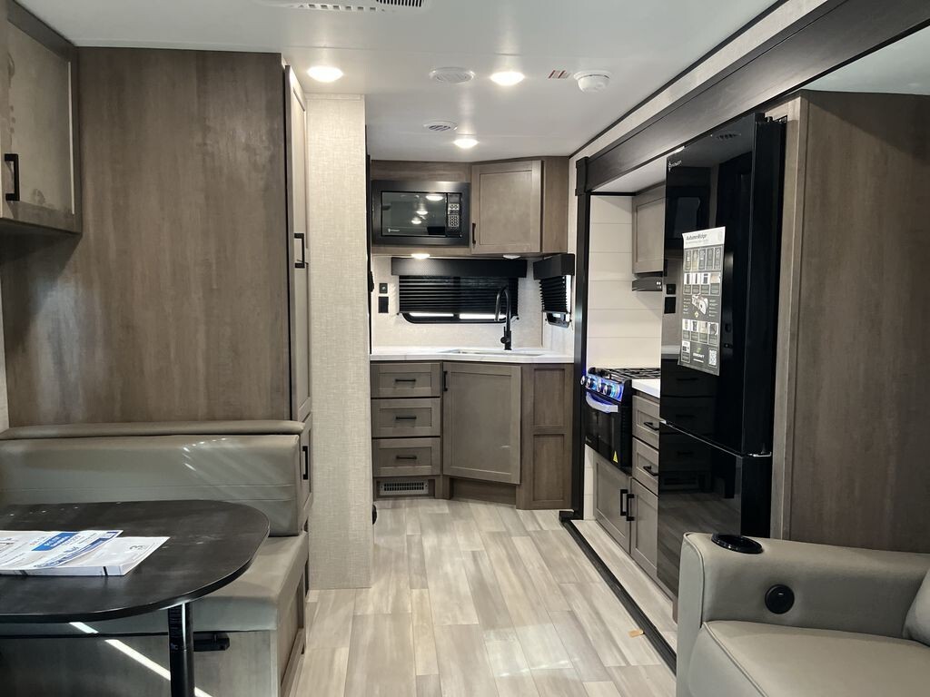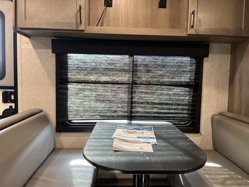 Inside, the 22MLS features a welcoming living area with residential-style furniture and large panoramic windows that fill the space with natural light. The kitchen is equipped with a deep stainless steel sink, a three-burner stovetop, and a high-efficiency refrigerator, providing all the essentials for meal preparation. Generous counter space and ample storage make cooking on the go both easy and enjoyable.