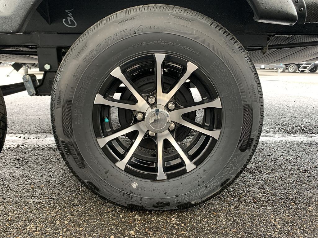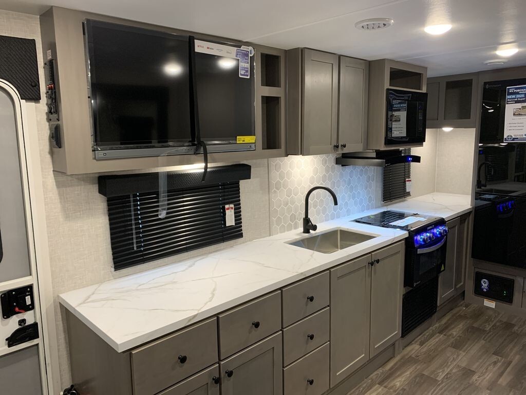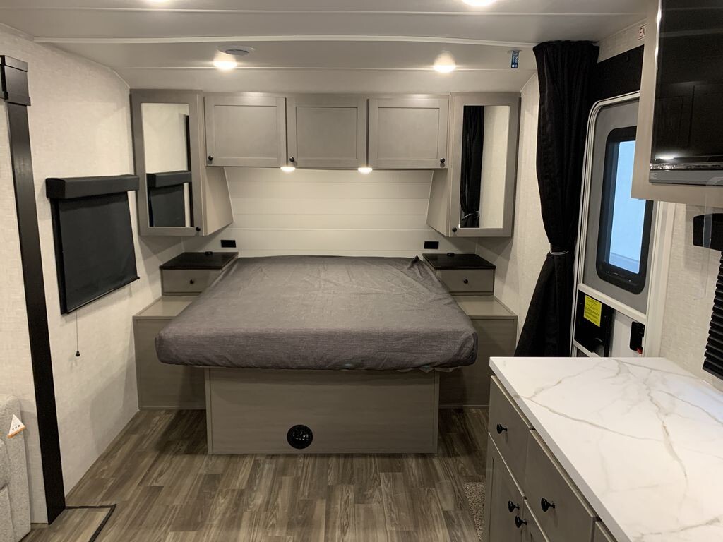 Measuring 25 feet 2 inches in length and weighing approximately 5,035 pounds, the 189RG is both compact and spacious. Its aerodynamic exterior enhances fuel efficiency, while the durable fiberglass construction ensures longevity. The trailer features a 16-foot power awning with LED lighting, providing a comfortable outdoor living space. Solid swing-down entry steps offer easy access, and the enclosed docking station keeps all main hookups protected from the elements.
