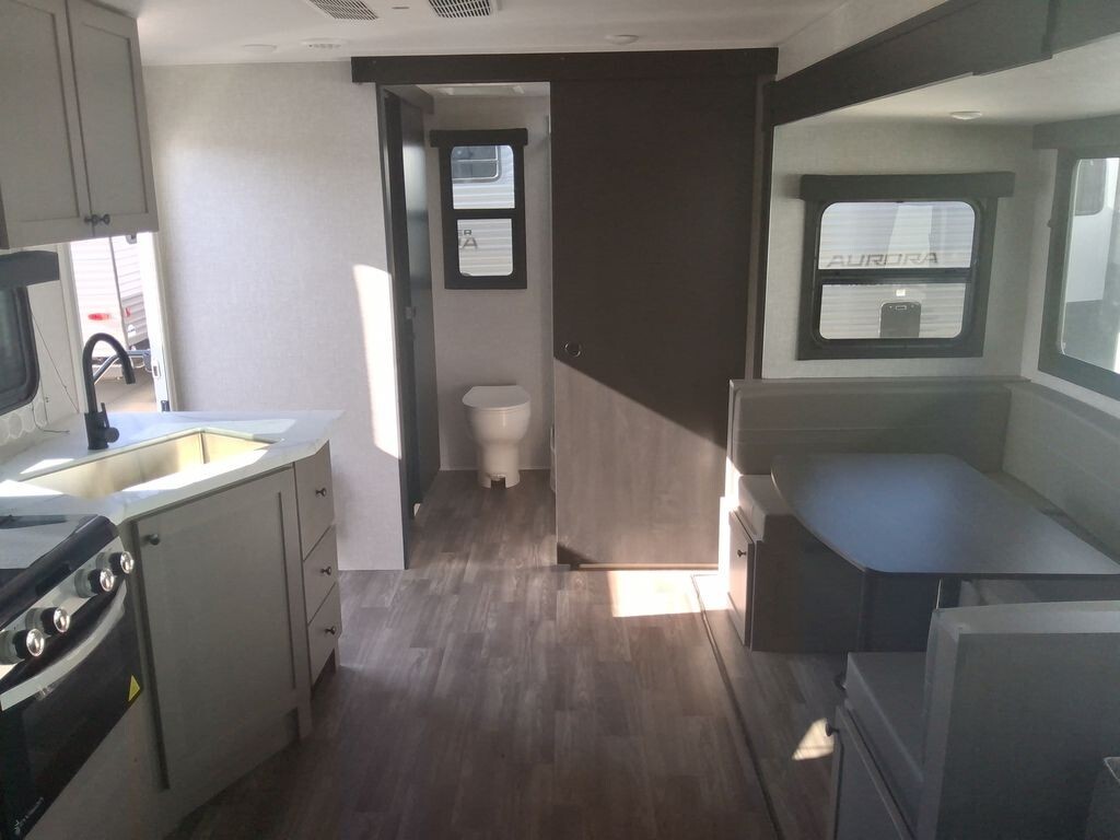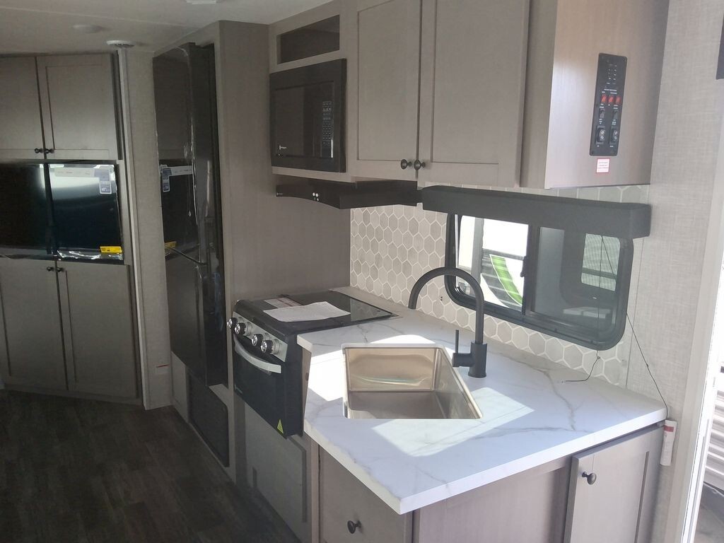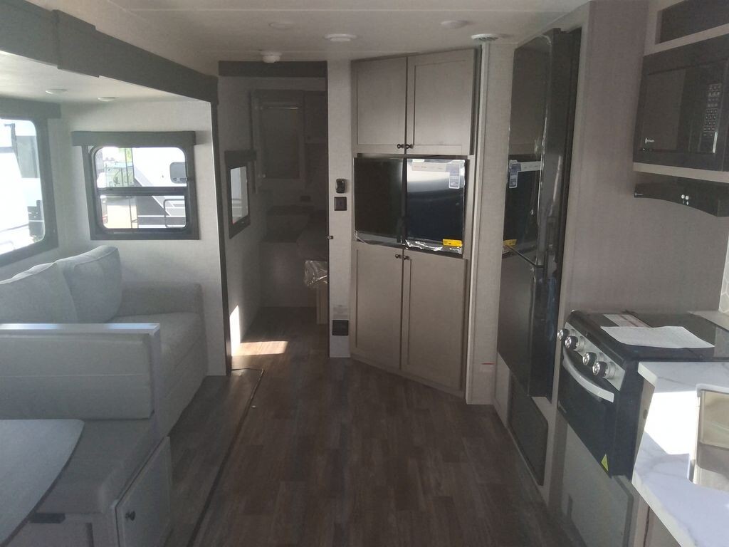 Inside, the 252RB features an open floor plan with a single slide-out that expands the living area, providing ample space for relaxation and entertainment. The living area includes a comfortable tri-fold sofa and a U-shaped dinette, both of which can convert into additional sleeping spaces, accommodating up to six people.