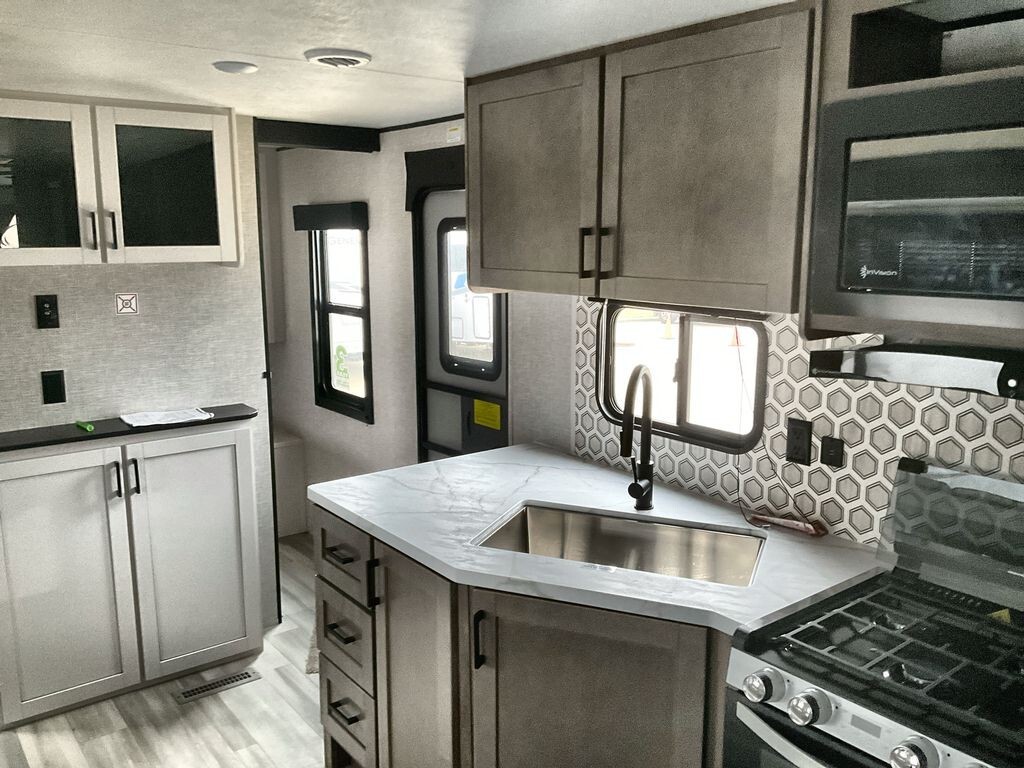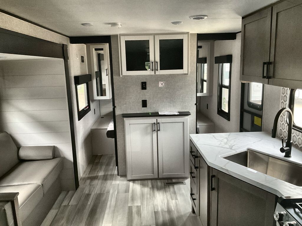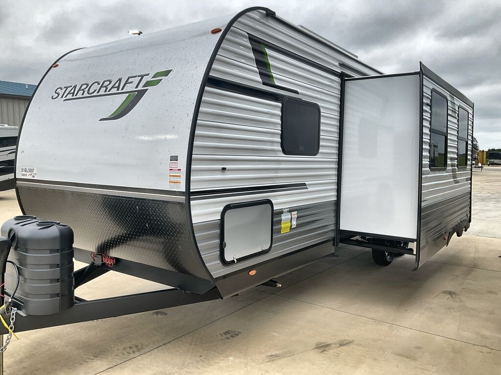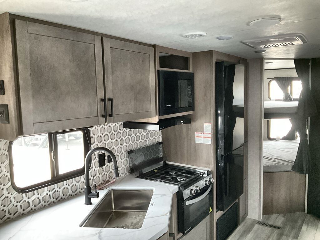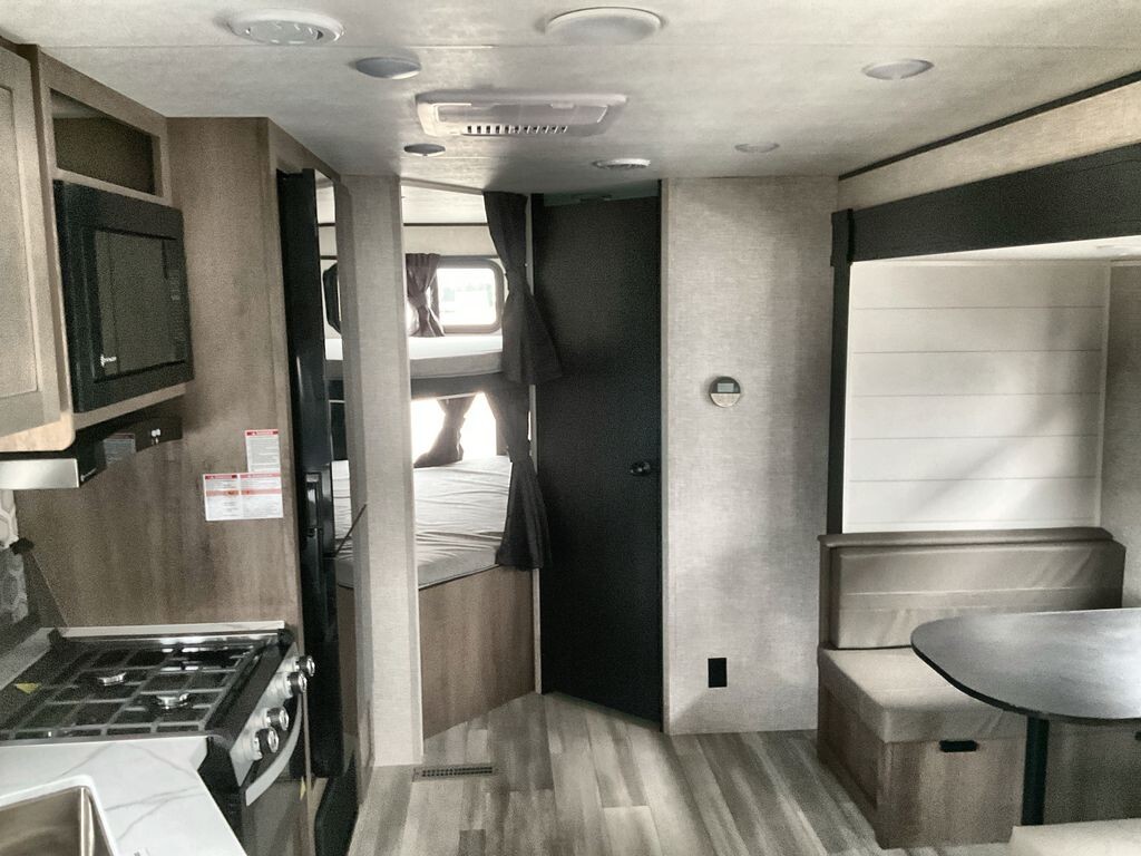 The 2025 Starcraft Autumn Ridge 26BHS is a spacious and well-equipped travel trailer designed to comfortably accommodate families and groups. With a length of 30 feet 8 inches and an interior height of 6 feet 9 inches, it offers ample space for relaxation and activities. The trailer has a dry weight of 5,820 lbs and a payload capacity of 2,080 lbs, making it suitable for various travel needs. It features a 16-foot power retractable awning with LED lighting, providing a comfortable outdoor space. The interior is thoughtfully designed with a front private bedroom that includes a queen-size bed and dual wardrobes. The rear houses double-over-double bunk beds with privacy curtains, ideal for children or guests. The living area includes a jackknife sofa and a booth dinette within the slide-out, both convertible for additional sleeping space. The kitchen is equipped with a three-burner stove with glass cover, a 17-inch oven, microwave, and a