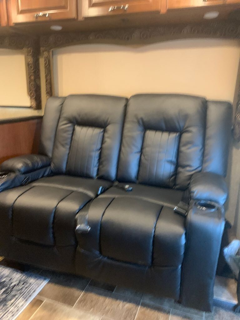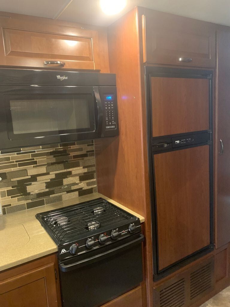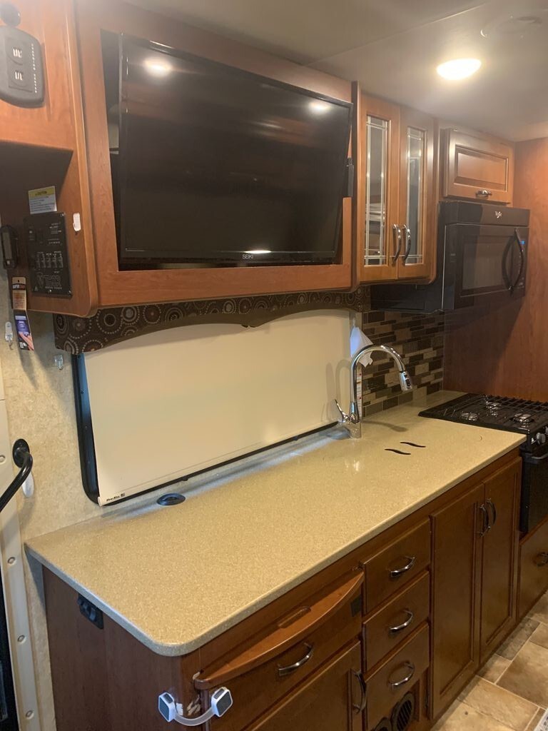 Step inside to a thoughtfully designed interior that feels spacious and inviting. The original jackknife sofa has been upgraded to a dual recliner, creating a more comfortable lounging experience. Sleeping accommodations include a queen bed with a new mattress, a roomy over-cab bunk, and ample storage throughout.