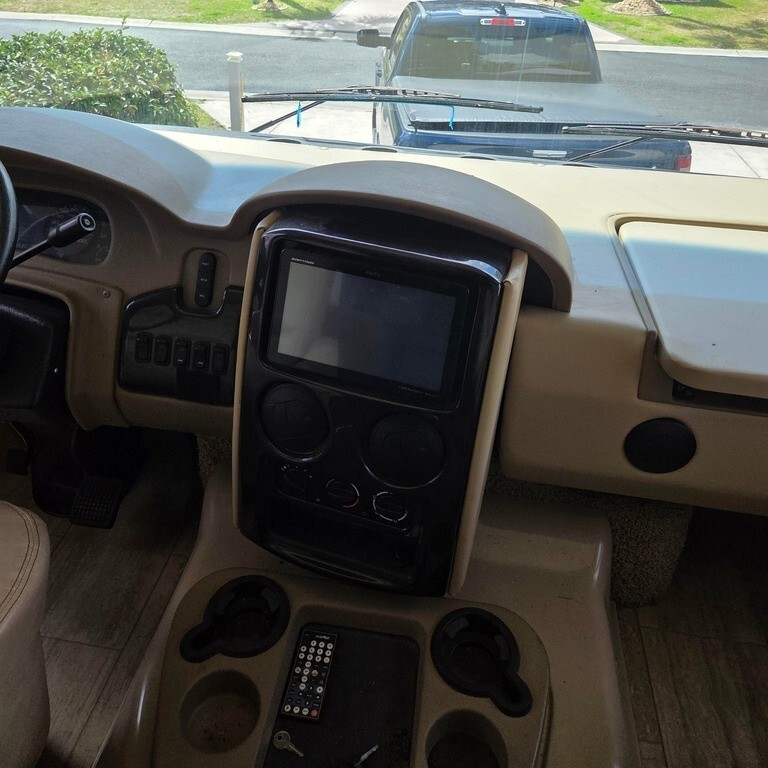 This Thor is powered by a 6.8L V10 engine and a 6-speed automatic transmission with 14,400 miles. The overall length is 38.75 feet, and it comes equipped with 3 power-retractable slide-outs with toppers, 2 power awnings, 2 A/C units, an Onan generator, 1½ baths, a fireplace, an outdoor entertainment system, and room to sleep up to 8. This unit has been well-maintained.