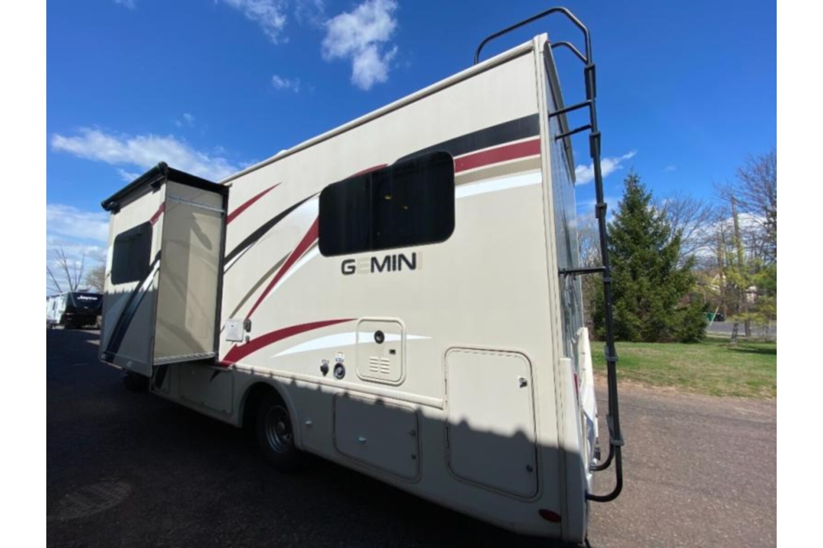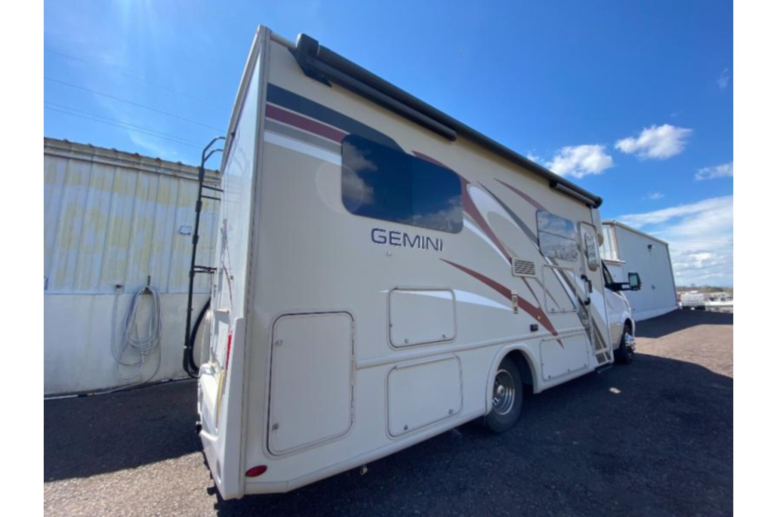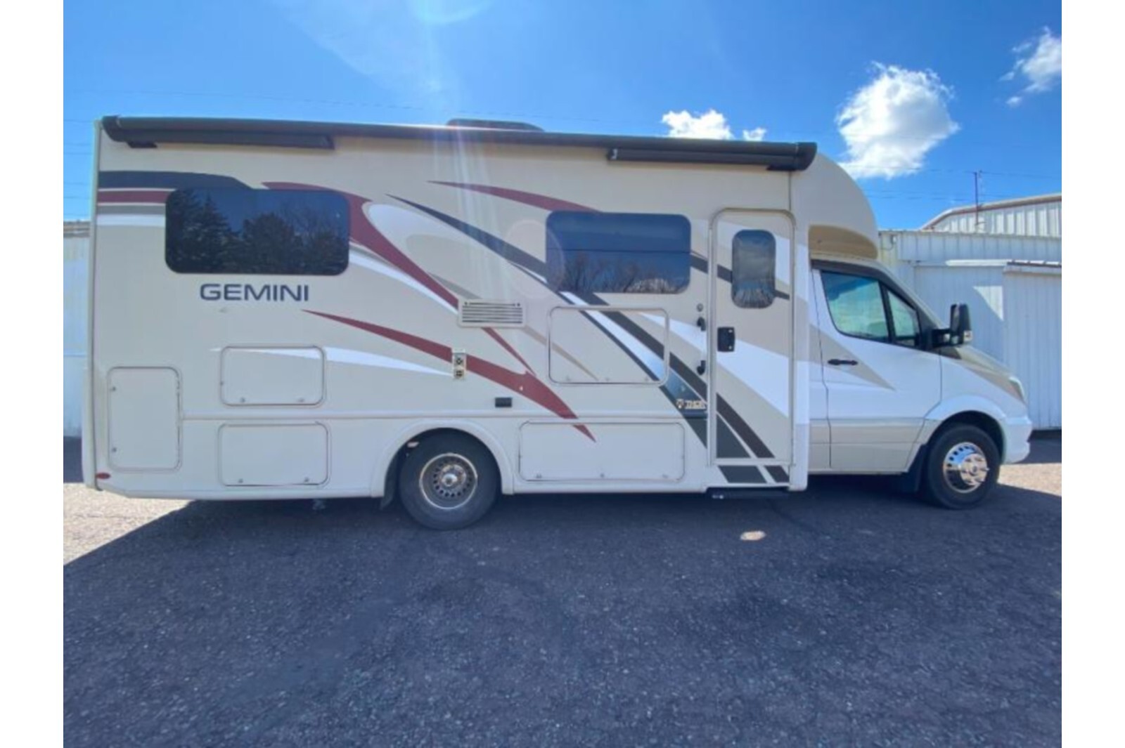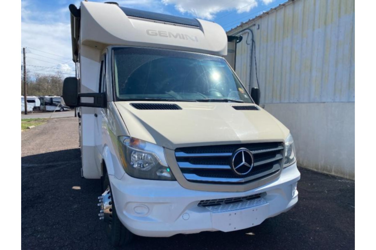 Experience comfortable and stylish travel with this 2019 Thor Motor Coach Gemini 24LP Class C diesel motorhome. With 24,118 miles, this well-maintained coach features a single slide-out, two twin beds that convert into a king-size bed, and a 58" sofa bed, comfortably sleeping up to 4. The spacious interior is brightened by a large skylight above the cab and modern LED lighting throughout. The full bathroom includes a neo-angled 27" x 27" shower, while the kitchen is equipped with a 2-burner cooktop and convection microwave for easy meal preparation. Enjoy outdoor entertainment, a power patio awning with integrated LED lights, and ample storage with Rotocast compartments. With a GVWR of 11,030 lbs, Vacu-Bond laminated construction, and a diesel engine, this 26-foot motorhome is perfect for your next adventure.