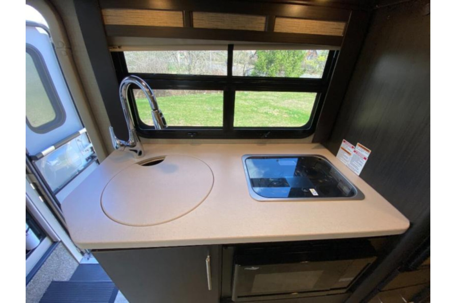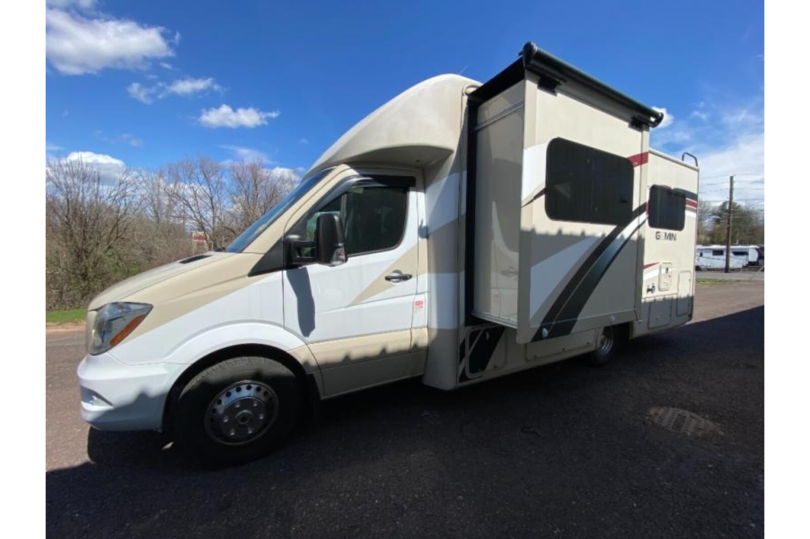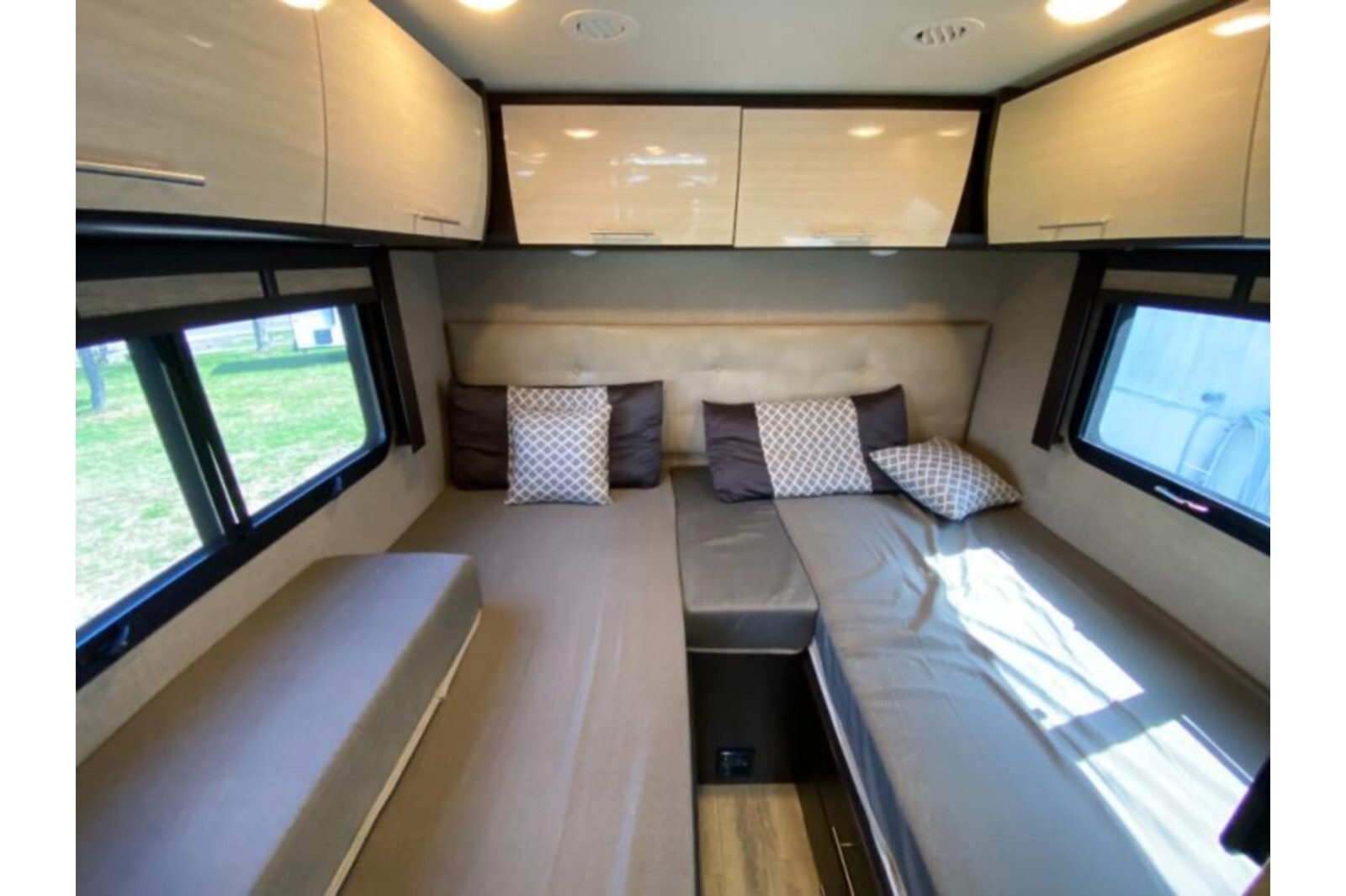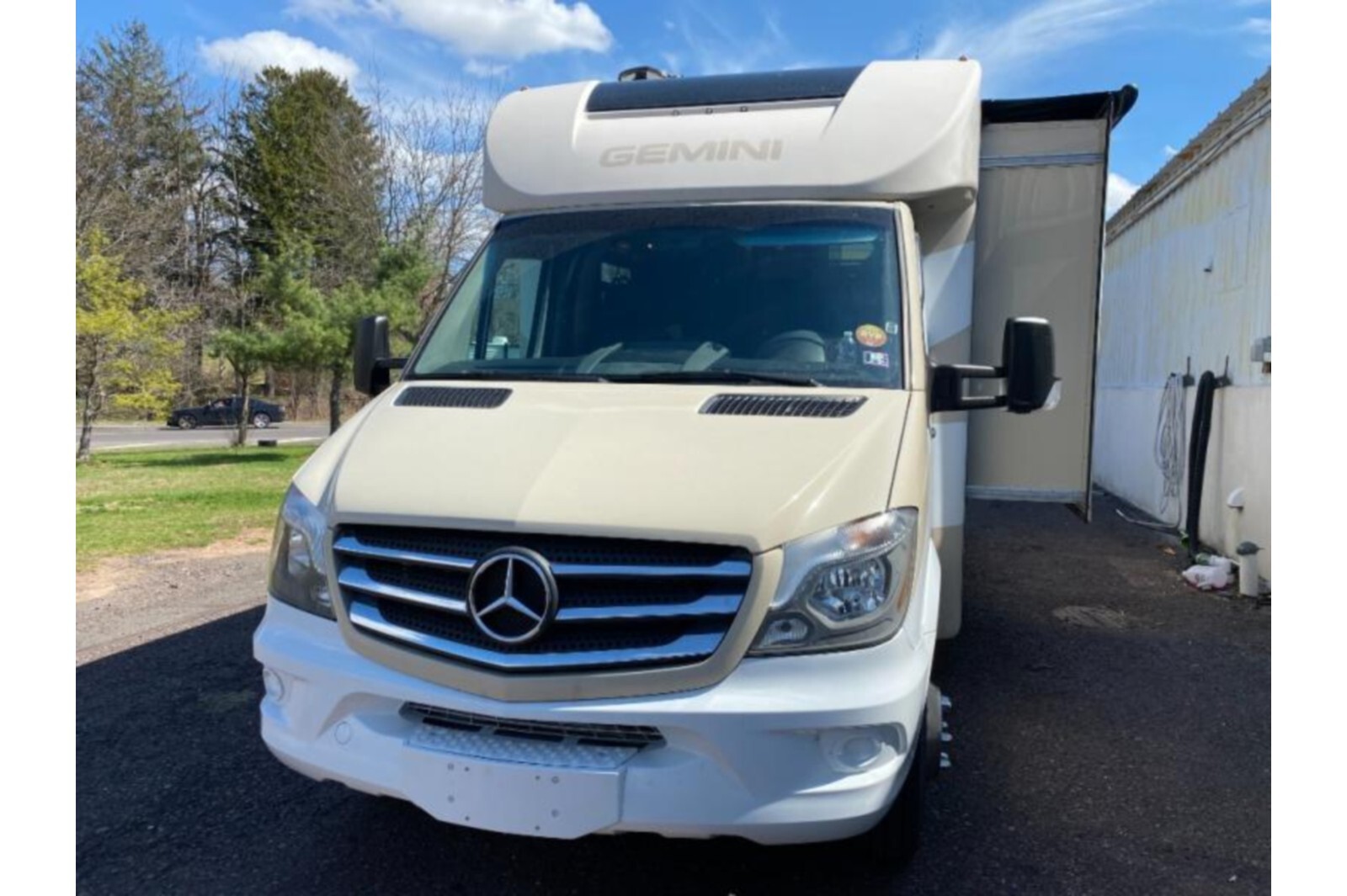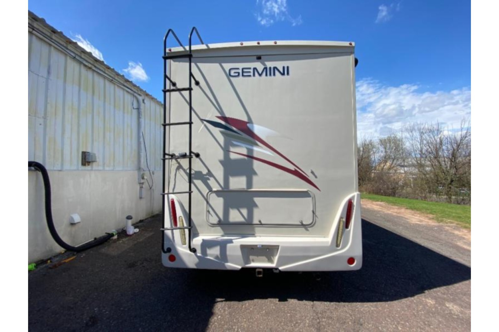 Experience comfortable and stylish travel with this 2019 Thor Motor Coach Gemini 24LP Class C diesel motorhome. With 24,118 miles, this well-maintained coach features a single slide-out, two twin beds that convert into a king-size bed, and a 58" sofa bed, comfortably sleeping up to 4. The spacious interior is brightened by a large skylight above the cab and modern LED lighting throughout. The full bathroom includes a neo-angled 27" x 27" shower, while the kitchen is equipped with a 2-burner cooktop and convection microwave for easy meal preparation. Enjoy outdoor entertainment, a power patio awning with integrated LED lights, and ample storage with Rotocast compartments. With a GVWR of 11,030 lbs, Vacu-Bond laminated construction, and a diesel engine, this 26-foot motorhome is perfect for your next adventure.