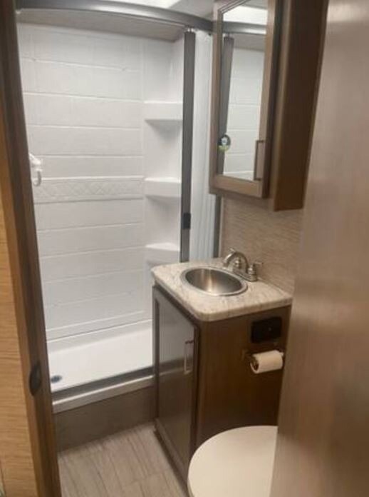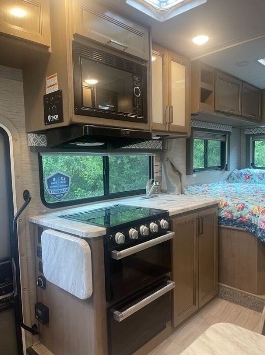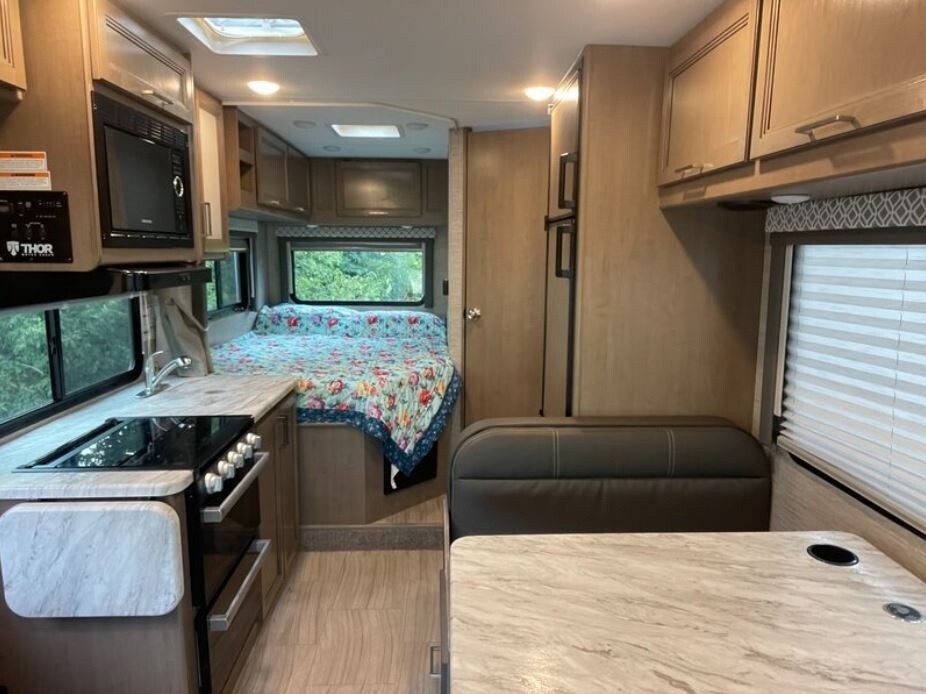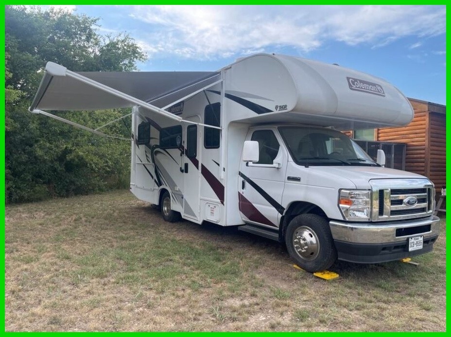 2022 Thor Motor Coach Coleman 23CM Class C Motorhome This 2022 Thor Motor Coach Coleman 23CM is a lightly used, non-smoking and pet-free Class C motorhome in excellent condition, powered by a Ford Godzilla E350 V8 engine capable of towing up to 8,500 lbs and equipped with an Onan generator. Constructed with fiberglass and used only twice, it shows no damage inside or out, with all vehicle maintenance up to date (warranty not included). The dining area includes a 3-burner gas stove with cooktop cover, oven, microwave, refrigerator/freezer, and kitchen sink. Living comforts feature A/C, central heat, a full bathroom, queen bed, cab-over bed, dinette sleeper, vinyl flooring, skylights, interior lighting, stereo system, TV, Bluetooth,