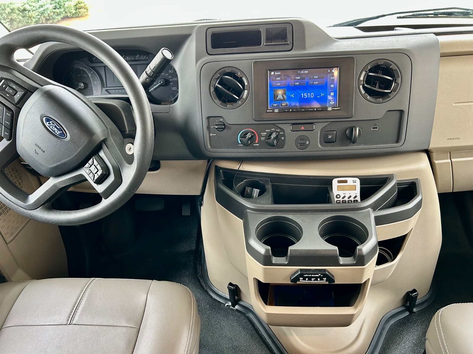 CHASSIS: - Ford E350 - 7.3L V8, 325 HP, 450 ft-lb torque - Sirius XM Tuner and antenna - Touchscreen dash radio, Apple Car Play, Android Auto - Keyless entry - Steering wheel audio/camera control - Heated exterior mirrors w/side cameras - Stainless steel wheel liners - 4KW gas generator