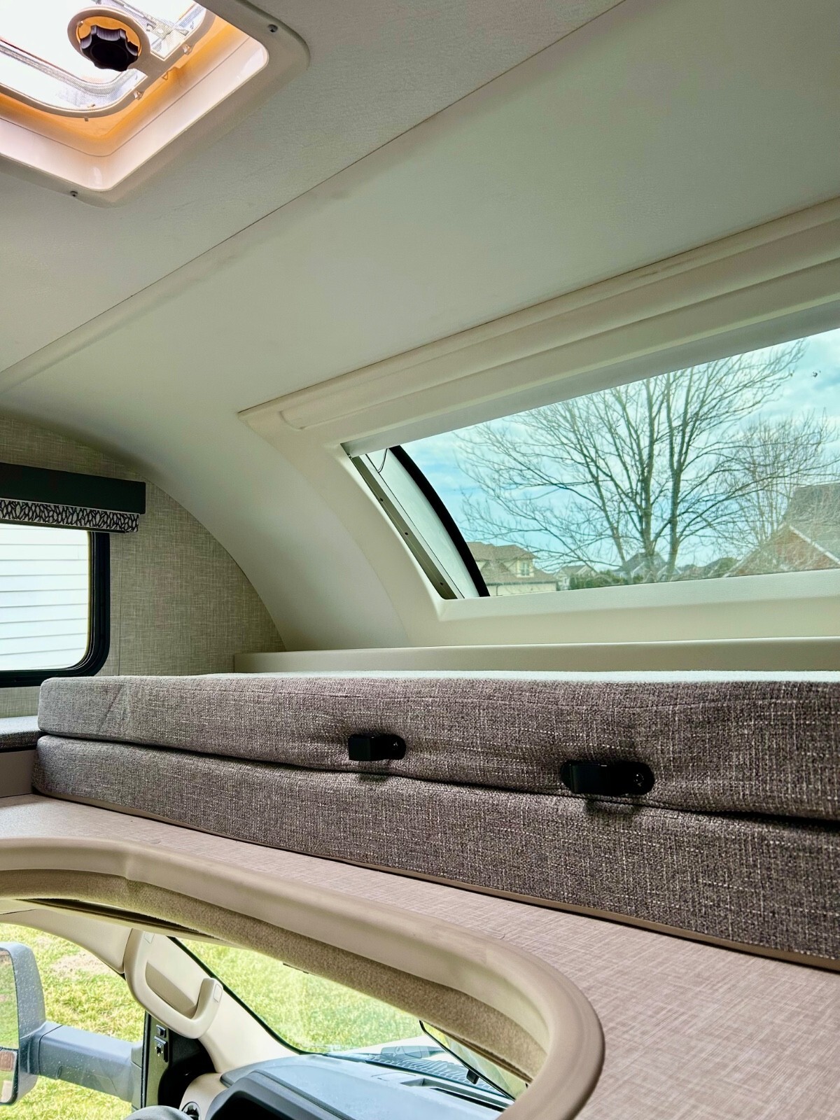 We added a FROLI sleep system under the primary bed which made it oh so comfortable, and eliminated any mold/mildew concerns. We replaced the original coach batteries with two premium AGM deep cycle batteries, which eliminated maintenance, and extended off-grid time. This summer we also replaced the cab battery with a Diehard Platinum AGM battery.