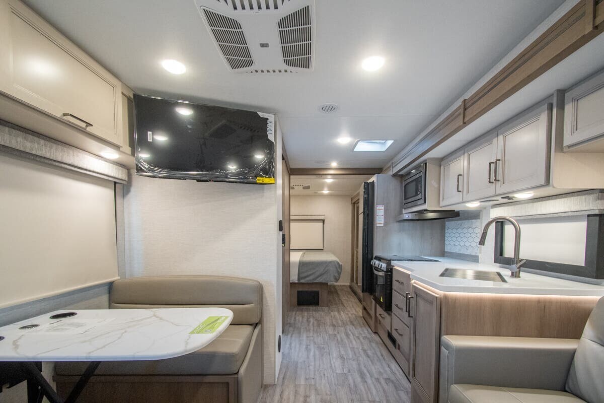 Measuring 30 feet 9 inches in length, this motorhome offers a spacious interior with a full-wall slide-out that expands the living area. The 29D comfortably sleeps up to six people, featuring a king-size bed in the rear private bedroom, a power drop-down hide-away overhead bunk above the cab, and a jack-knife sofa and Dream Dinette that convert into additional sleeping spaces.