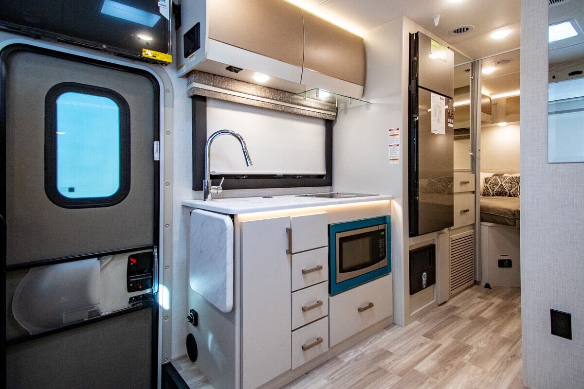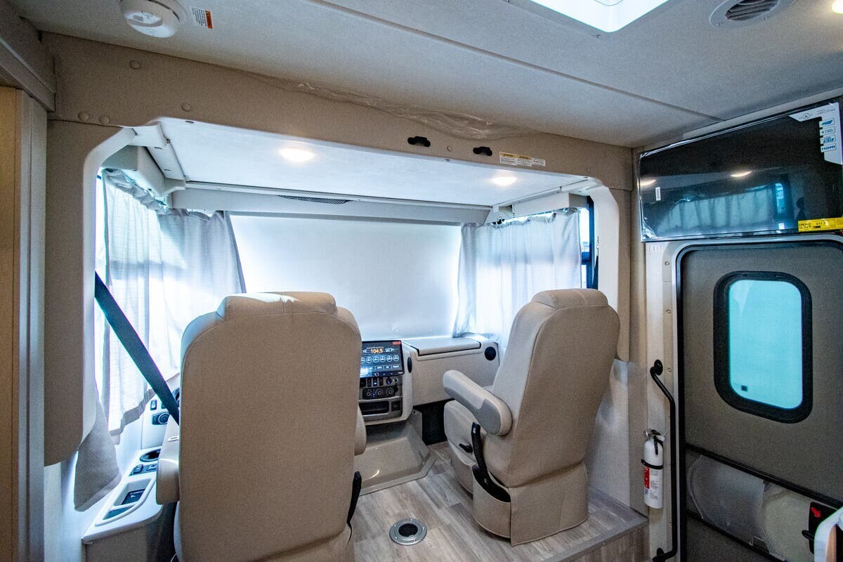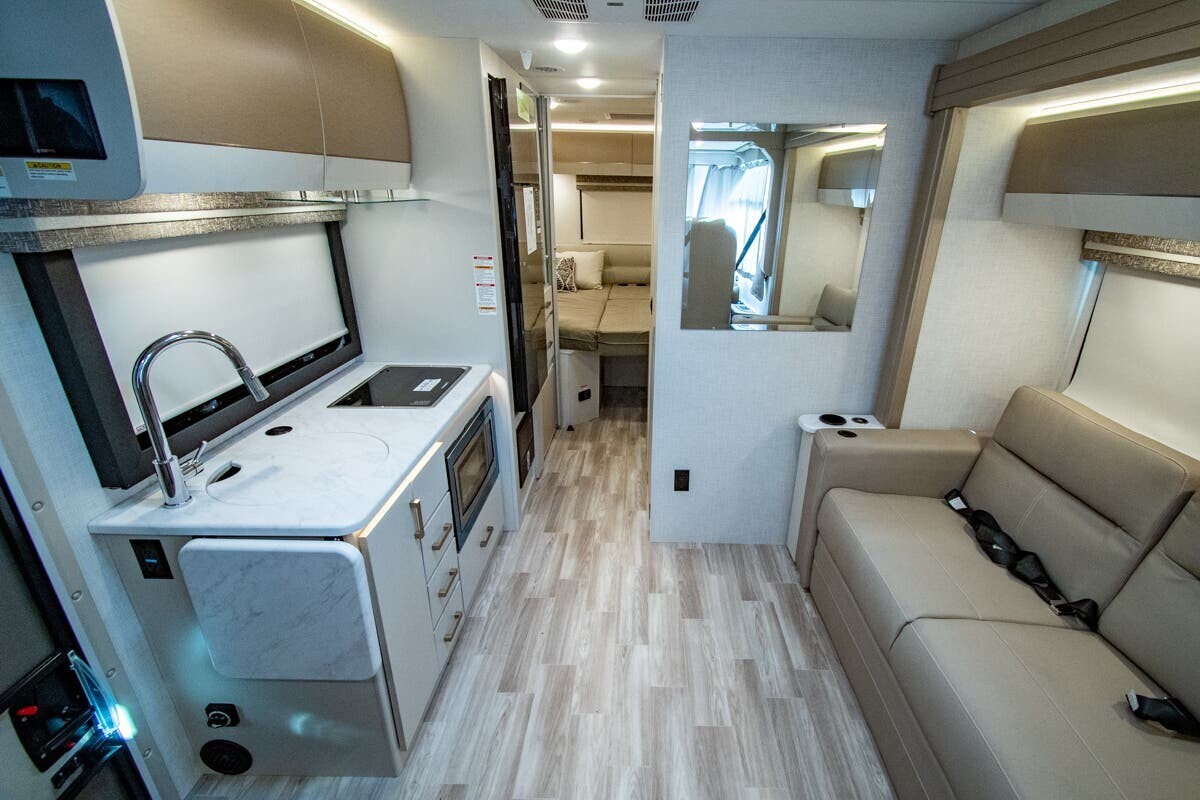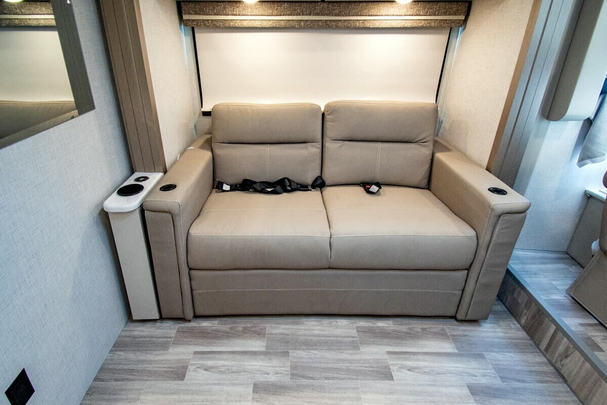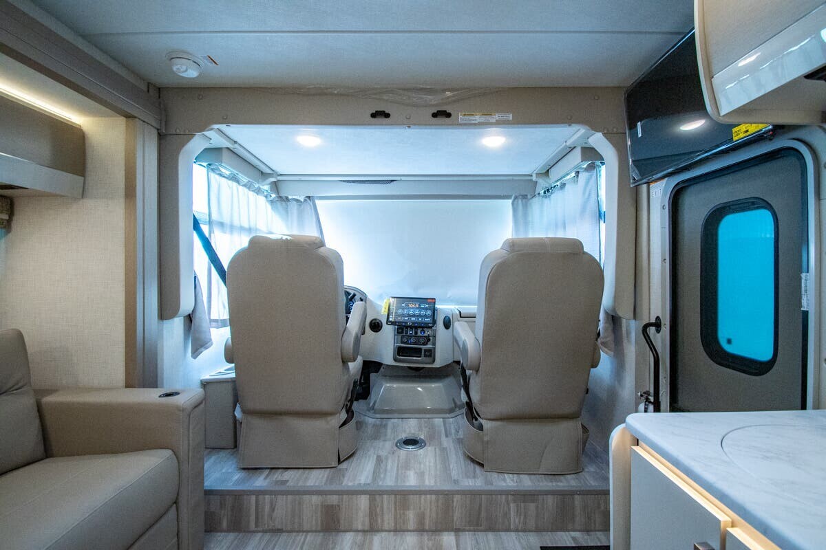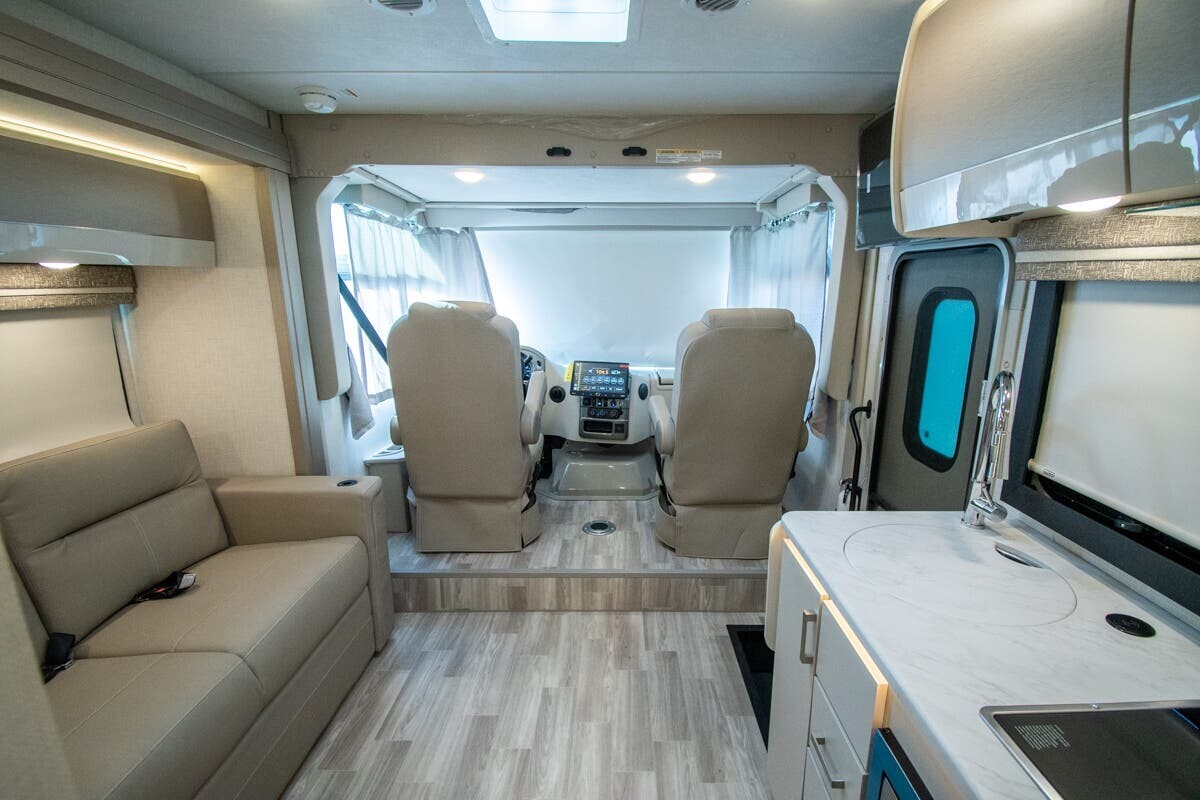 Inside the Thor Axis, you'll find a well-thought-out floor plan that maximizes space without compromising on comfort. The living area includes a cozy sofa and a removable pedestal table, perfect for meals or relaxing. The swiveling captain's chairs add an extra seating option for gatherings with friends or family. The interior has modern finishes, with LED lighting throughout, adding a bright and clean look to your home on