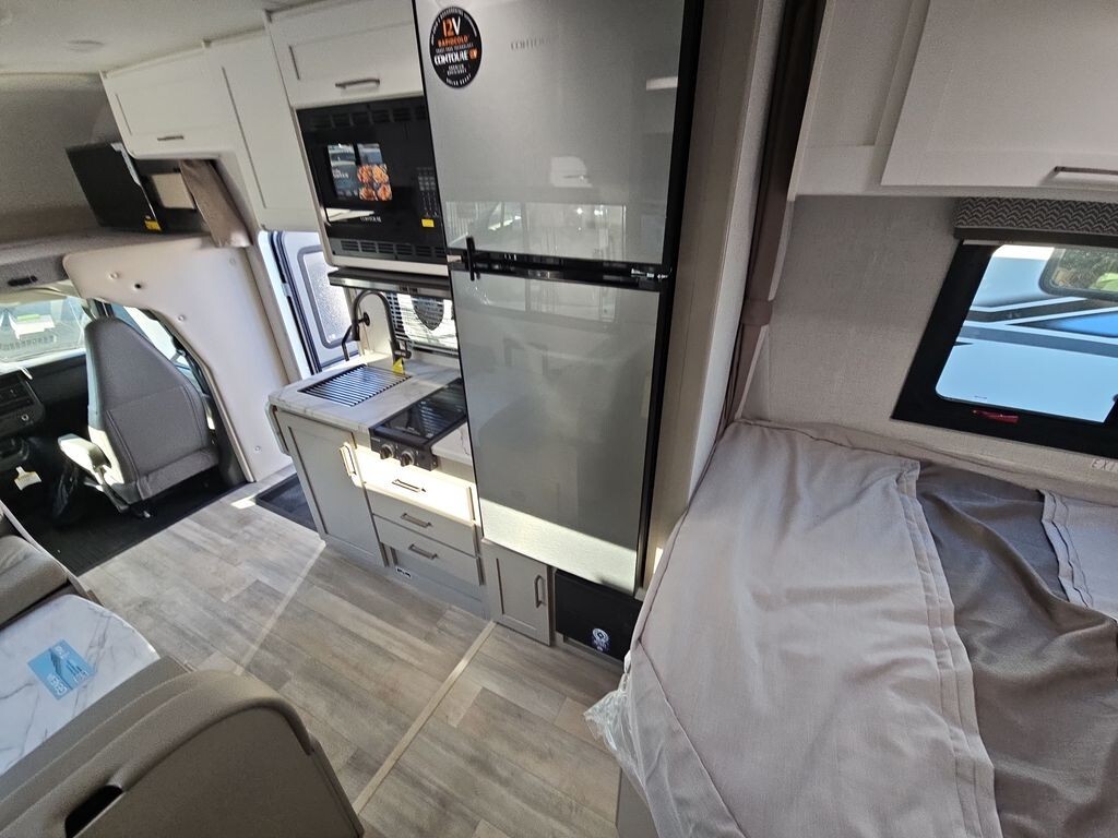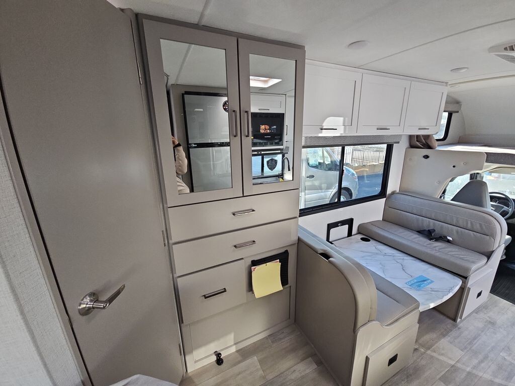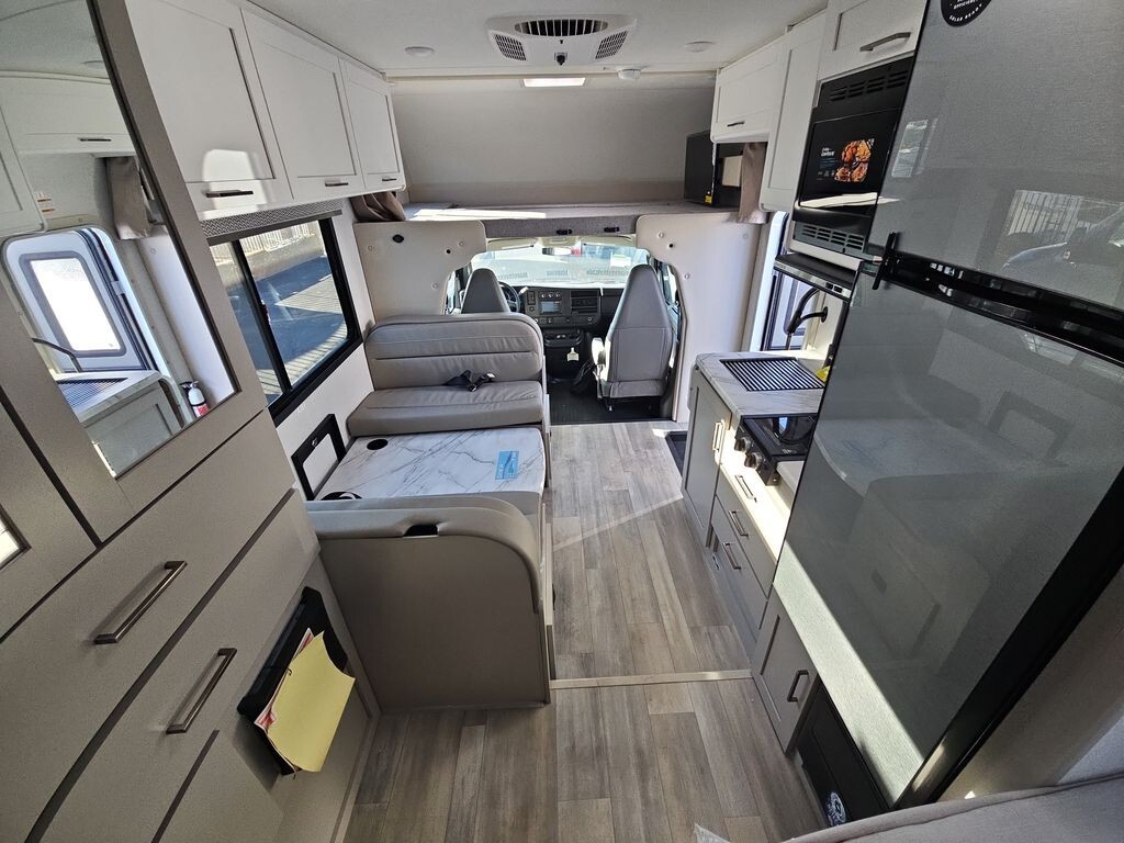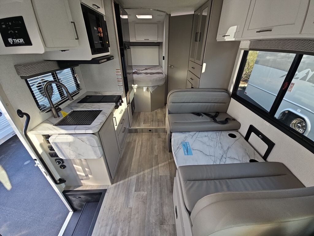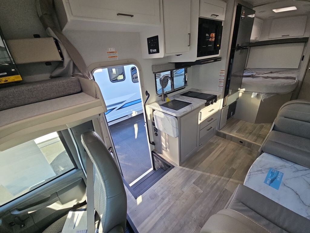 The 2025 Thor Motor Coach Geneva 21VT - Chevy is a compact and fully equipped Class C motorhome designed for travelers seeking comfort and convenience. Measuring 24 feet 7 inches in length, it offers easy maneuverability on the road while providing ample interior space. Built on a reliable Chevrolet chassis and powered by a 6.6L V8 engine with 401 horsepower, this RV ensures a smooth and dependable driving experience.Inside, the 21VT - Chevy features a thoughtfully designed layout to maximize comfort and functionality. The living area includes a 76-inch Dream Dinette that converts into additional sleeping space, accommodating guests or family members. An overhead bunk above the cab offers another sleeping option, ensuring ample room for everyone.The kitchen is fully equipped with a two-burner cooktop, convection microwave with air fryer, 12V refrigerator, and a stainless steel sink, allowing for easy meal preparation. Storage