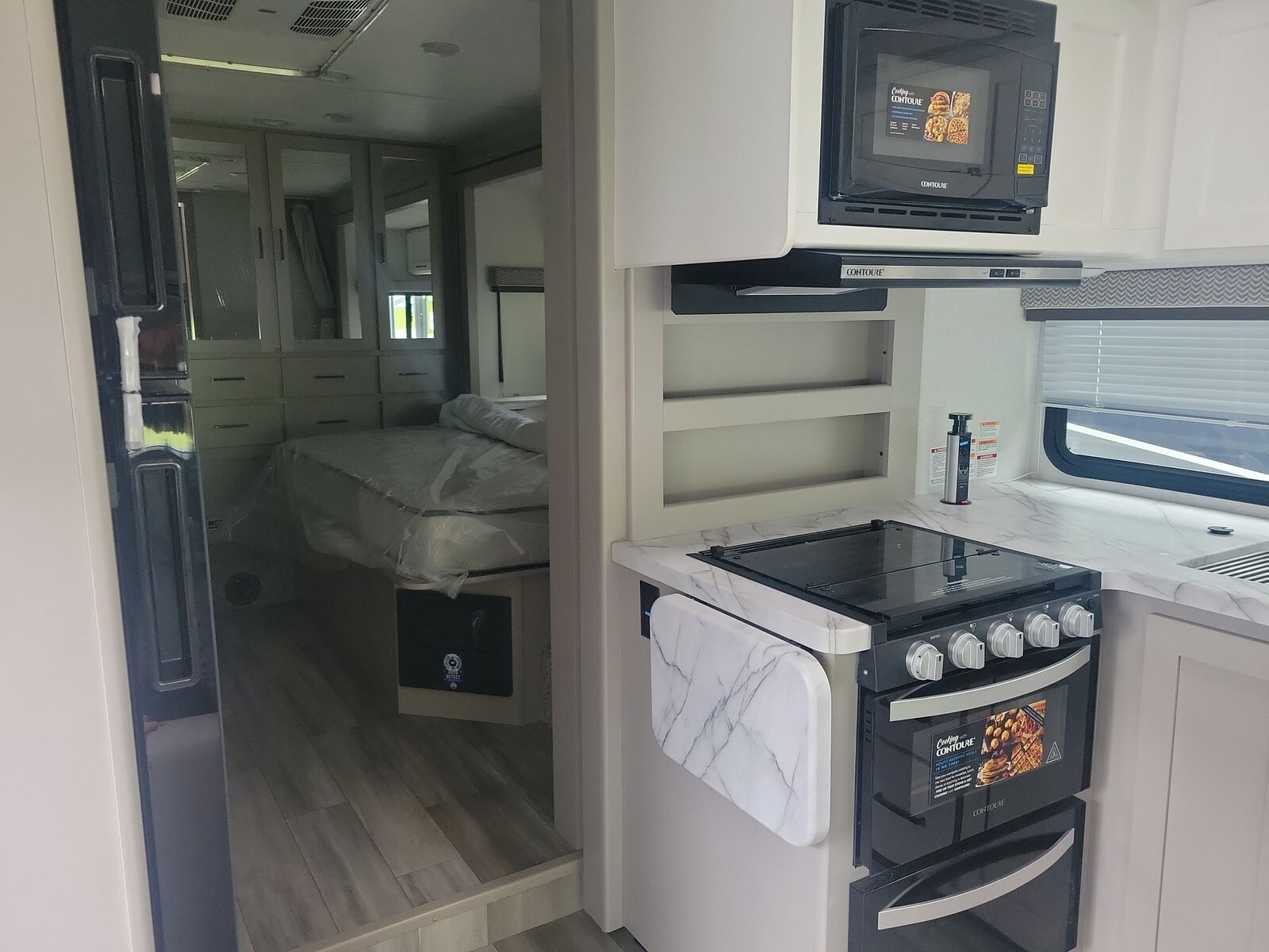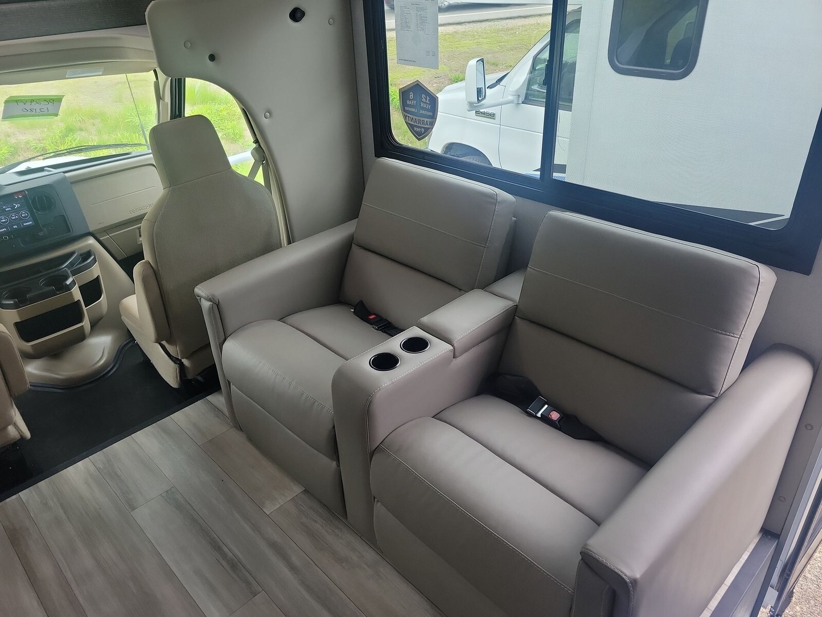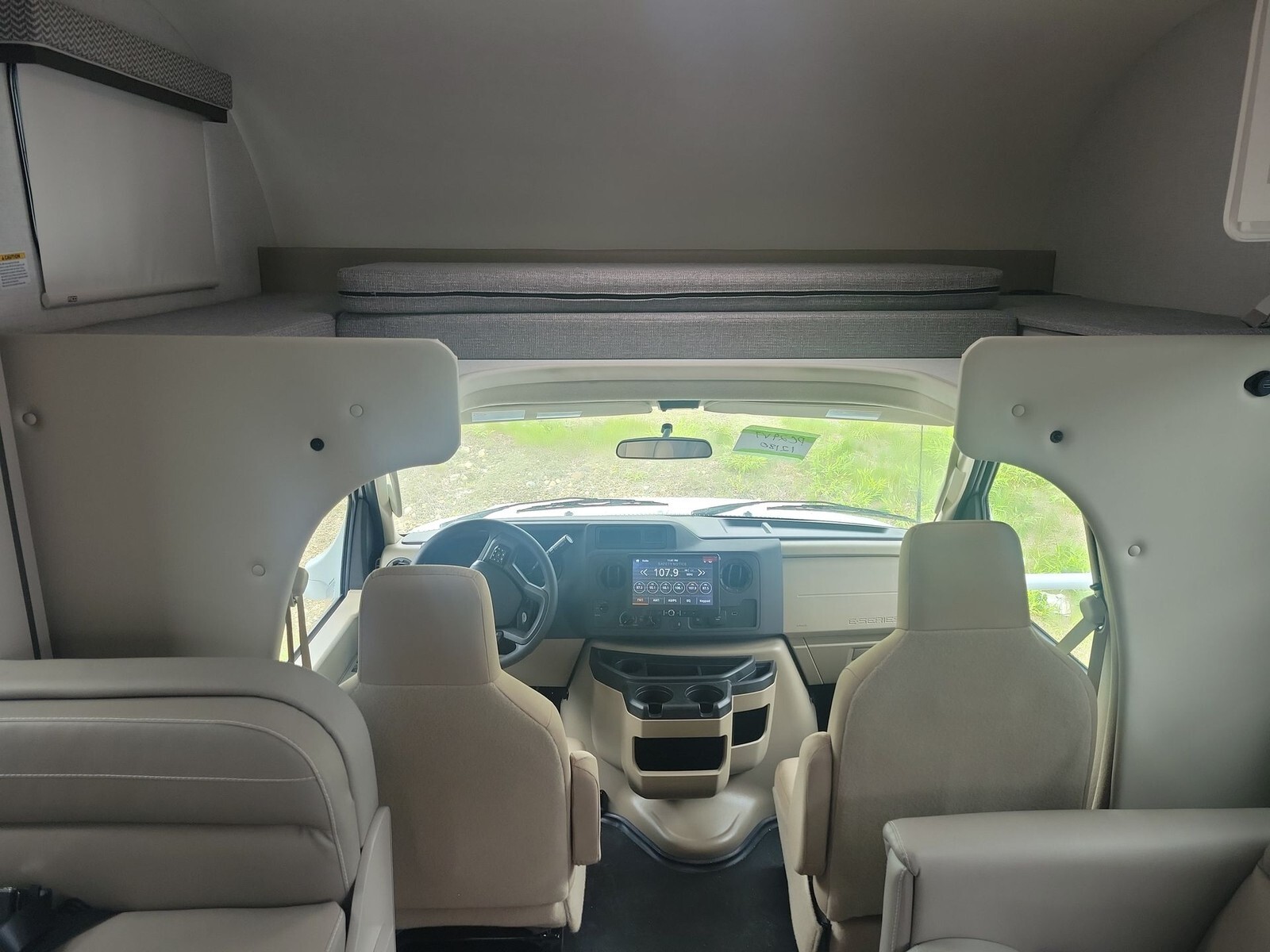 Inside, the 29VT has a smart layout that makes the most of the living area. The living space includes comfortable theater seating and a 70-inch Dream Dinette that can convert into a bed for extra sleeping space. Above the cab, there's a 52" x 96" bunk, ideal for kids or guests.