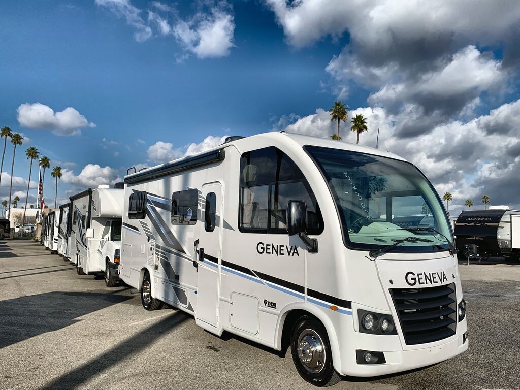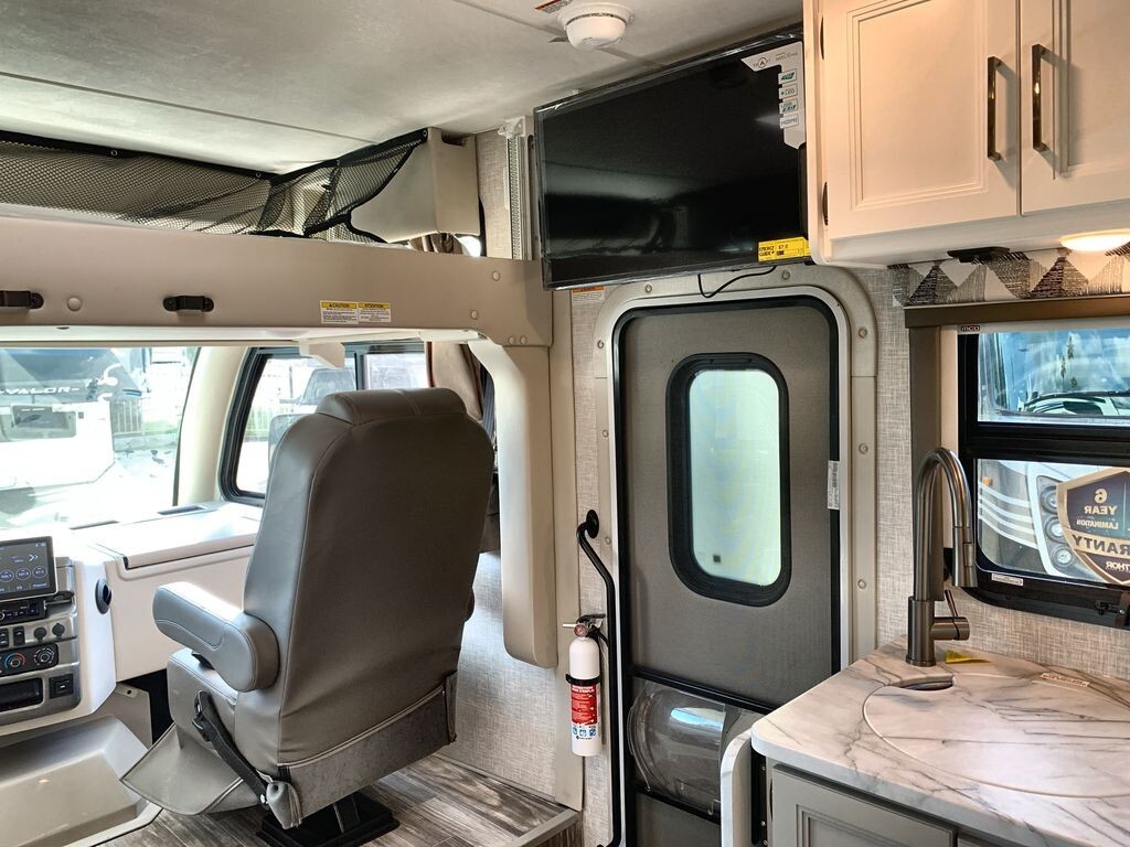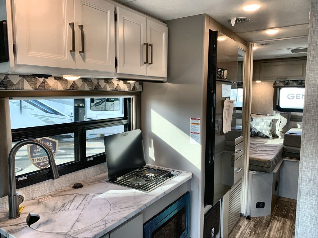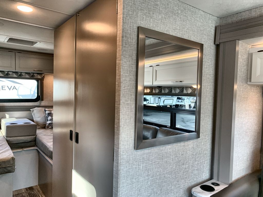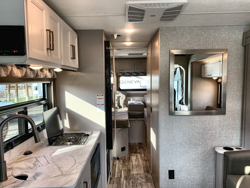 The Thor Motor Coach Geneva 24VS is a Class A motorhome designed to provide comfort and convenience for travelers. Built on a durable Ford E-Series chassis and powered by a 7.3L V8 engine, the 24VS offers reliable performance for both short trips and long journeys.Inside, the 24VS features a thoughtfully designed living area with a 66-inch sofa bed slide-out, providing comfortable seating during the day and converting into a sleeping space at night. The rear of the motorhome includes twin beds that can easily transform into a king-size bed, offering flexible sleeping arrangements. A 32-inch LED Smart TV in the bedroom ensures entertainment is always available.The kitchen is equipped with modern appliances, including a two-burner gas cooktop, convection microwave with air fryer capabilities, and a 12V DC double-door refrigerator. A spacious pantry provides ample storage for your culinary essentials, making meal preparation on the
