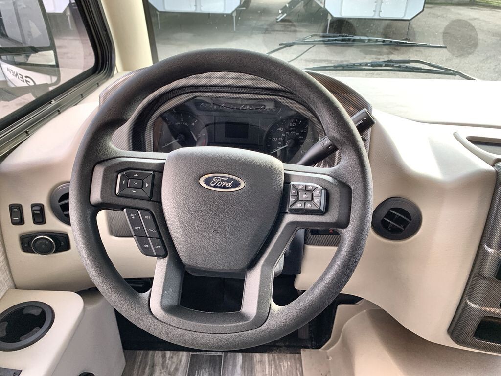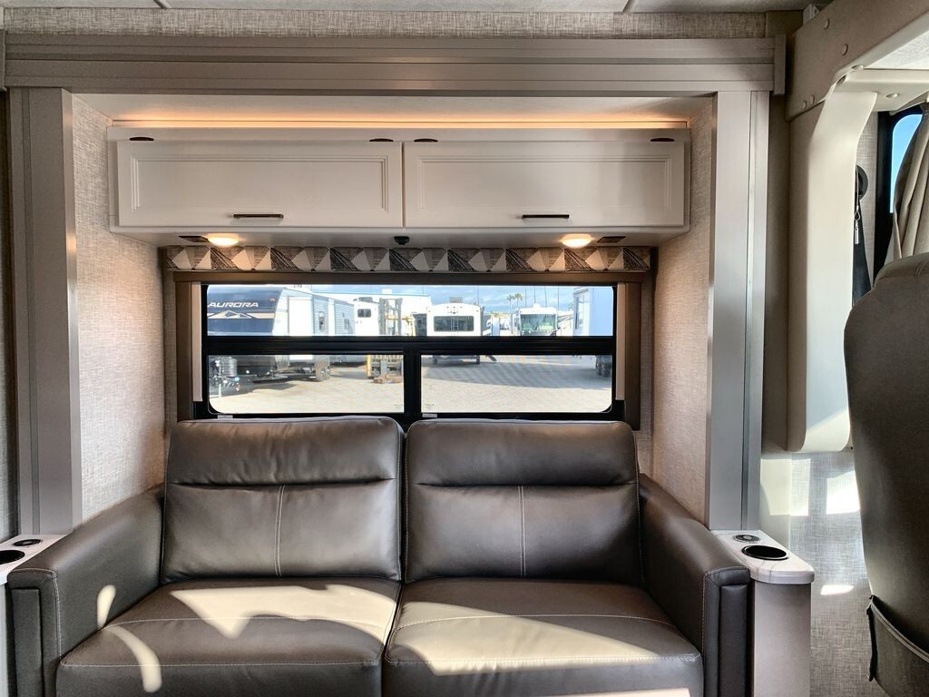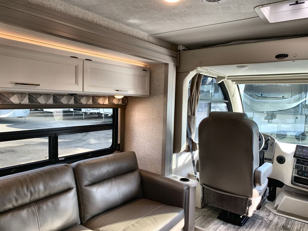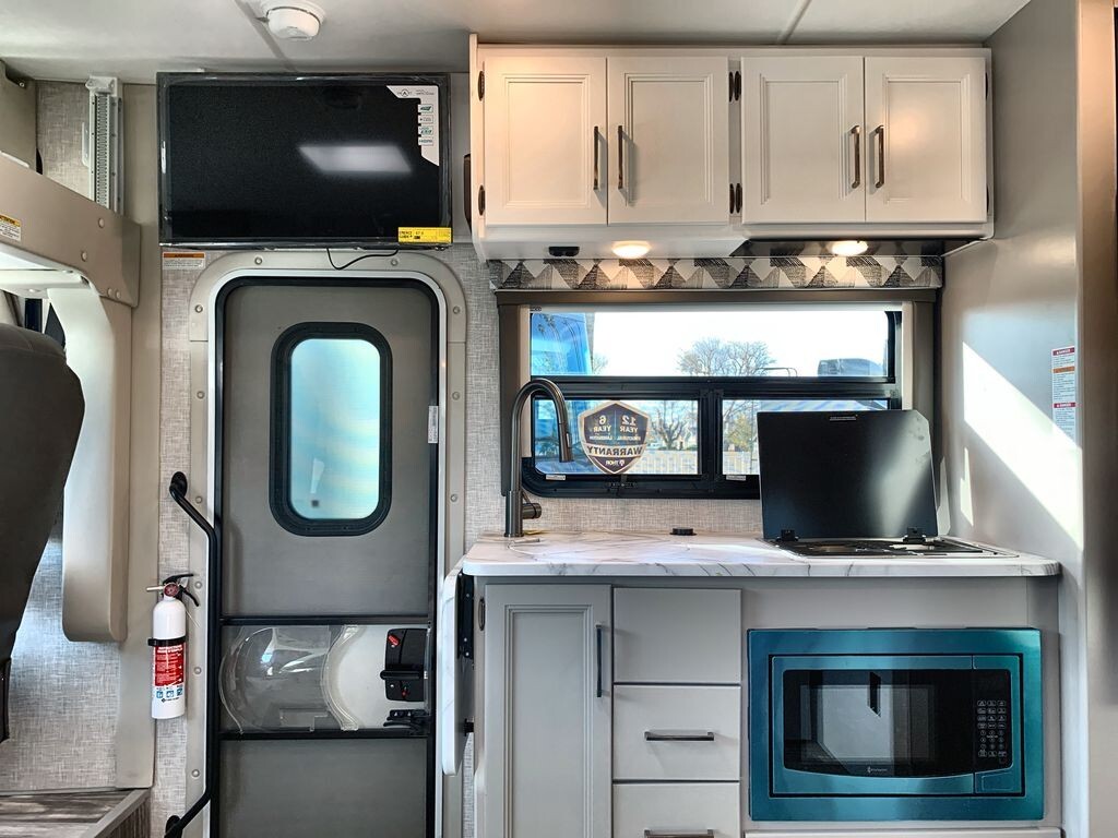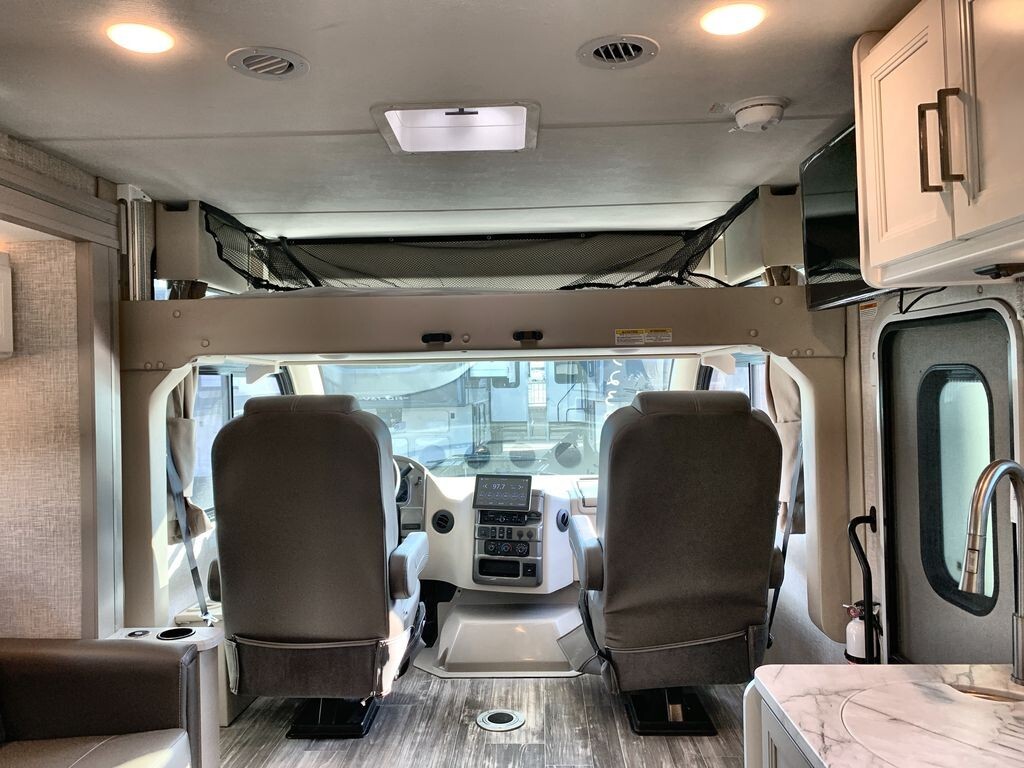The Thor Motor Coach Geneva 24VS is a Class A motorhome designed to provide comfort and convenience for travelers. Built on a durable Ford E-Series chassis and powered by a 7.3L V8 engine, the 24VS offers reliable performance for both short trips and long journeys.Inside, the 24VS features a thoughtfully designed living area with a 66-inch sofa bed slide-out, providing comfortable seating during the day and converting into a sleeping space at night. The rear of the motorhome includes twin beds that can easily transform into a king-size bed, offering flexible sleeping arrangements. A 32-inch LED Smart TV in the bedroom ensures entertainment is always available.The kitchen is equipped with modern appliances, including a two-burner gas cooktop, convection microwave with air fryer capabilities, and a 12V DC double-door refrigerator. A spacious pantry provides ample storage for your culinary essentials, making meal preparation on the