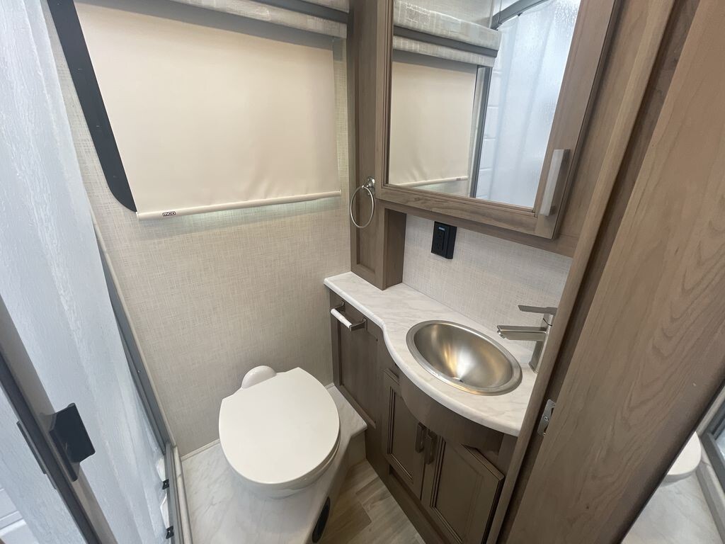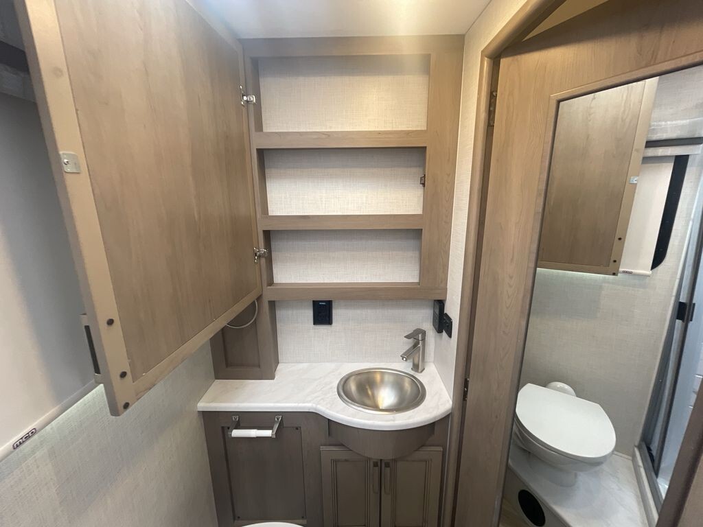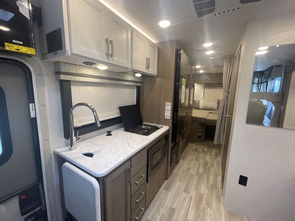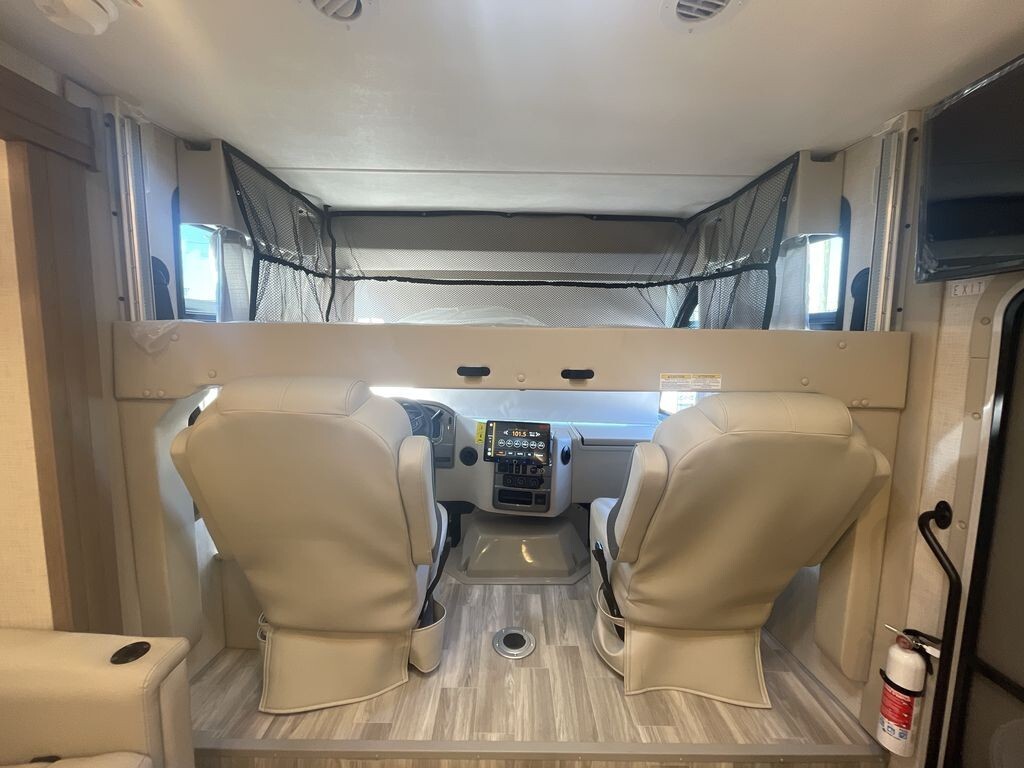 The 2025 Vegas 26.2 features an efficient and powerful drivetrain, ensuring a smooth ride whether you're navigating city streets or cruising along the highway. Built on a reliable Ford E-Series chassis and powered by a 7.3L V8 engine with 350 horsepower and 468 lb-ft of torque, this motorhome provides stability and durability, crucial for long journeys. The engine is designed to be fuel-efficient, offering excellent mileage to help you go further without frequent stops.