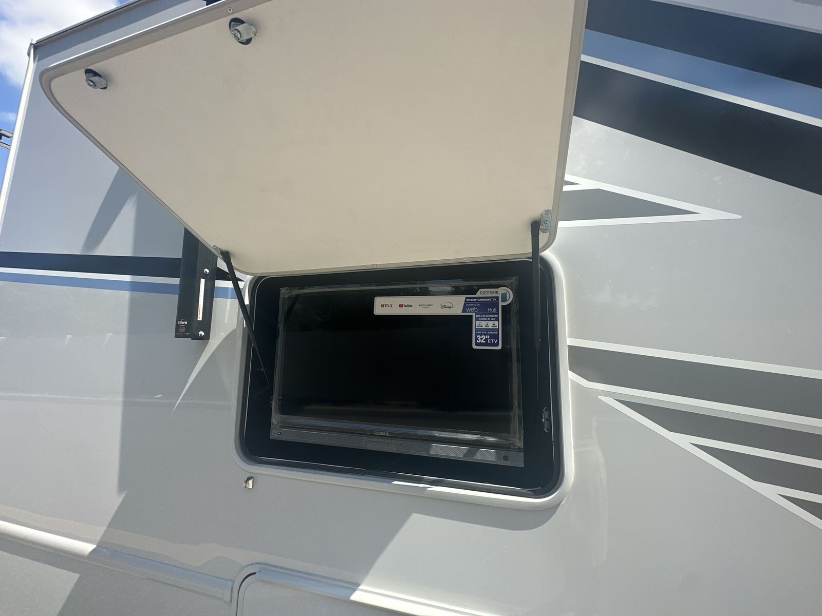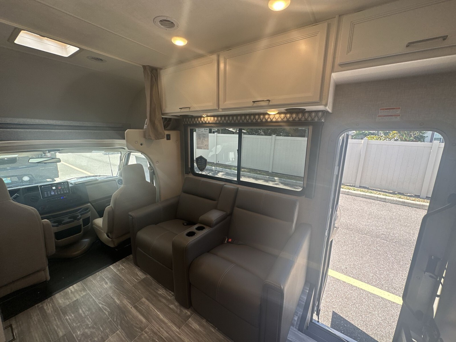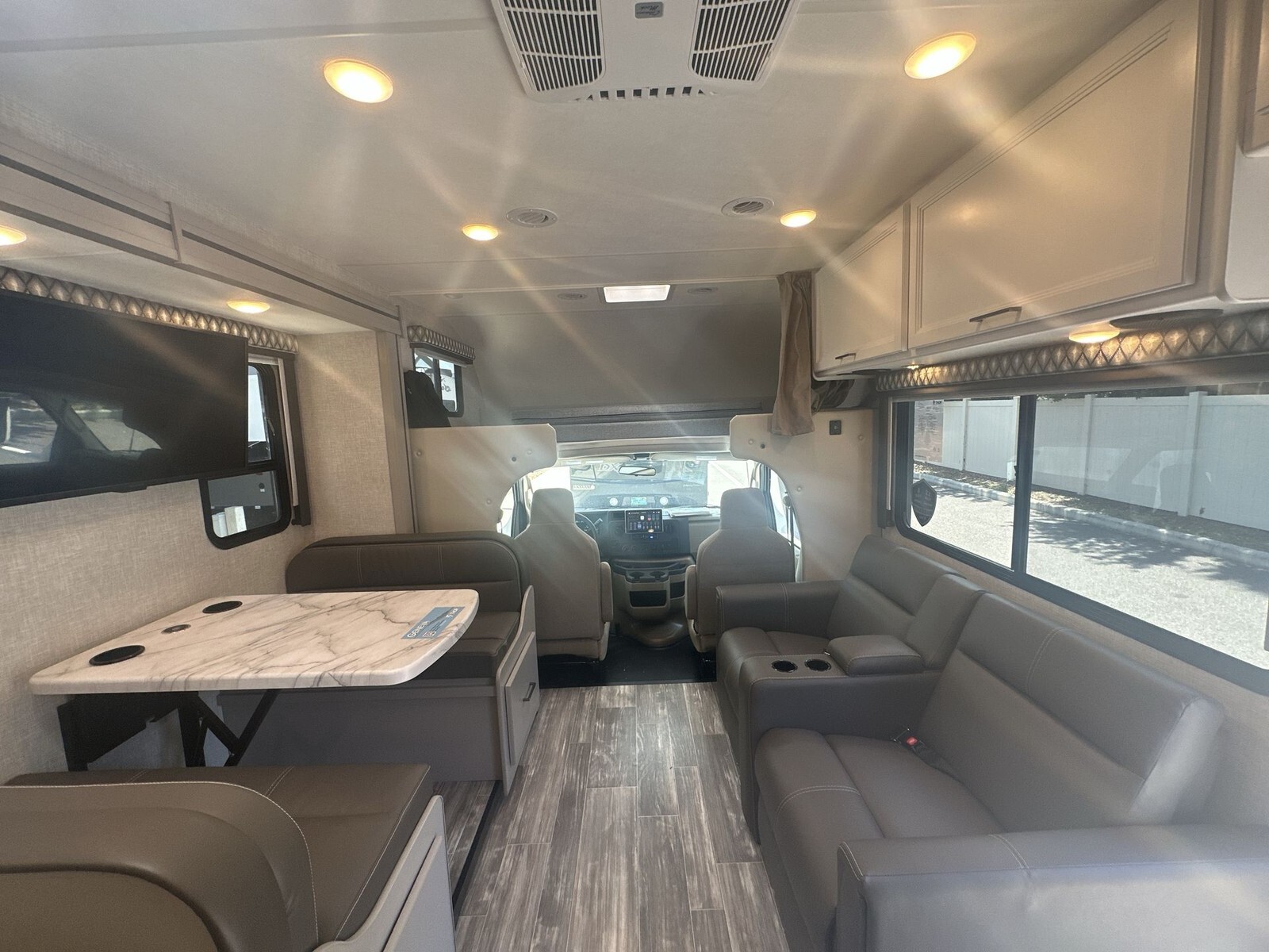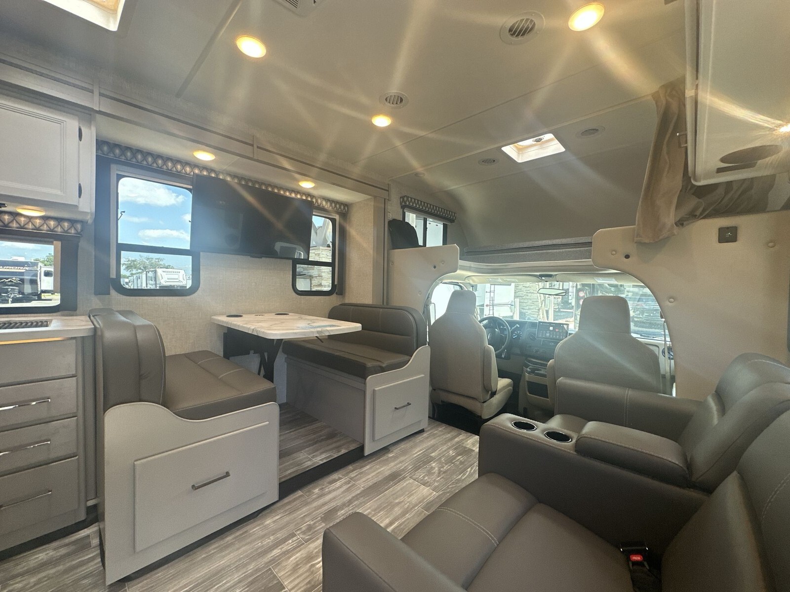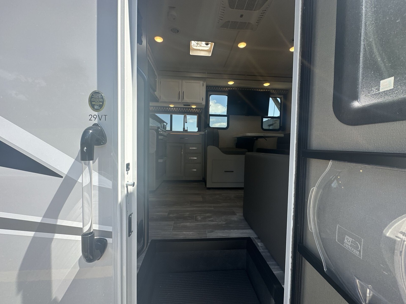 Inside, the 29VT has a smart layout that makes the most of the living area. The living space includes comfortable theater seating and a 70-inch Dream Dinette that can convert into a bed for extra sleeping space. Above the cab, there's a 52" x 96" bunk, ideal for kids or guests.